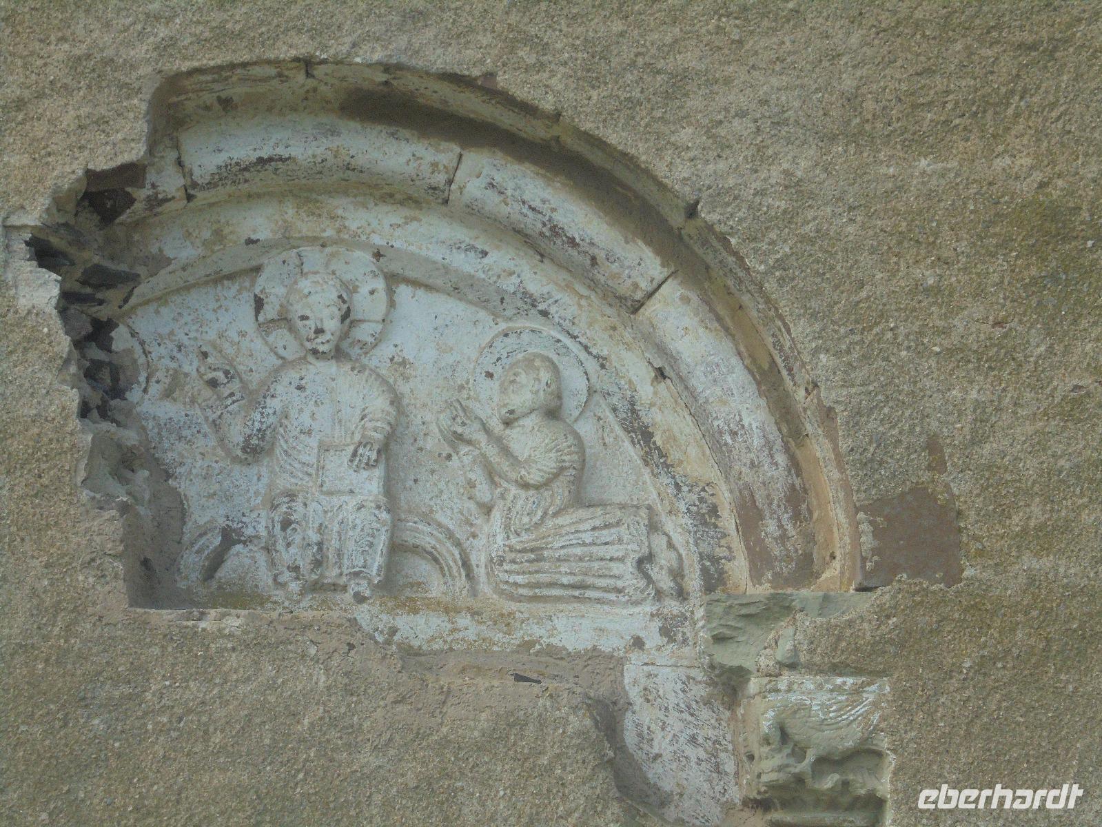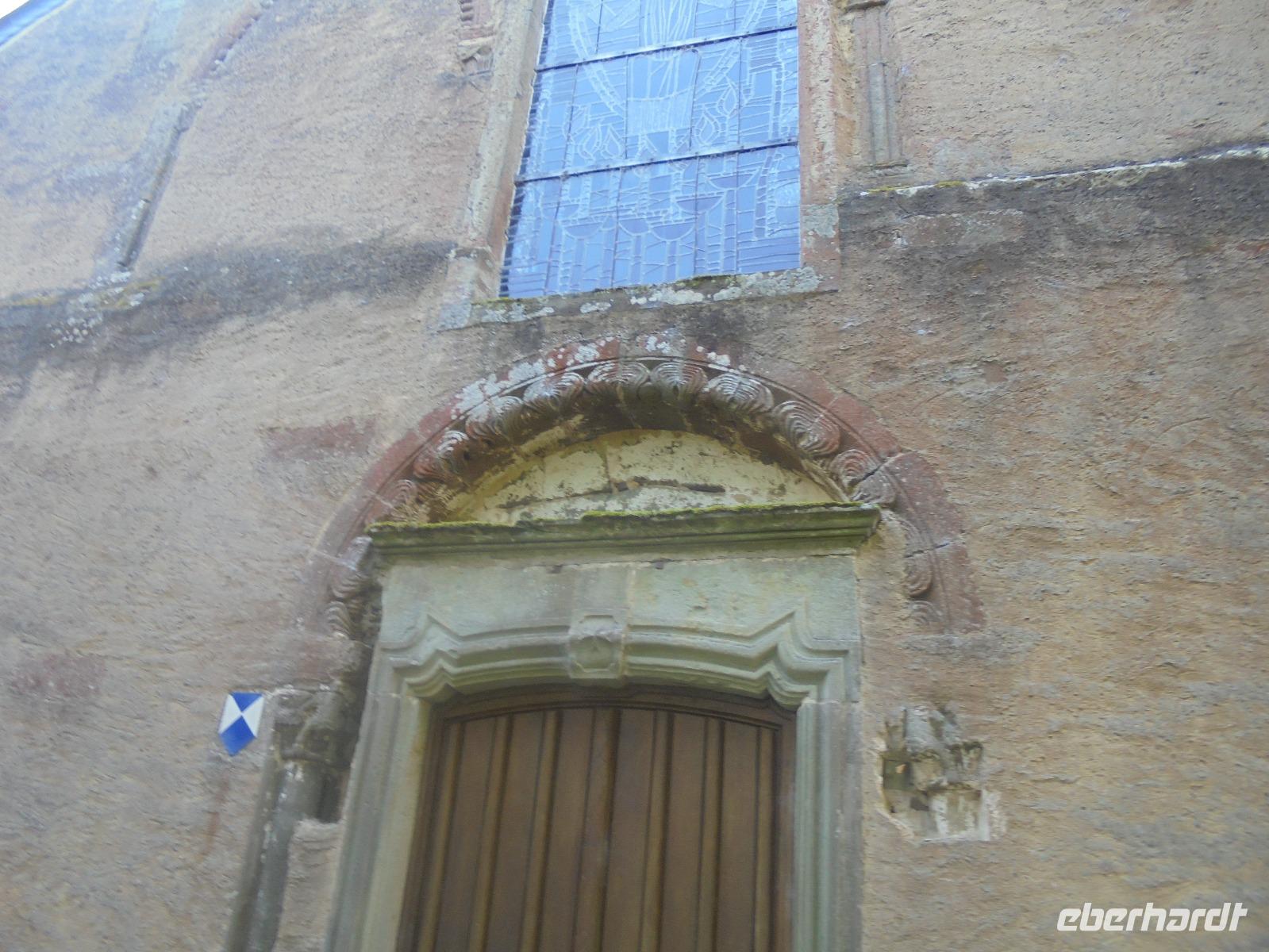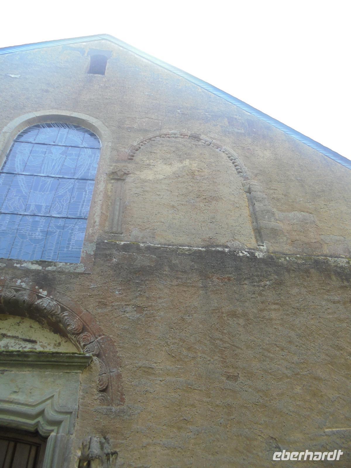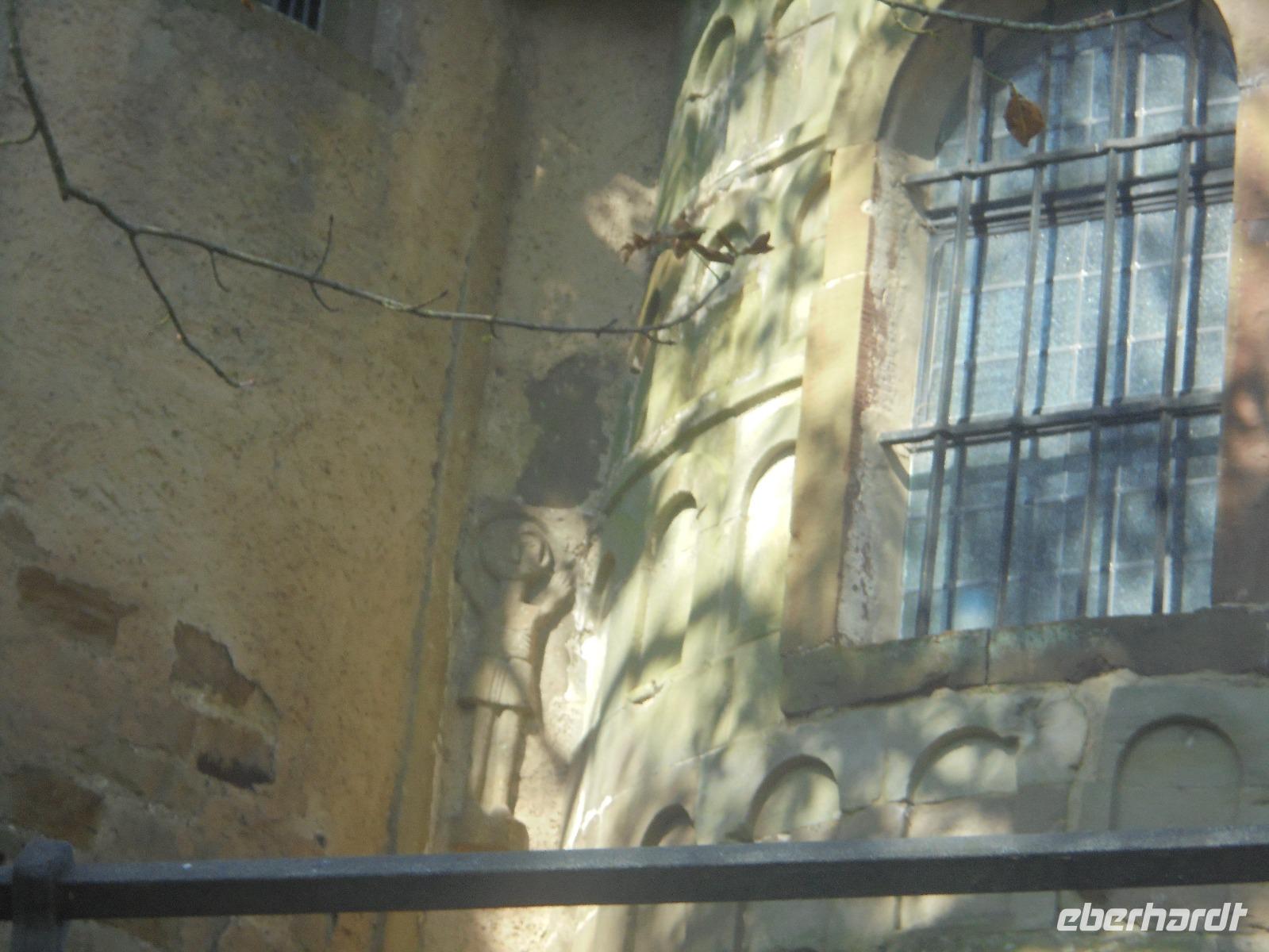 Nach dem Frühstück brachen wir auf in Richtung luxemburgischer Grenze. Auf der Hunsrückstraße und später durch die Südeifel fahrend, waren wir am späten Vormittag im kleinen Ort Roth, gelegen auf einer Anhöhe über dem Tal des malerischen Grenzflüßchens Our. Nur wenige hundert Meter entfernt von der Grenze zu Luxemburg und dem Burgort Vianden finden sich die Reste einer ehemaligen Templerkomturei und einer Templerkapelle. Anfang des 13. Jh. schenkte der mächtige Graf von Vianden den Templern hier Ländereien und es entstand eine bedeutende Kommende, eine Niederlassung des Ordens mit Befestigung und Kirche. Heute sind als - inzwischen mehrfach umgebaute - Reste das Schloss und die Kapelle zu sehen. Interessant ist insbesondere Letztere, denn trotz späterer Erweiterungen und Anbauten sind einige der ursprünglichen Verzierungen erhalten. Teilweise noch vor der Schenkung an die Templer erreichtet und in der Kommendezeit erweitert, lässt sich eine für die Romanik sonst fast beispiellose Apsisverzierung durch Blendnischen an der nördlichen Seitenapsis erkennen. Im schmalen Architekturstreifen zwischen den Apsiden ist der berühmte „Mann von Roth" zu finden, ein sehr altes Relief eines betenden (?) Mannes mit erhobenen Händen und gegürtetem Gewand. Mache Interpretationen sehen in ihm eine Christusfigur, andere einen verehrenden Templer...