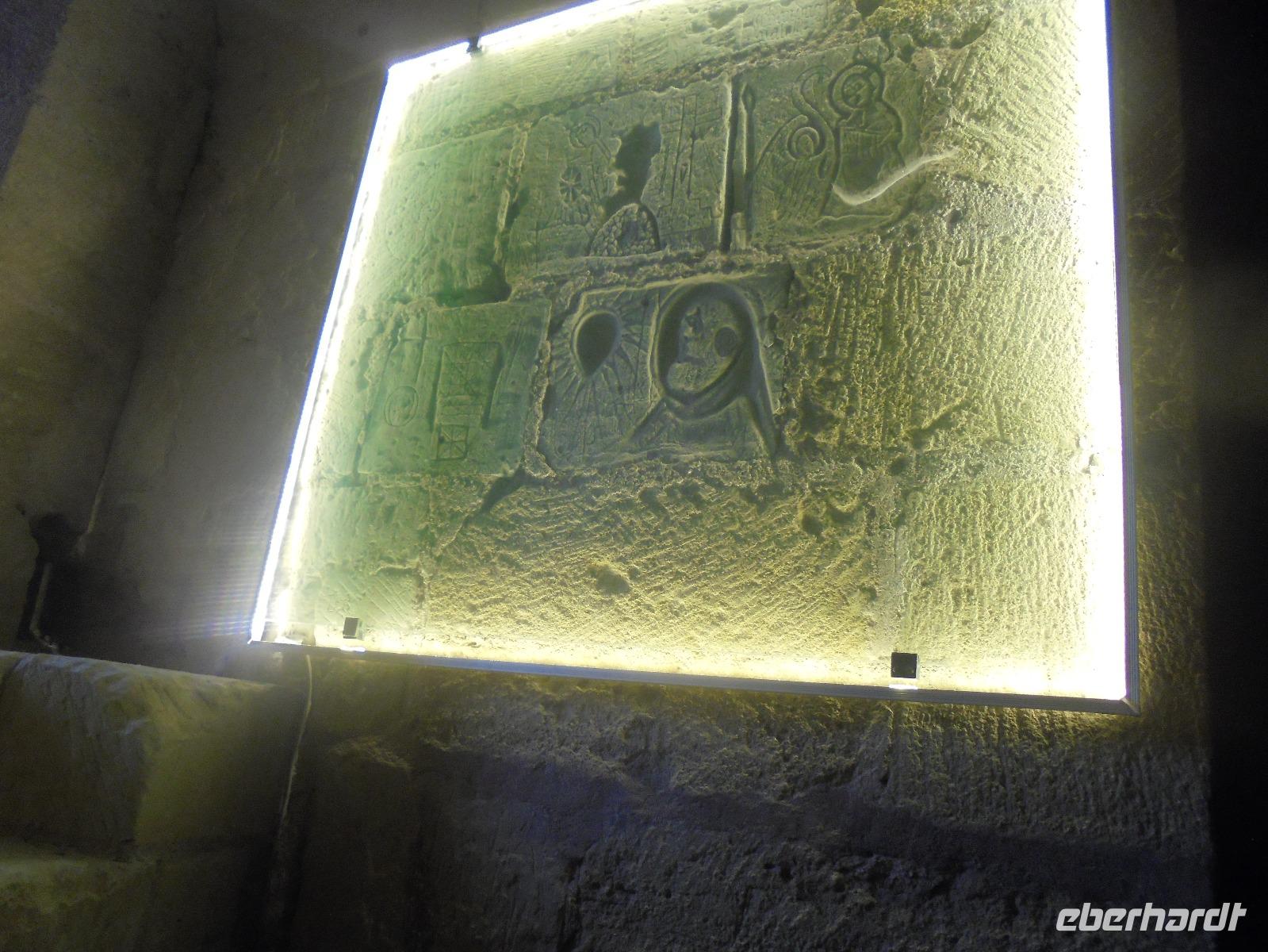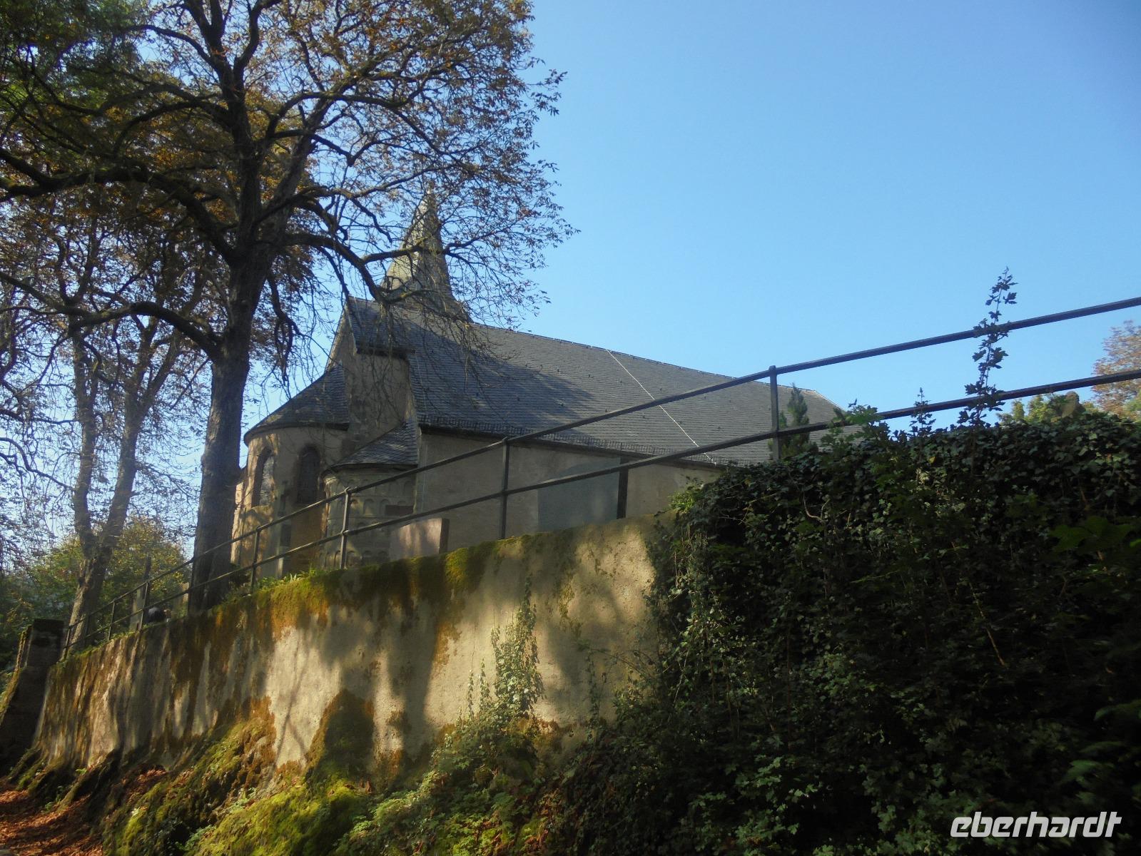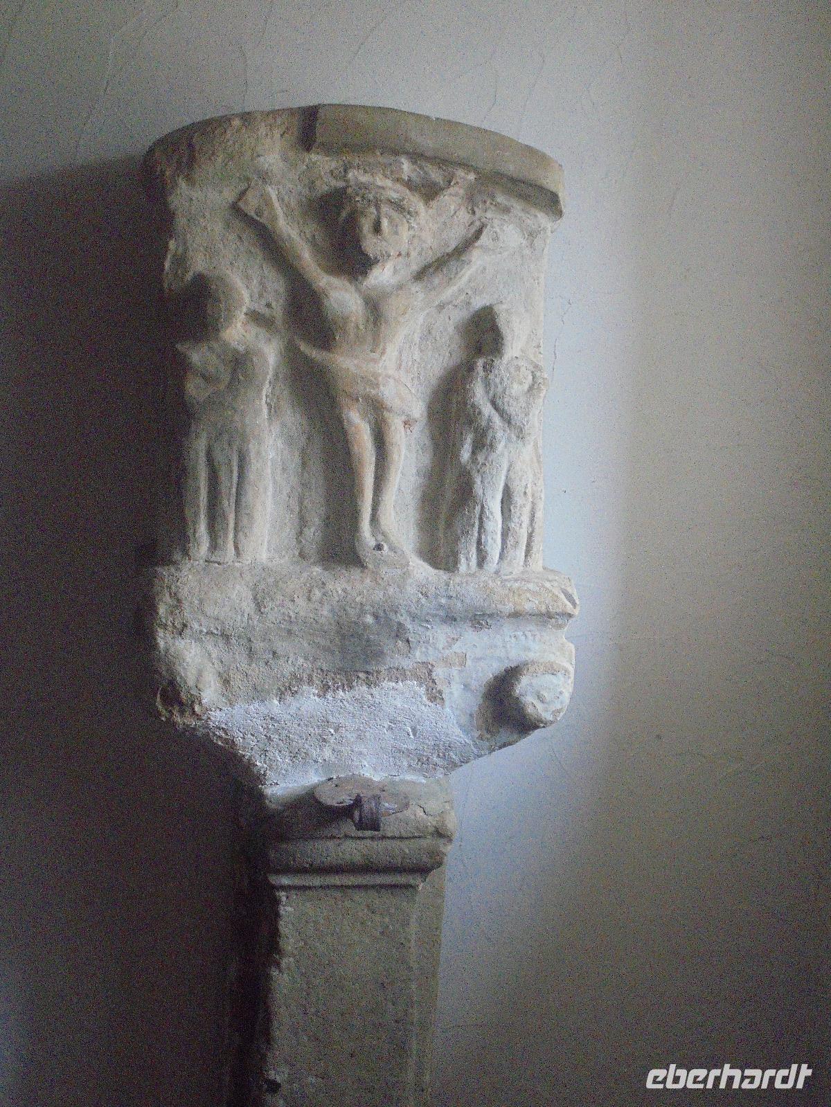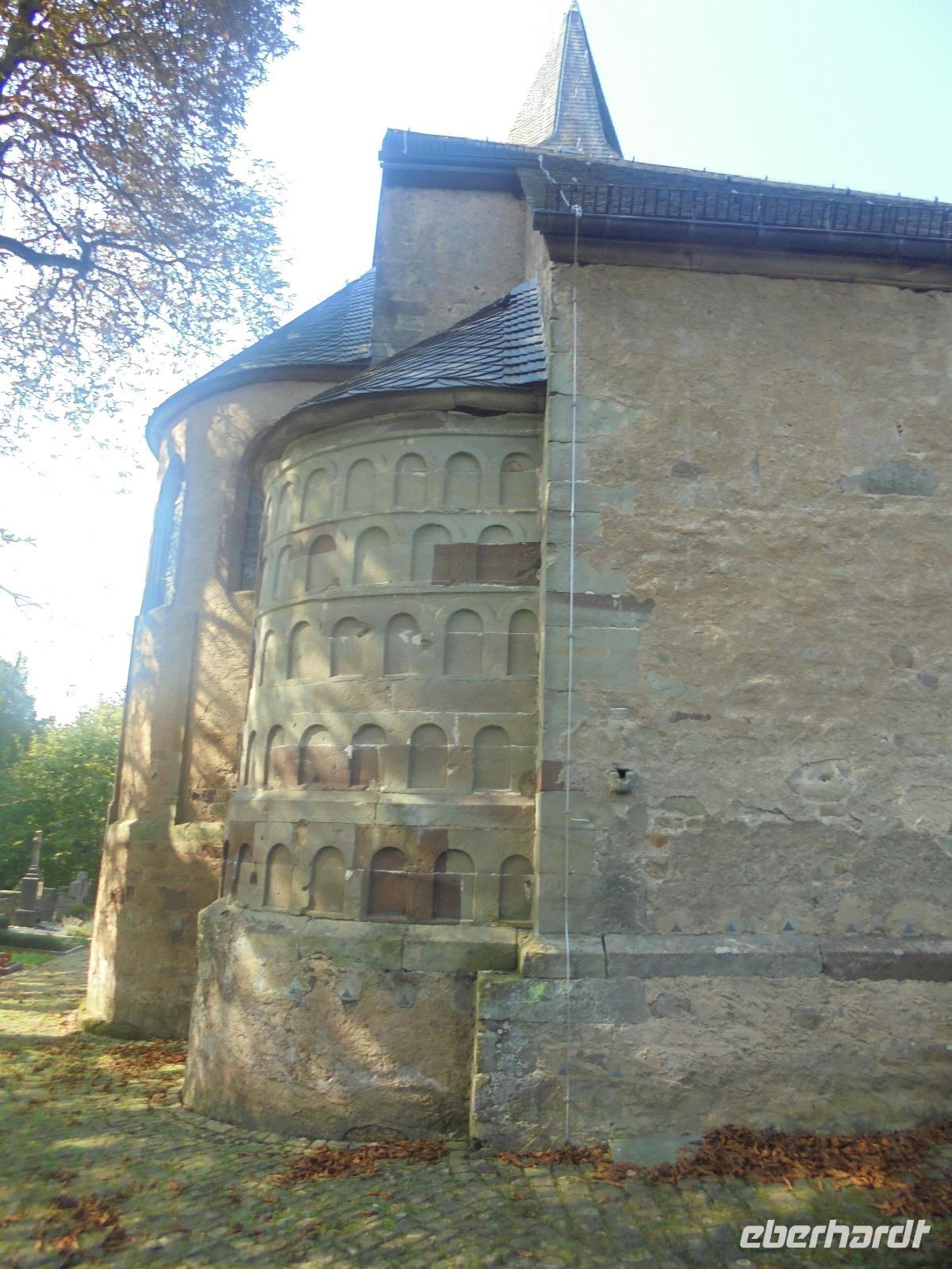 Nach dem Frühstück brachen wir auf in Richtung luxemburgischer Grenze. Auf der Hunsrückstraße und später durch die Südeifel fahrend, waren wir am späten Vormittag im kleinen Ort Roth, gelegen auf einer Anhöhe über dem Tal des malerischen Grenzflüßchens Our. Nur wenige hundert Meter entfernt von der Grenze zu Luxemburg und dem Burgort Vianden finden sich die Reste einer ehemaligen Templerkomturei und einer Templerkapelle. Anfang des 13. Jh. schenkte der mächtige Graf von Vianden den Templern hier Ländereien und es entstand eine bedeutende Kommende, eine Niederlassung des Ordens mit Befestigung und Kirche. Heute sind als - inzwischen mehrfach umgebaute - Reste das Schloss und die Kapelle zu sehen. Interessant ist insbesondere Letztere, denn trotz späterer Erweiterungen und Anbauten sind einige der ursprünglichen Verzierungen erhalten. Teilweise noch vor der Schenkung an die Templer erreichtet und in der Kommendezeit erweitert, lässt sich eine für die Romanik sonst fast beispiellose Apsisverzierung durch Blendnischen an der nördlichen Seitenapsis erkennen. Im schmalen Architekturstreifen zwischen den Apsiden ist der berühmte „Mann von Roth" zu finden, ein sehr altes Relief eines betenden (?) Mannes mit erhobenen Händen und gegürtetem Gewand. Mache Interpretationen sehen in ihm eine Christusfigur, andere einen verehrenden Templer...
