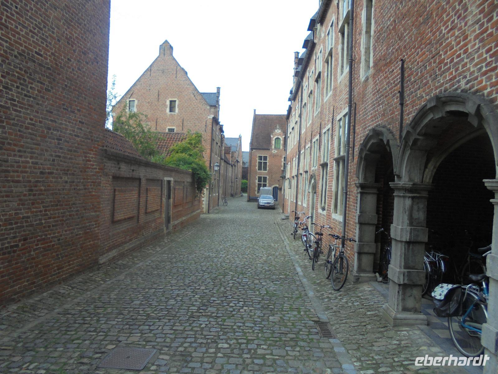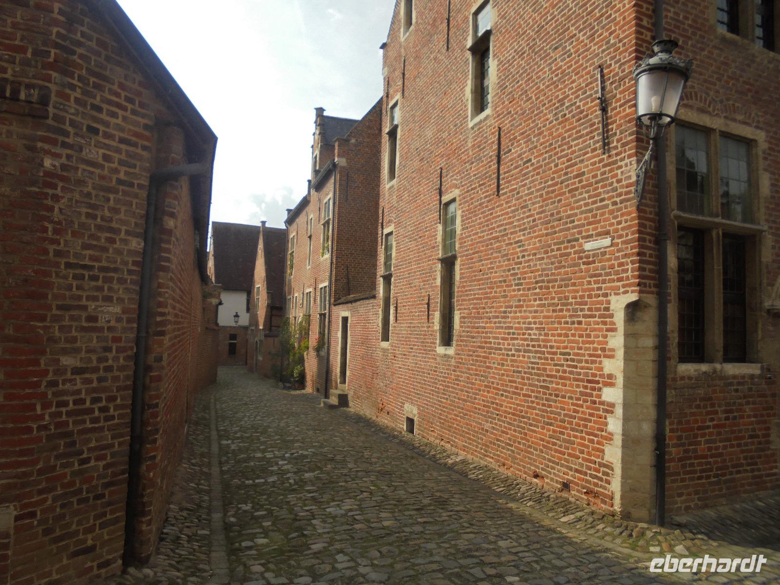 Architektonisch ist ihnen gemeinsam, dass sich die Wohnhäuser ihrer Mitglieder - jede Begine lebte in einem eigenen Haus - so um Höfe oder Plätze gruppierten, dass ihre Außenmauern eine feste Außenhülle bildeten, in die man nur durch ein oder zwei Tore hineinkam. Im Inneren bildeten sich durch die Anordnung und - wie in Leuven - Vielzahl der Häuser kleine Straßen, Gassen und Plätze heraus. Das alles konnten wir uns anschauen und nahmen danach unseren Weg durch die Innenstadt von Leuven, an zahlreichen Gebäuden der Katholischen Universität aus verschiedenen Epochen vorbei, bis wir den großen Markt erreichten.