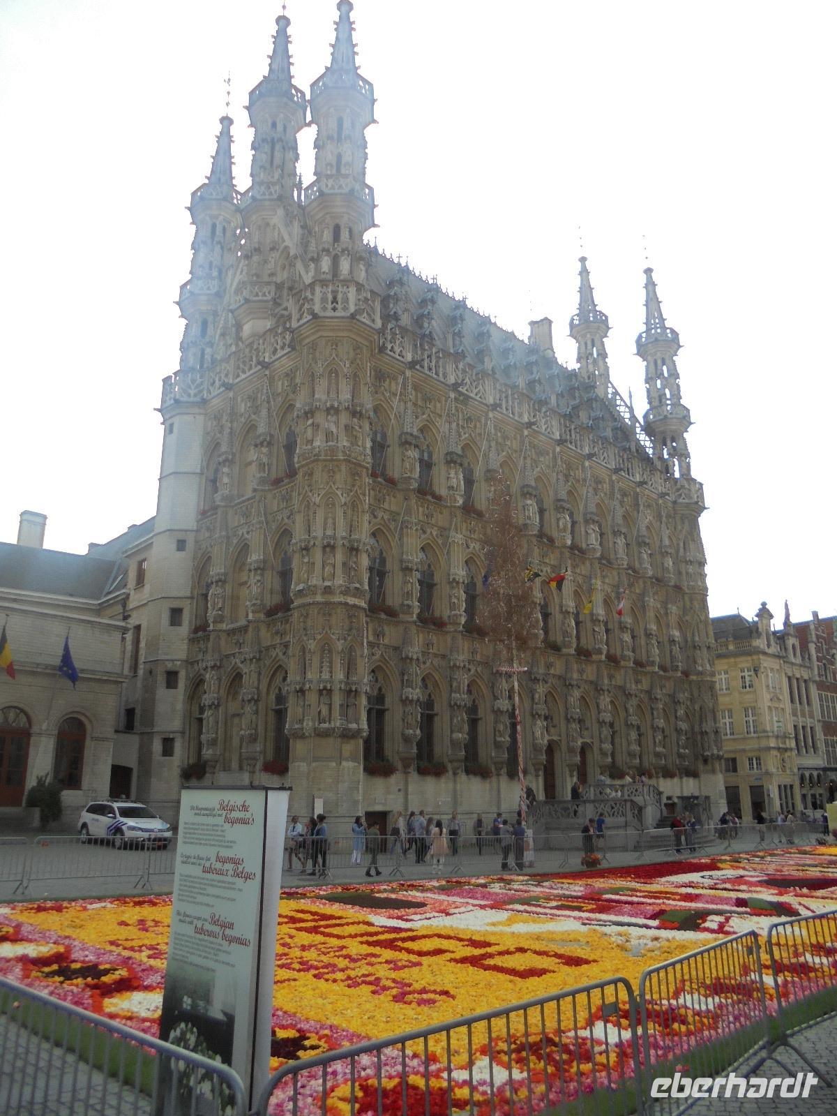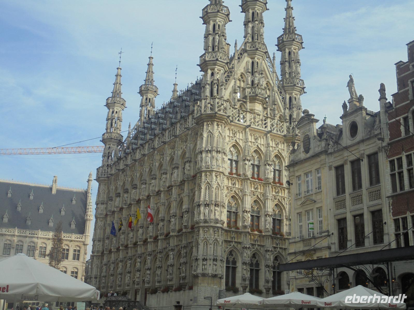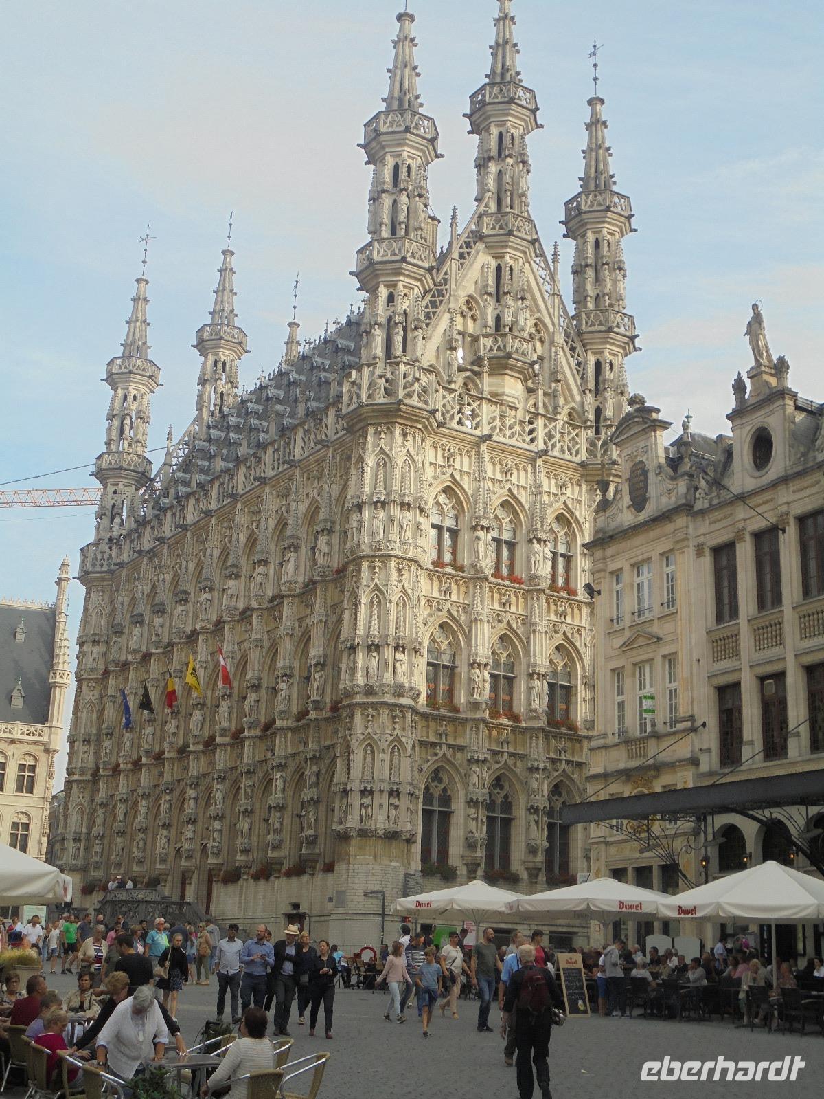 Der wird dominiert durch das unvergleichliche Leuvener Rathaus, durch die Pracht seiner Verzierungen eines der berühmtesten und wohl auch schönsten Rathäuser der Welt. Im 15. Jh. erbaut. Auf der Liste der schönsten Bauwerke der Spätgotik in Europa befindet es sich ganz weit oben. Geschmückt mit über 200 Figuren in von Baldachinen gekrönten Nischen, von denen die meisten aber erst in späteren Epochen angebracht wurden, sind die Schaufassaden des Gebäudes klar gegliedert und mit reich verzierten Giebeltürmchen versehen - im Gegensatz zu den meisten anderen Rathäusern, die einen Mittel-oder Treppenturm haben.