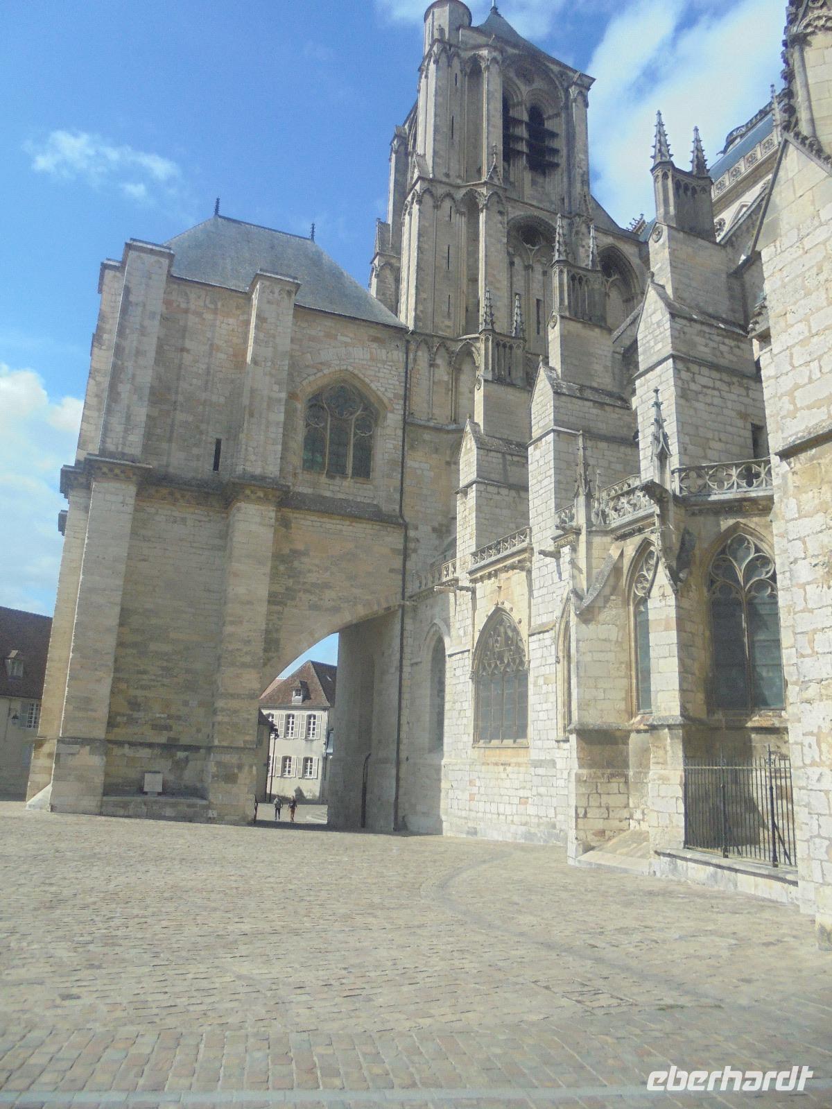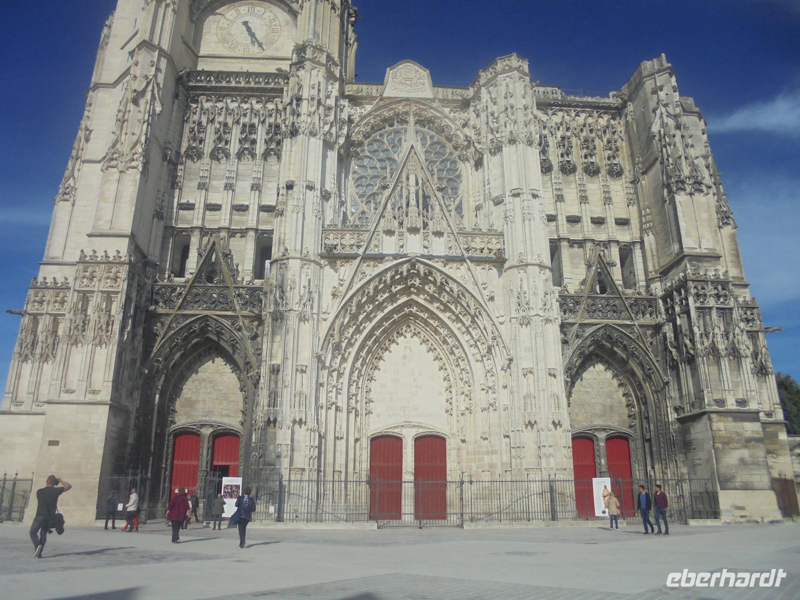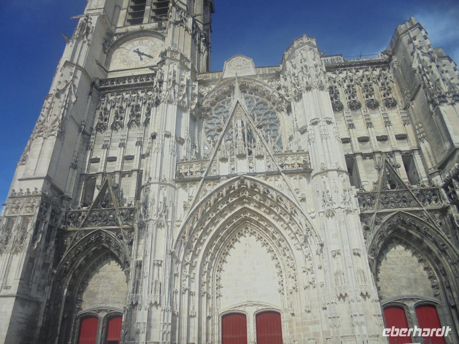 Meaux, an einer Schleife der Marne einige Dutzend Kilometer östlich von Paris gelegen, war seit der späten Römerzeit eine wichtige Siedlung, wovon noch ihre gallorömischen Stadtmauern zeugen. Wir hatten morgens ein paar Minuten Zeit in der Altstadt für einen Bummel, bei dem wir nicht nur diese Stadtbefestigung sahen, sondern auch die spätgotische Stephanskathedrale mit ihrem feingliedrig gestalteten Innenraum und der imposanten Fassade im Flamboyant-Stil besuchen konnten.