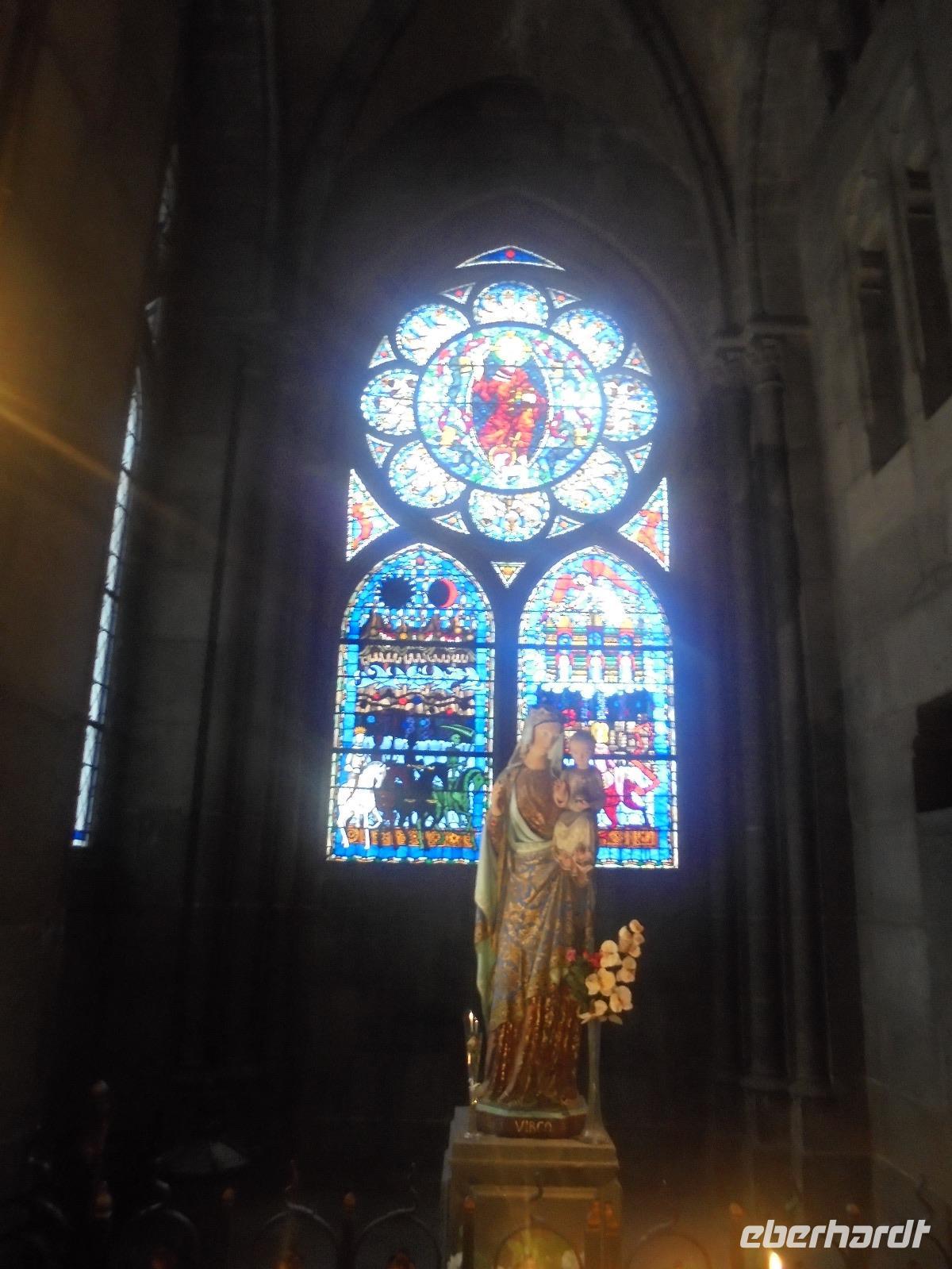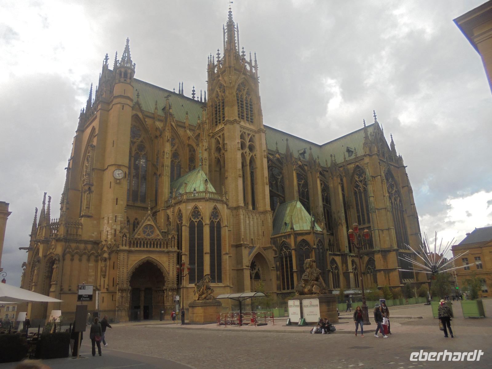Die einstige Bedeutung von Metz für das fränkische Reich und seine Nachfolger läßt sich noch an der bedeutenden und wunderschönen Kathedrale Saint-Étienne ablesen. Der heutige hochgotische Bau wurde zwischen dem 13. Und dem 16. Jh. errichtet. Er besitzt ein ungewöhnlich hohes gotisches Mittelschiff, was der Kirche nicht nur eine gewaltige Raumwirkung beschert, sondern sie mit dem über 41 m hohen Gewölbe nach Beauvais und Amiens zur Kirche mit dem dritthöchsten gotischen Gewölbe der Welt macht. Zudem besitzt das Bauwerk wundervolle farbigen Glasfenster aus dem späten Mittelalter - tatsächlich sogar die größte derartige Glasfläche in ganz Frankreich, größer noch als die der Kathedrale von Chartres.Zwei besonders bekannte Fenster gestaltete übrigens der berühmte Maler Marc Chagall in den fünfziger Jahren des vorigen Jahrhunderts. Unser Spaziergang führte dann von der Kathedrale über die durch eine Insel geteilte Mosel zum Theaterplatz, dessen original erhaltenes Theater - das wohl älteste Frankreichs - aus der Zeit vor der Revolution 1789 stammt. Bis heute ist das Ensemble des Theaters mit einer Anlage aus Brunnen und Blumenrabatten sowie die dazugehörige heutige Präfektur von Lothringen sehr sehenswert.