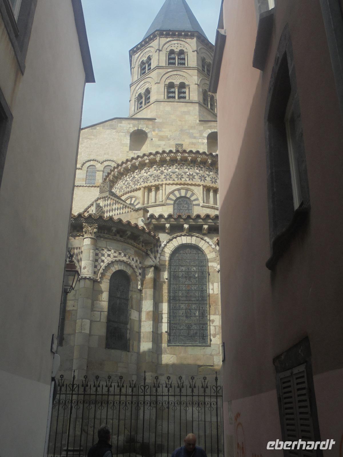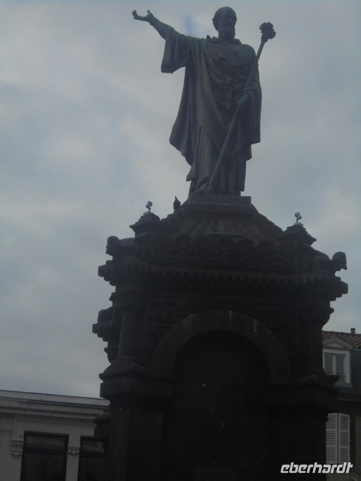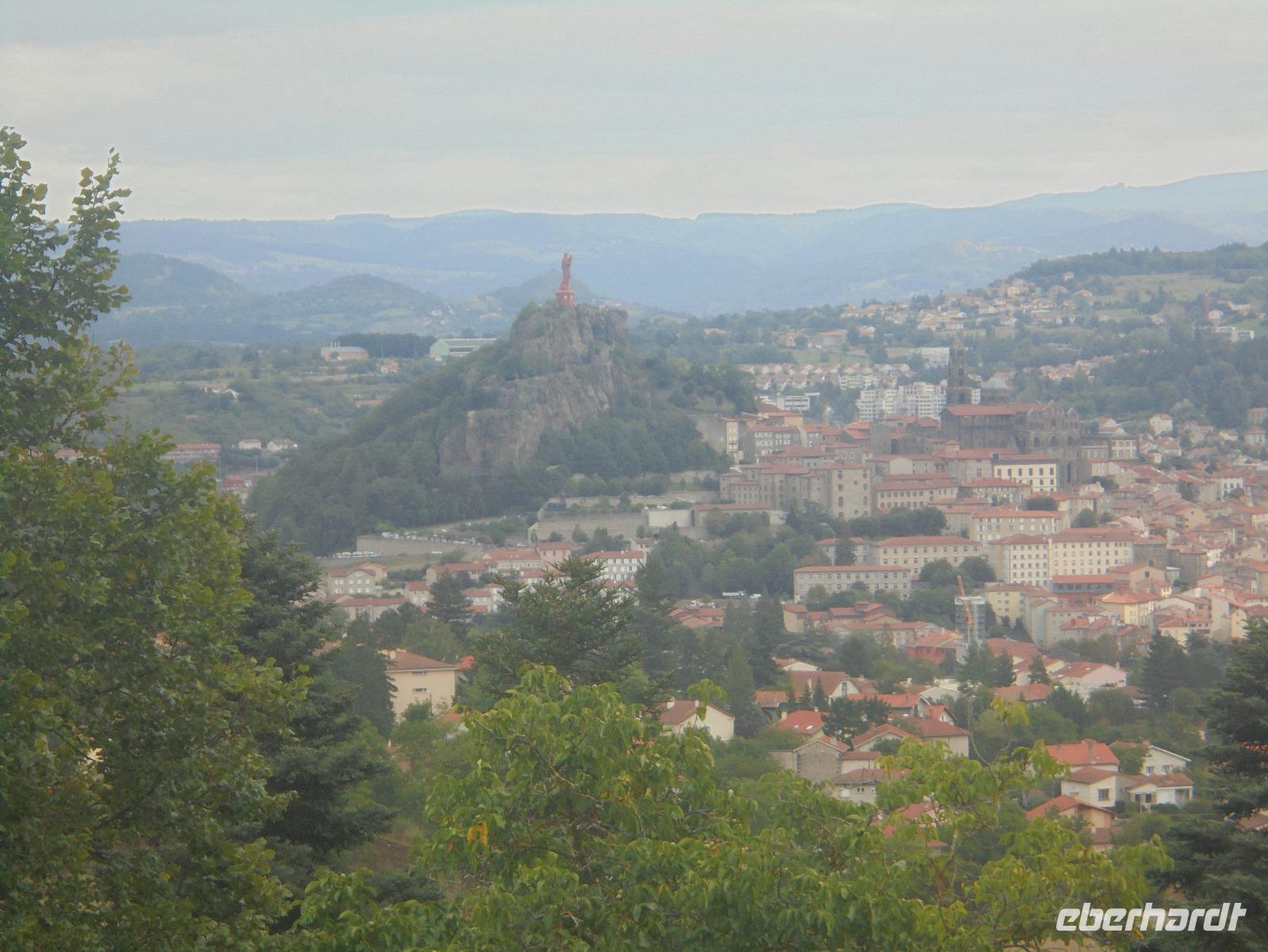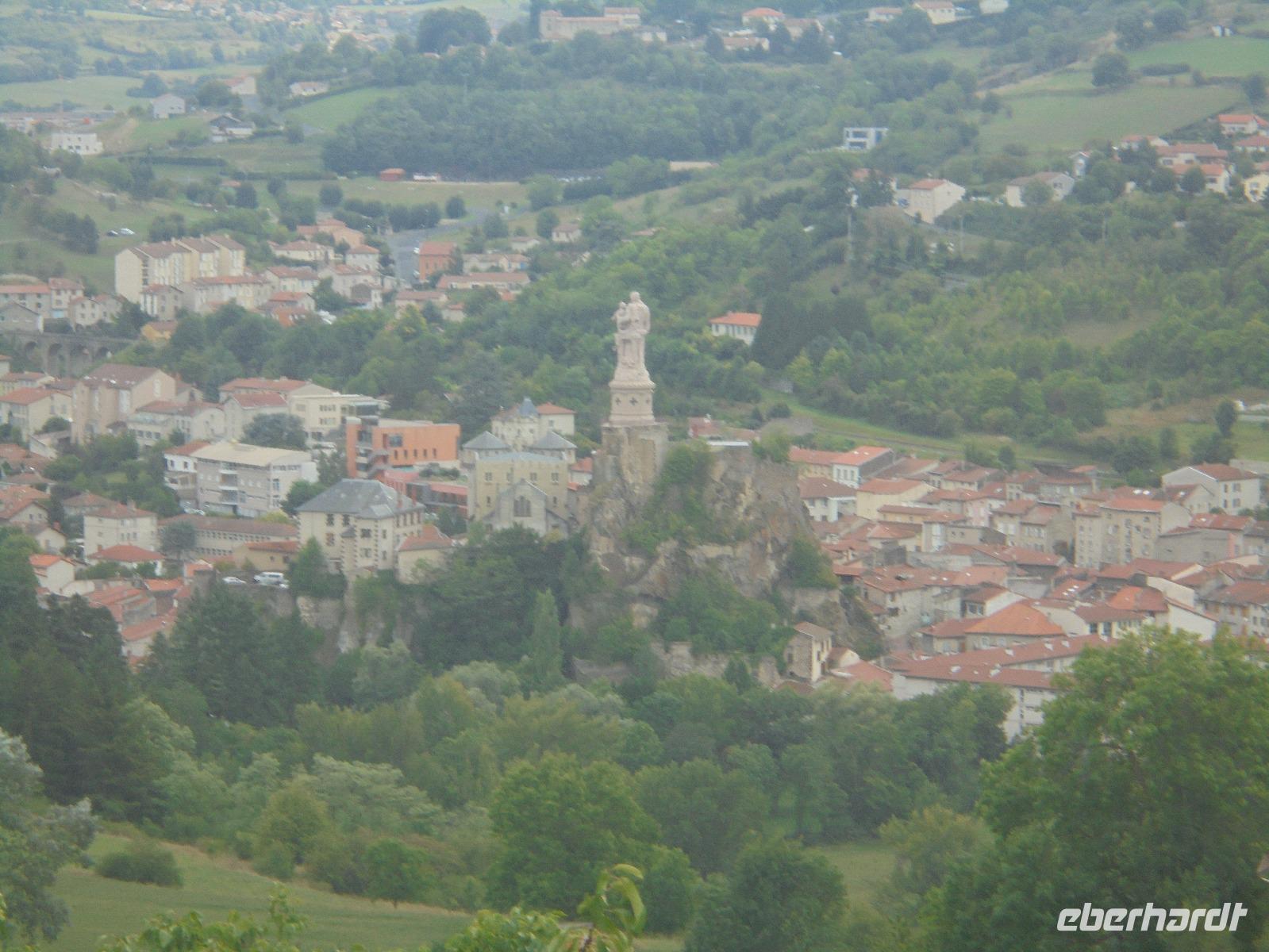 Nach unserem Rundgang erst in Clermont und dann im historischen Ortsteil Montferrand setzten wir unseren Weg fort in den nächsten interessanten Ort der Auvergne, wobei uns Reiseleiterin Colette begleitete. Le Puy en Velay ist ein für die Landschaft typischer Ort - ehemalige Vulkanschlote, zwischen denen das Stadtzentrum erbaut ist und von denen einige herausragende Bauwerke tragen, fallen sofort ins Auge. Als einer der Ausgangspunkte der französischen Jakobs-Pilgerwege gehört sie zu den Orten des UNESCO-Weltkulturerbes und ihre sehenswerte Kathedrale ist bis heute Pilgerziel. Während des ersten Kreuzzuges war der hiesige Bischof Adhemar der geistige Anführer im Auftrag des Papstes. Die Kathedrale Notre Dame, UNESCO-Erbe, betritt man aufgrund ihrer erhöhten Lage auf einer einstigen Vulkankuppe sozusagen von unten, man steht nach Passieren der orientalisch anmutenden Fassade mitten im Kirchenraum. In verschiedenen Baustufen mehrfach erweitert, weil ihre Bedeutung als Pilgerkirche ständig zunahm, beherbergt Le Puys Kathedrale heute vor allem zwei besondere Heiligtümer - eine alte, wohl schon aus keltischer Zeit stammende wundertätige Basaltplatte, die Krankheiten heilen soll sowie eine bemerkenswerte schwarze Madonna.