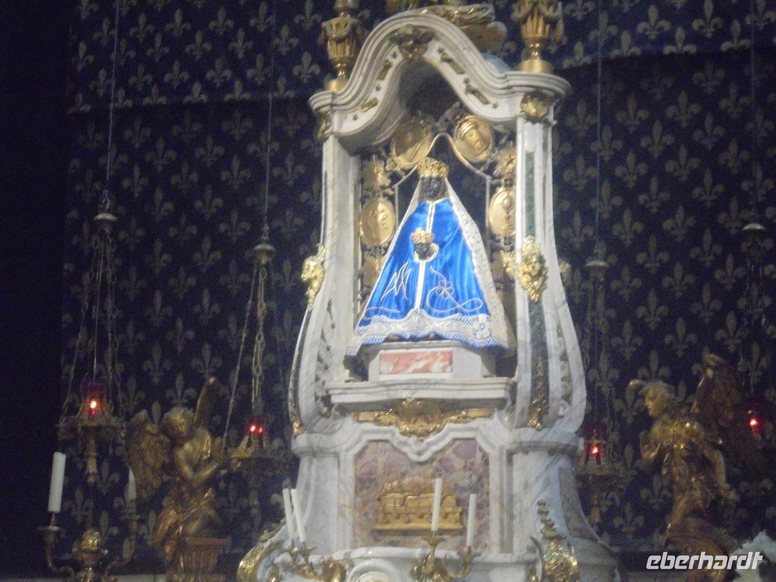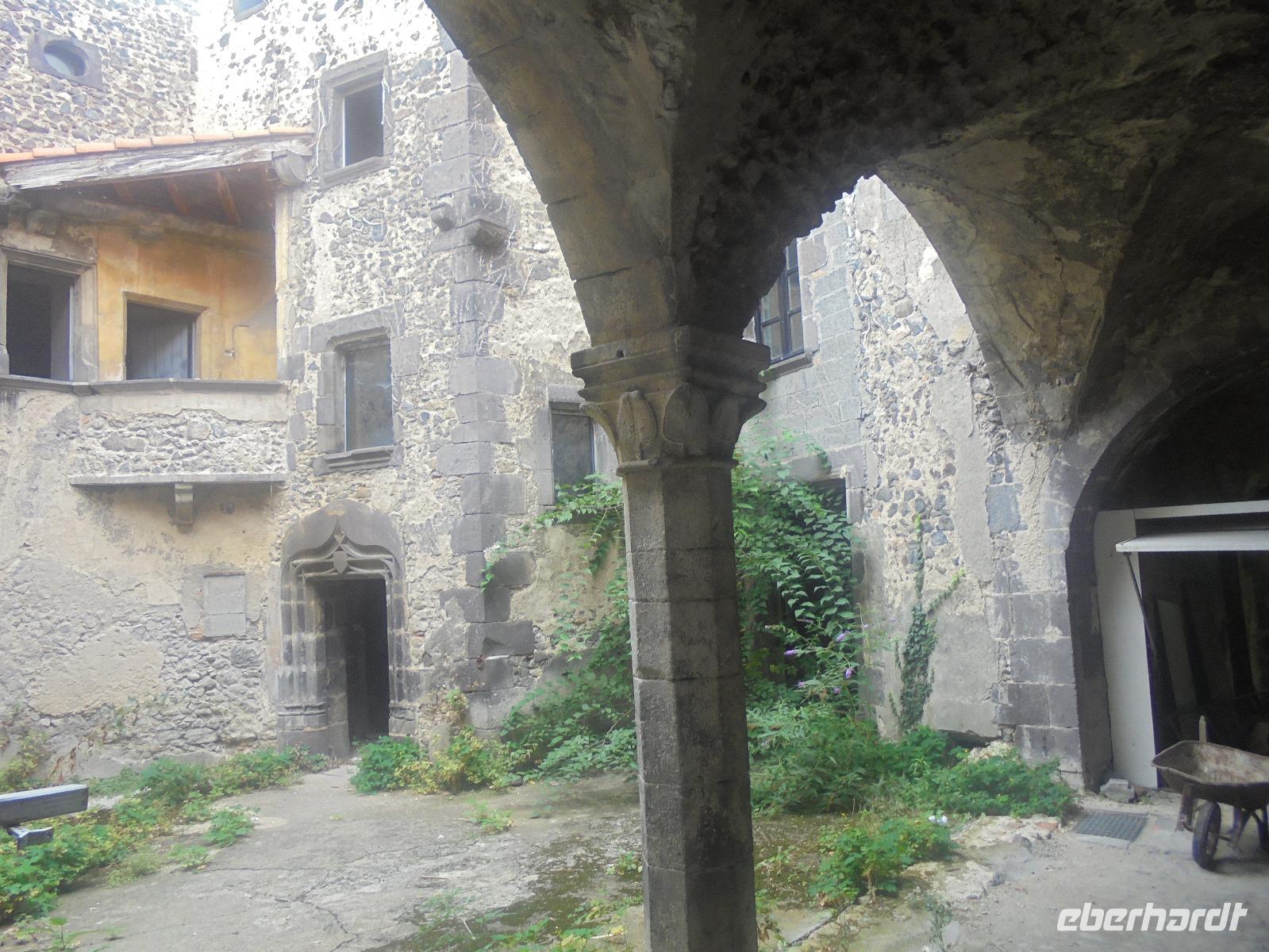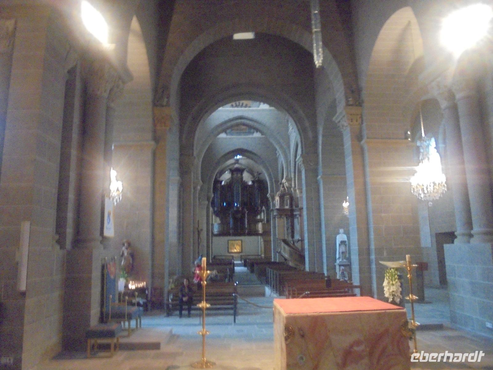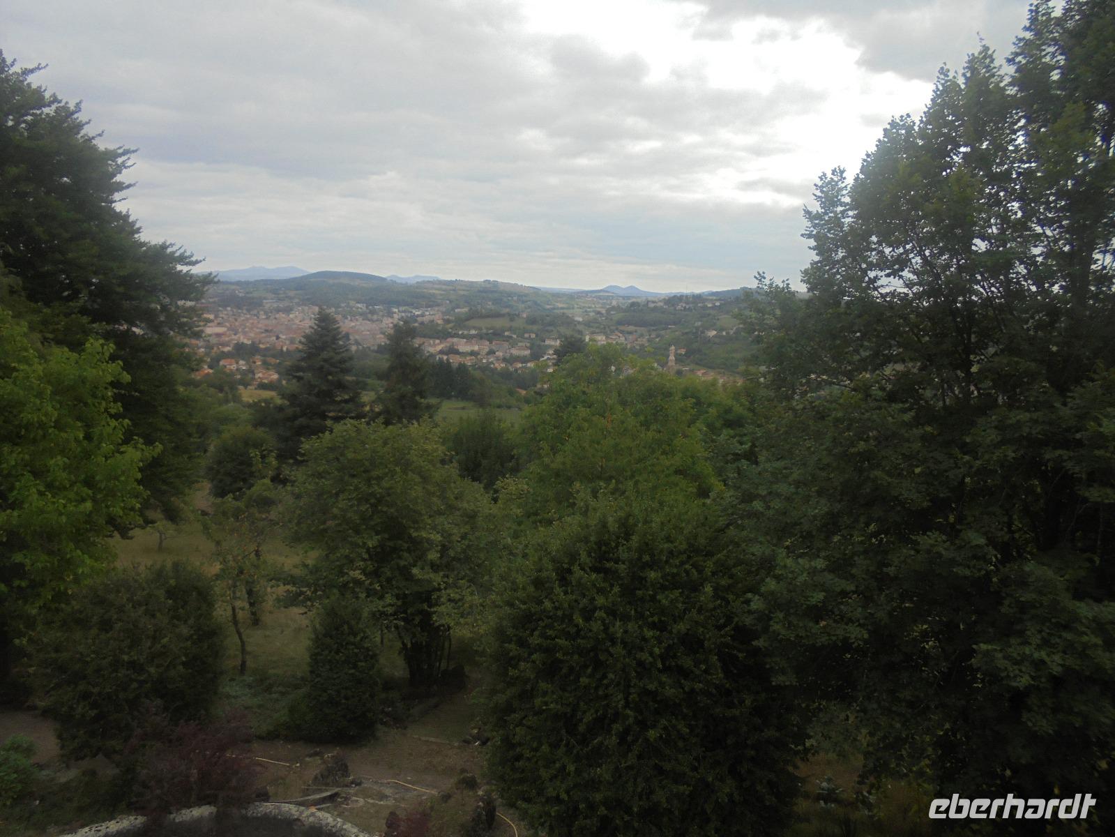 Nach unserem Rundgang erst in Clermont und dann im historischen Ortsteil Montferrand setzten wir unseren Weg fort in den nächsten interessanten Ort der Auvergne, wobei uns Reiseleiterin Colette begleitete. Le Puy en Velay ist ein für die Landschaft typischer Ort - ehemalige Vulkanschlote, zwischen denen das Stadtzentrum erbaut ist und von denen einige herausragende Bauwerke tragen, fallen sofort ins Auge. Als einer der Ausgangspunkte der französischen Jakobs-Pilgerwege gehört sie zu den Orten des UNESCO-Weltkulturerbes und ihre sehenswerte Kathedrale ist bis heute Pilgerziel. Während des ersten Kreuzzuges war der hiesige Bischof Adhemar der geistige Anführer im Auftrag des Papstes. Die Kathedrale Notre Dame, UNESCO-Erbe, betritt man aufgrund ihrer erhöhten Lage auf einer einstigen Vulkankuppe sozusagen von unten, man steht nach Passieren der orientalisch anmutenden Fassade mitten im Kirchenraum. In verschiedenen Baustufen mehrfach erweitert, weil ihre Bedeutung als Pilgerkirche ständig zunahm, beherbergt Le Puys Kathedrale heute vor allem zwei besondere Heiligtümer - eine alte, wohl schon aus keltischer Zeit stammende wundertätige Basaltplatte, die Krankheiten heilen soll sowie eine bemerkenswerte schwarze Madonna.
