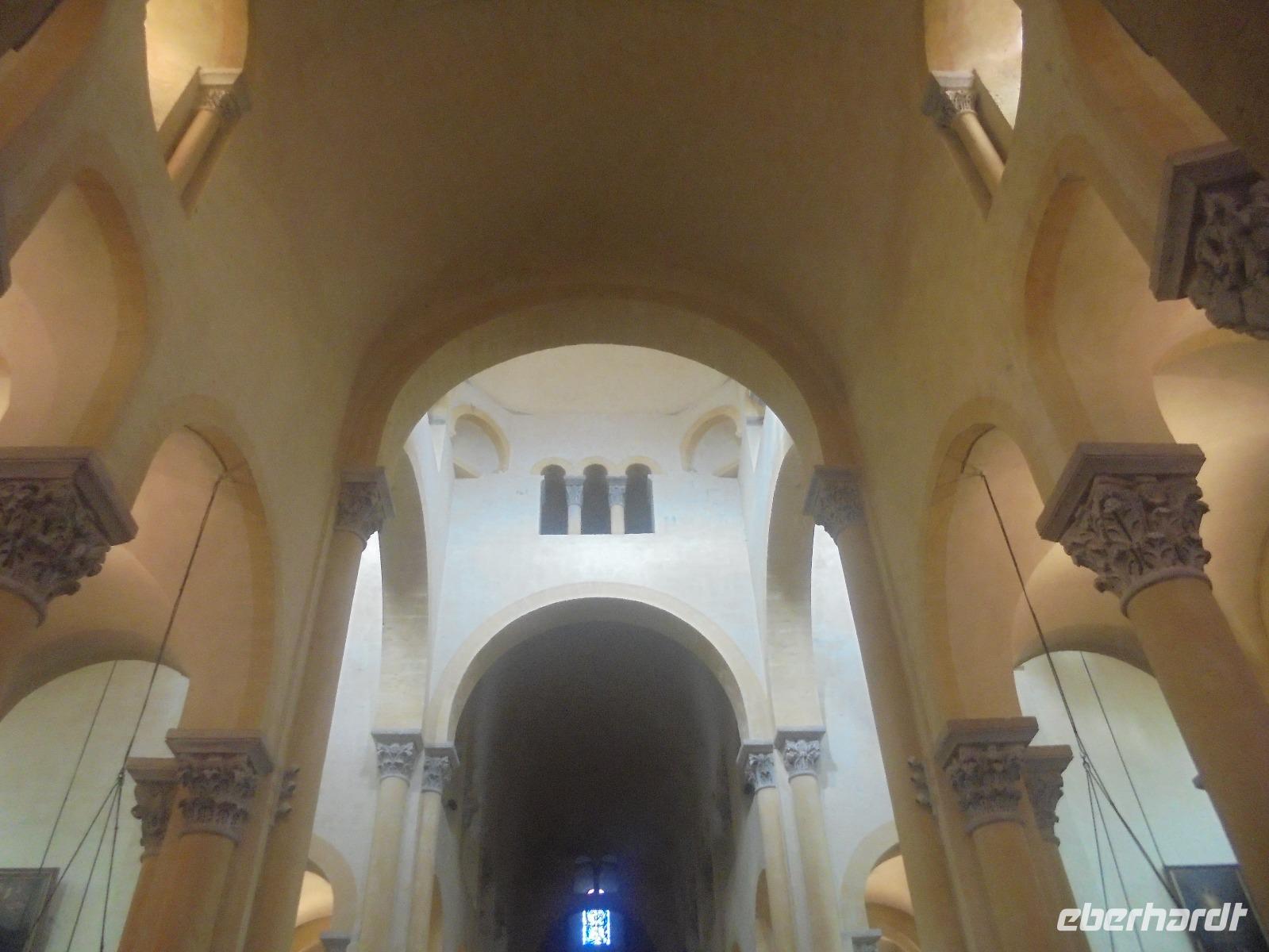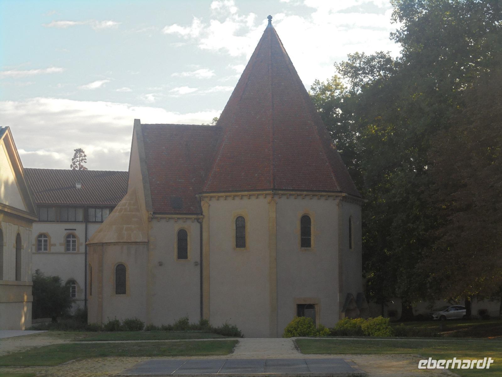 Wenn man die mächtige dreischiffige Basilika betritt, sieht man automatisch fünf Kirchenschiffe, denn die beiden äußeren Kapellenkränze erganzen den ursprünglich romanischen Bau. Die Gesamtanlage, die mit Anbauten romanische, gotische und barocke Elemente enthält, sorgt dafür, dass man nach dem Betreten nur deren Raumwirkung, Eleganz und Atmosphäre bestaunen kann. Wir hatten noch etwas Zeit, uns mit der Innenstadt von Mainz vertraut zu machen, bevor es weiterging in das Rheinstädtchen Ingelheim, bekannt für die Reste seiner Kaiserpfalz, die zu den ältesten und bedeutendsten ihrer Art gehört. Aus fränkischen Zeiten stammend, diente der hier als zeitweiliger Wohnsitz für König bzw. später Kaiser geplante, gut befestigte Hof mit Kirche, Palast und Wirtschaftsgebäuden den deutschen Königen und Kaisern bis spät ins 11. Jh. hinein als Aufenthalts- und Regierungsort. Bedeutende Reste, vor allem aber Grundmauern, heute teilweise von Wohnvierteln überbaut, sind sehr gut erhalten und erlauben noch eine Vorstellung von der einstigen Größe und Pracht der Pfalz. Als eines der wichtigsten und weithin bekannten Machtzentren ihrer Zeit dürfte sie eines der Vorbilder späterer Komtureien, der Verwaltungszentren der Ritterorden, insbesondere der Templer und später des Deutschen Ordens gewesen sein.