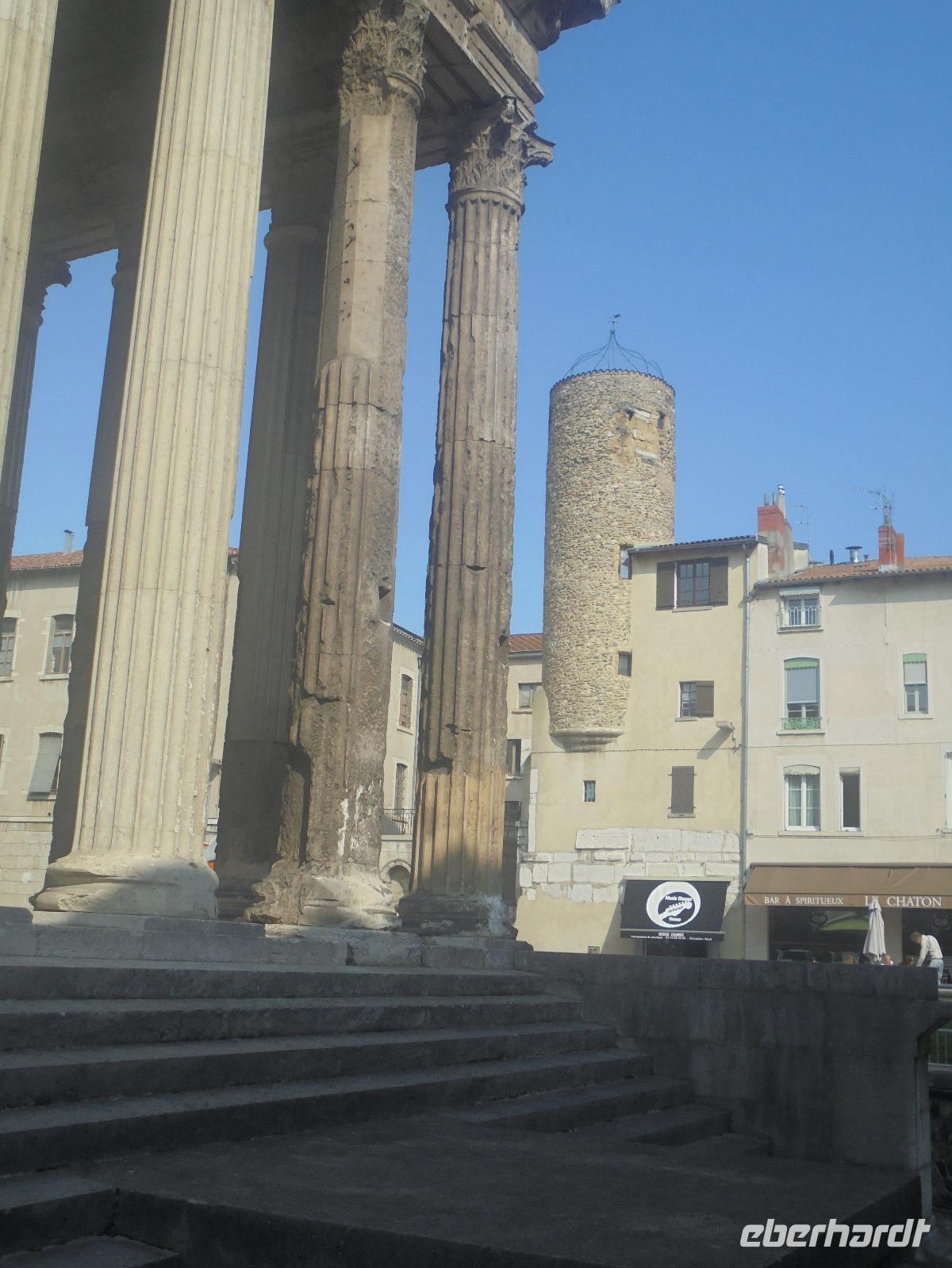 Besonders gut erhalten im Zentrum von Vienne ist der Tempel des Augustus und der Livia. Errichtet als „Podiumstempel" auf erhöhtem Unterbau, prägt sein Heiligtum, die Cella, und die dieses umgebende prächtige, großzügig erbaute offene Säulenhalle bis heute das Bild der Innenstadt. Dabei gehört dieser Tempel zu den der besterhaltenen seiner Art im gesamten ehemaligen Imperium - nicht zuletzt deshalb, weil er im Mittelalter als christliche Kirche genutzt wurde.