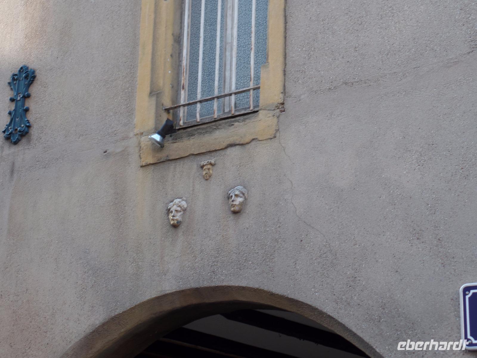Wie schon in Troyes am Tag zuvor checkten wir auch in Metz zunächst ins Hotel ein, bevor wir zu einem Stadtrundgang aufbrachen, denn unser Hotel lag am Rande der recht hübschen Altstadt von Metz. Am historischen Außenmarkt der Stadt vorbei verhielten wir zunächst am „Maison de Tete d'Or". Seltsame, einstmals vergoldete Köpfe zieren das Gebäude am Ende einer der Hauptstraßen durch die Altstadt, die auf eine der Gründungs-Legenden von Metz im Zusammenhang mit der Zerstörung der Stadt durch Hunnenkönig Attila anspielen.