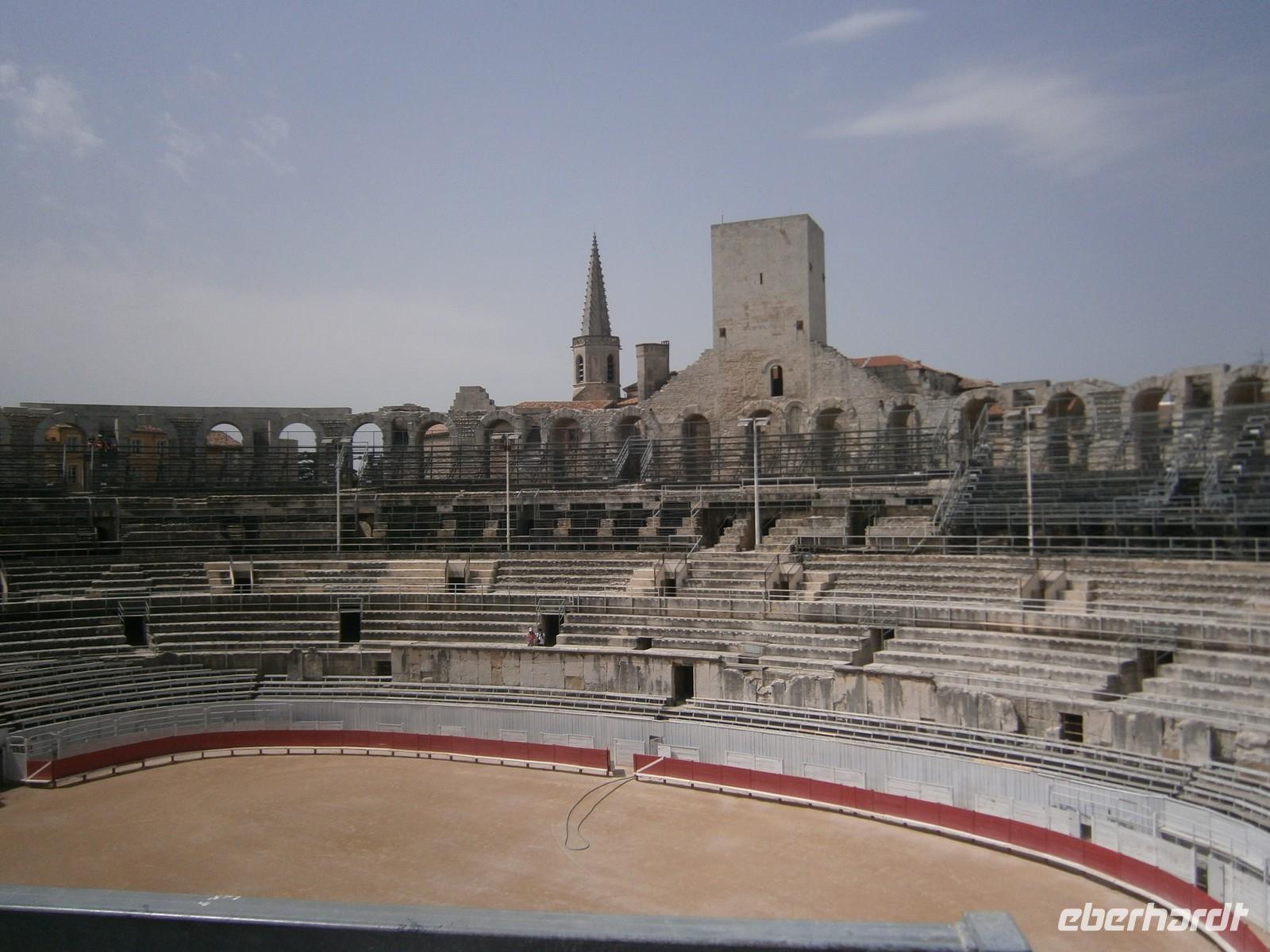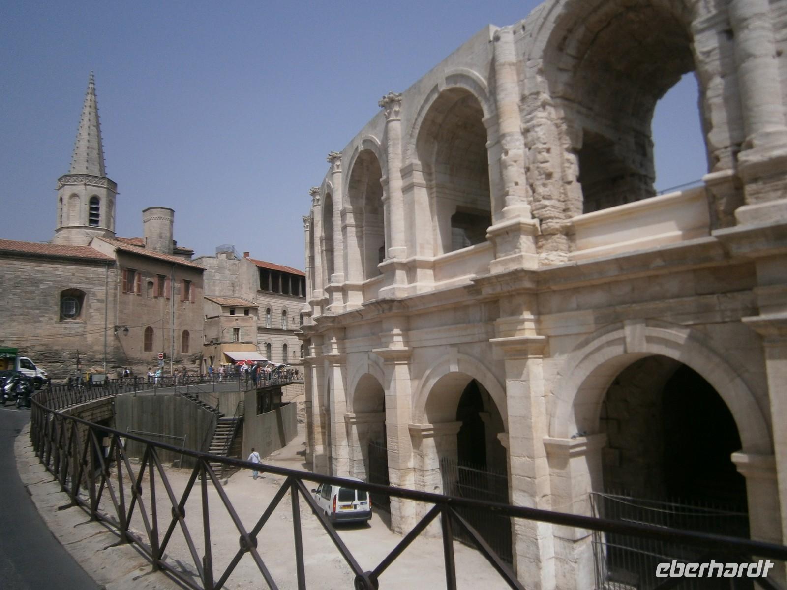 Rathaus, der Kirche St. Trophime, laufen zu den Constantin- Thermen, dem Amphietheater und der Arena. Bei französischer Musik essen wir in einer Freiluftgaststätte zu Mittag und fühlen uns wie „Gott in Frankreich“. Andere Gäste genießen den schönen Sommertag am