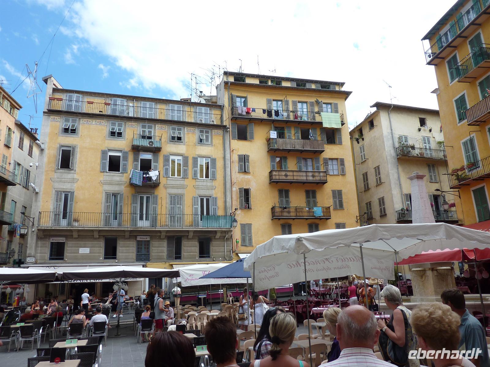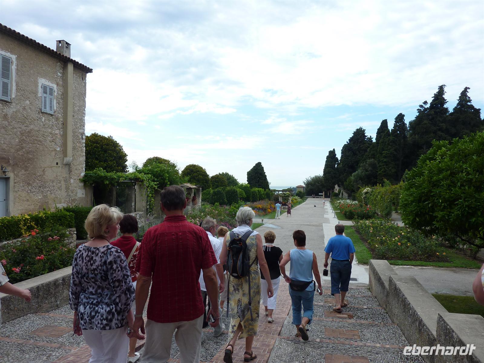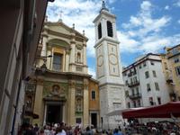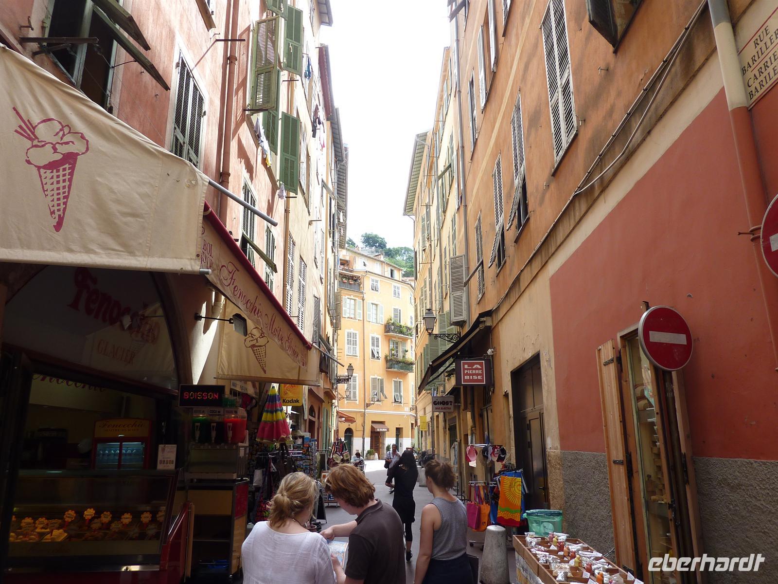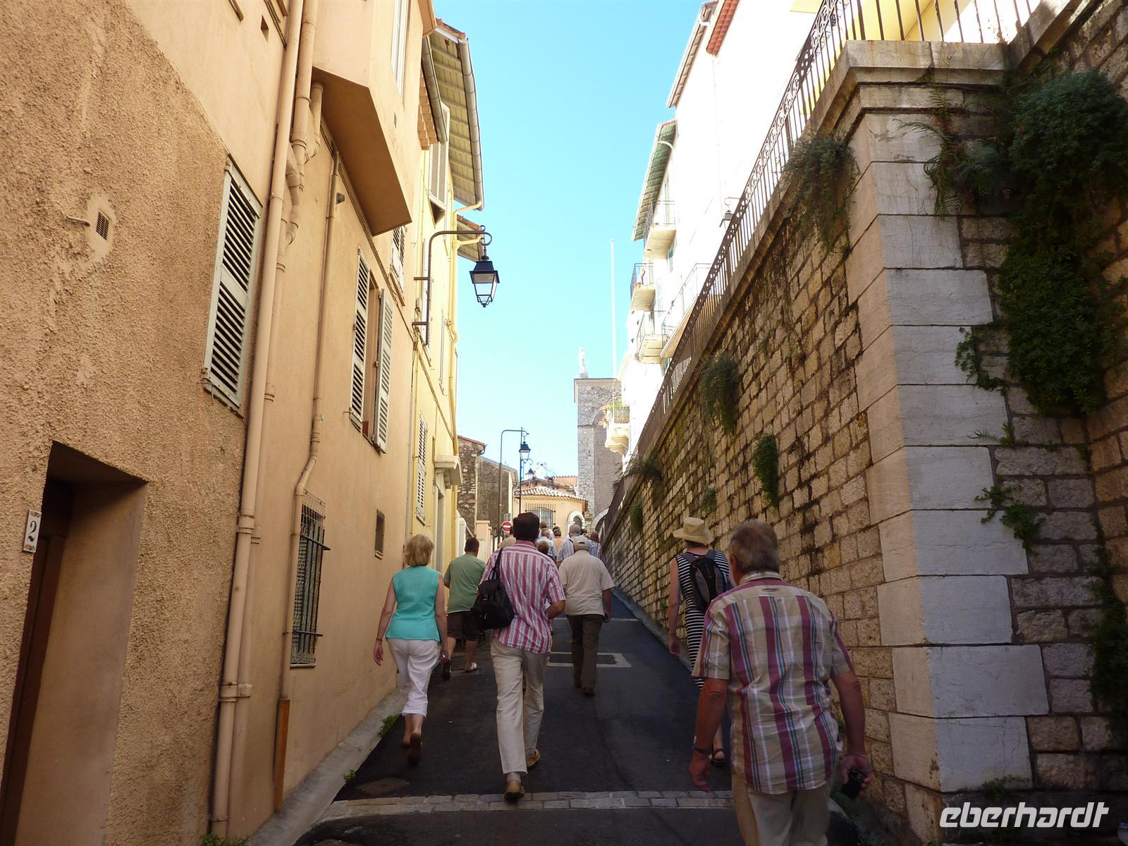 Christel beginnt mit der Stadtführung in Nizza. Unser erster Stopp ist die russisch-orthodoxe Kirche in der Nähe des Hauptbahnhofs. Der 1912 eingeweihte Kuppelbau geht auf die häufige Anwesenheit der Zarenfamilie zurück. Unsere Rundfahrt in Nizza führt uns auf den Cimiez-Hügel. Dieser Ort liegt nördlich von Alt- und Neustadt hoch über der Stadt. Hier stehen die luxuriösen Villen und Winterresidenzen des europäischen Hochadels. Keine Villa gleicht der anderen. Wir machen eine Pause am Franziskaner-Kloster aus dem 16. Jahrhundert und bummeln durch den Klostergarten, wo wir eine herrliche Sicht über die Stadt haben. Anschließend führen uns Doris und Christel in die Altstadt. Da wir eine größere Gruppe sind, teilen wir uns in zwei kleinere Gruppen auf. Die Altstadt ist das Schönste von Nizza. In ihren verwinkelten Gassen fühlt man sich nach Italien versetzt. Die Häuser haben dunkelrote und ockerfarbene Fassaden, fast an jeder Ecke steht eine kleine Barockkirche oder Kapelle. Vor den Fensterläden hängen Wäscheleinen und Vogelkäfige. Da wir in der Altstadt unsere Mittagspause planen, gibt uns Christel hilfreiche Ratschläge für typisch französische Spezialitäten. Zum Beispiel die „socca“, fladengroße, flache Pfannkuchen aus Kichererbsenmehl oder „pan bagnats“, mit Tomaten, Thunfisch, Oliven und Salat gefüllte Teigtaschen. Viele Gäste nutzen gleich die Gelegenheit und kaufen sich in der nächsten Boulangerie eine solche Köstlichkeit. Das Herz der Altstadt ist der „Cours Saleya“, ein langgestrecktes Rechteck, auf dem jeden Vormittag der Blumen- und Gemüsemarkt der Stadt stattfindet. Nur montags - also heute - ist hier ein großer Antiquitätenmarkt. Zur Meerseite hin wird der Cours Saleya von einer flachen Häuserzeile, der sogenannten Ponchettes begrenzt. Während unseres Altstadtbummels sehen wir außerdem den Justizpalast und die Kathedrale Ste. Réparate.