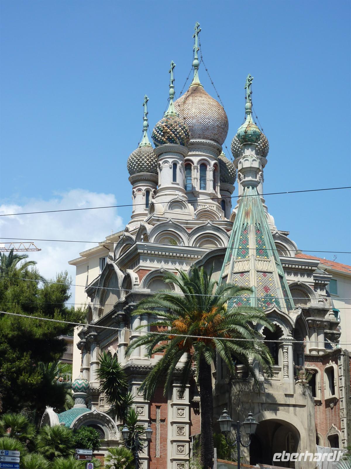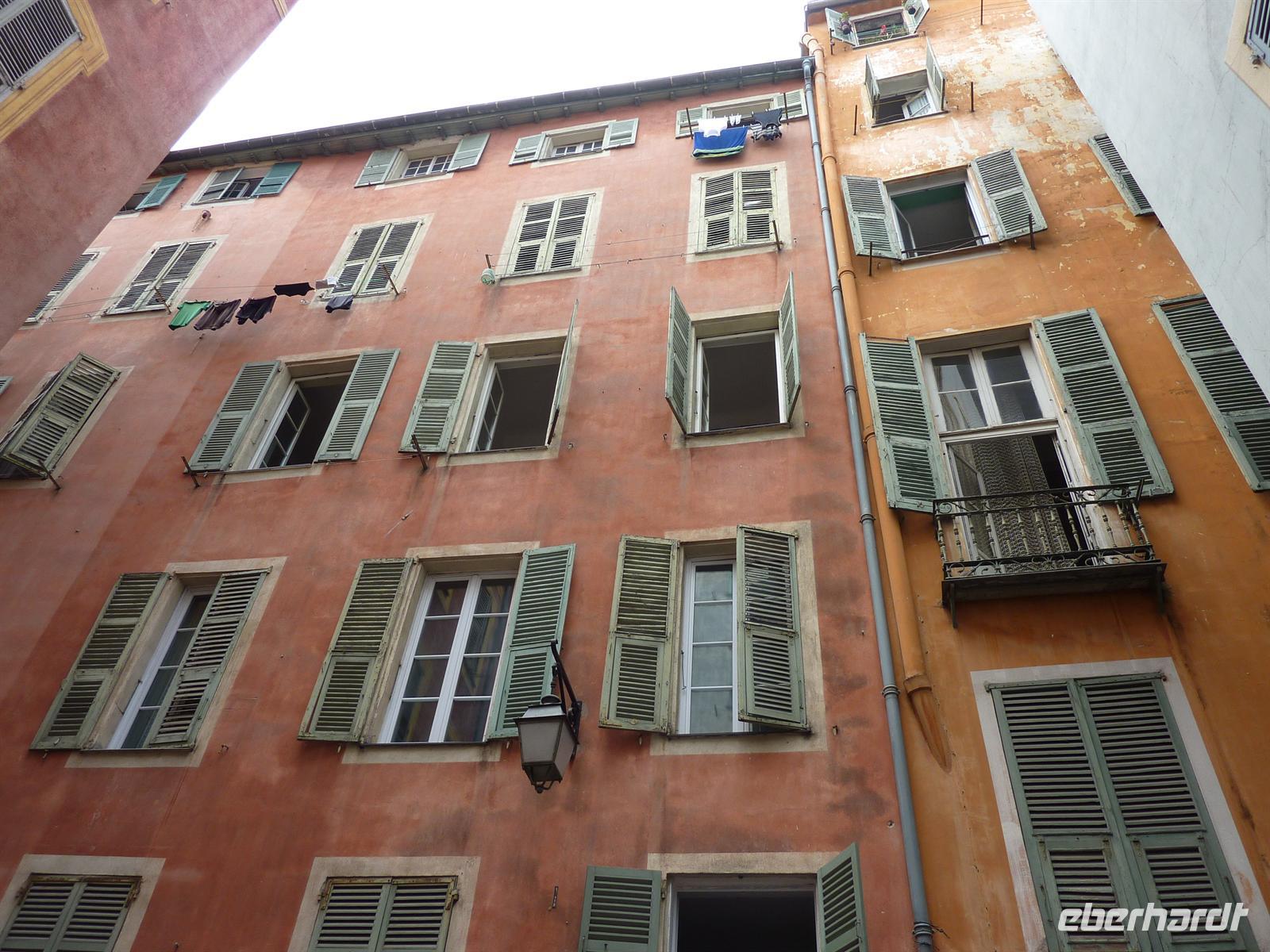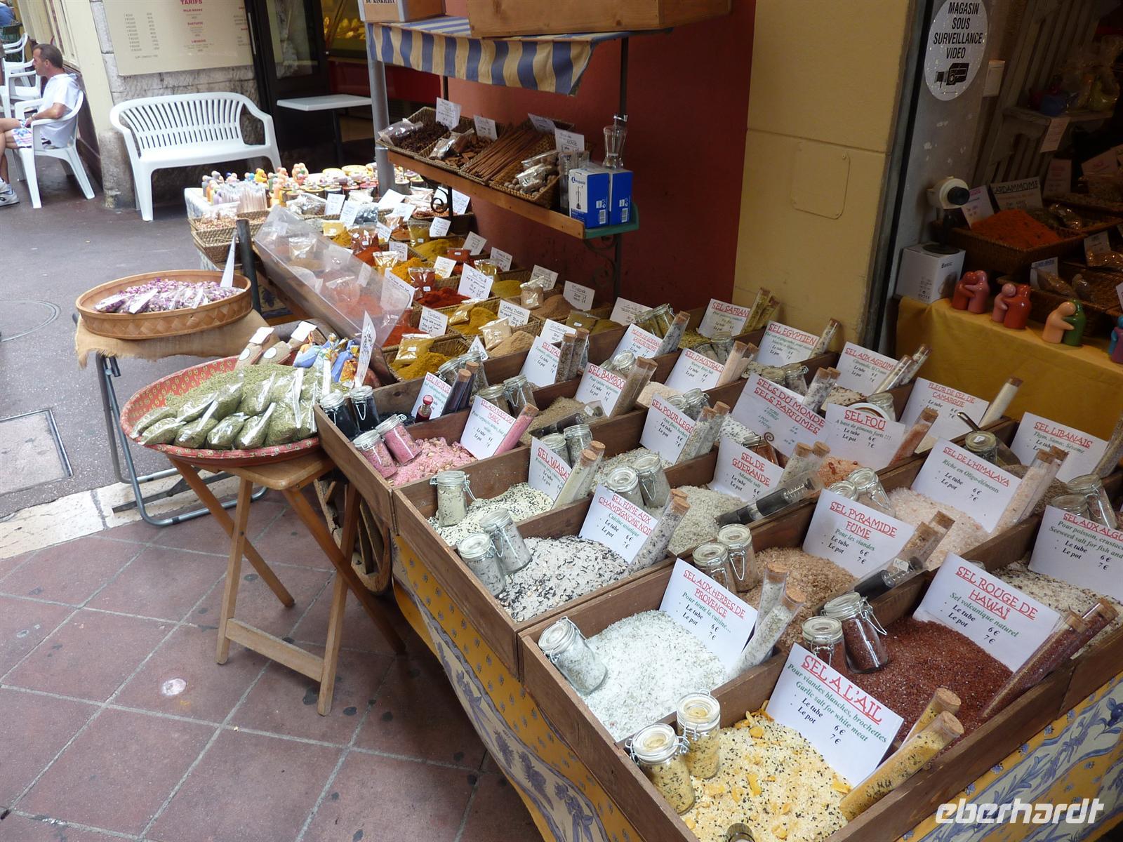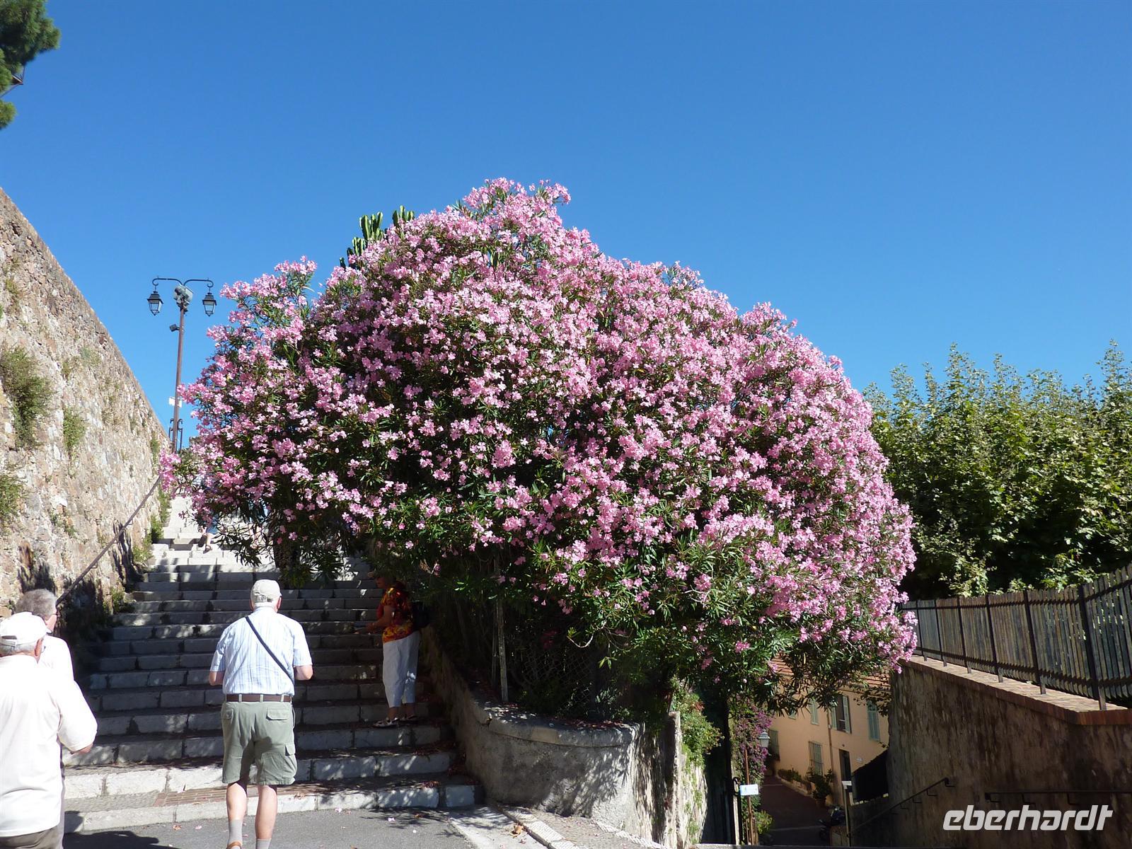Christel beginnt mit der Stadtführung in Nizza. Unser erster Stopp ist die russisch-orthodoxe Kirche in der Nähe des Hauptbahnhofs. Der 1912 eingeweihte Kuppelbau geht auf die häufige Anwesenheit der Zarenfamilie zurück. Unsere Rundfahrt in Nizza führt uns auf den Cimiez-Hügel. Dieser Ort liegt nördlich von Alt- und Neustadt hoch über der Stadt. Hier stehen die luxuriösen Villen und Winterresidenzen des europäischen Hochadels. Keine Villa gleicht der anderen. Wir machen eine Pause am Franziskaner-Kloster aus dem 16. Jahrhundert und bummeln durch den Klostergarten, wo wir eine herrliche Sicht über die Stadt haben. Anschließend führen uns Doris und Christel in die Altstadt. Da wir eine größere Gruppe sind, teilen wir uns in zwei kleinere Gruppen auf. Die Altstadt ist das Schönste von Nizza. In ihren verwinkelten Gassen fühlt man sich nach Italien versetzt. Die Häuser haben dunkelrote und ockerfarbene Fassaden, fast an jeder Ecke steht eine kleine Barockkirche oder Kapelle. Vor den Fensterläden hängen Wäscheleinen und Vogelkäfige. Da wir in der Altstadt unsere Mittagspause planen, gibt uns Christel hilfreiche Ratschläge für typisch französische Spezialitäten. Zum Beispiel die „socca“, fladengroße, flache Pfannkuchen aus Kichererbsenmehl oder „pan bagnats“, mit Tomaten, Thunfisch, Oliven und Salat gefüllte Teigtaschen. Viele Gäste nutzen gleich die Gelegenheit und kaufen sich in der nächsten Boulangerie eine solche Köstlichkeit. Das Herz der Altstadt ist der „Cours Saleya“, ein langgestrecktes Rechteck, auf dem jeden Vormittag der Blumen- und Gemüsemarkt der Stadt stattfindet. Nur montags - also heute - ist hier ein großer Antiquitätenmarkt. Zur Meerseite hin wird der Cours Saleya von einer flachen Häuserzeile, der sogenannten Ponchettes begrenzt. Während unseres Altstadtbummels sehen wir außerdem den Justizpalast und die Kathedrale Ste. Réparate.