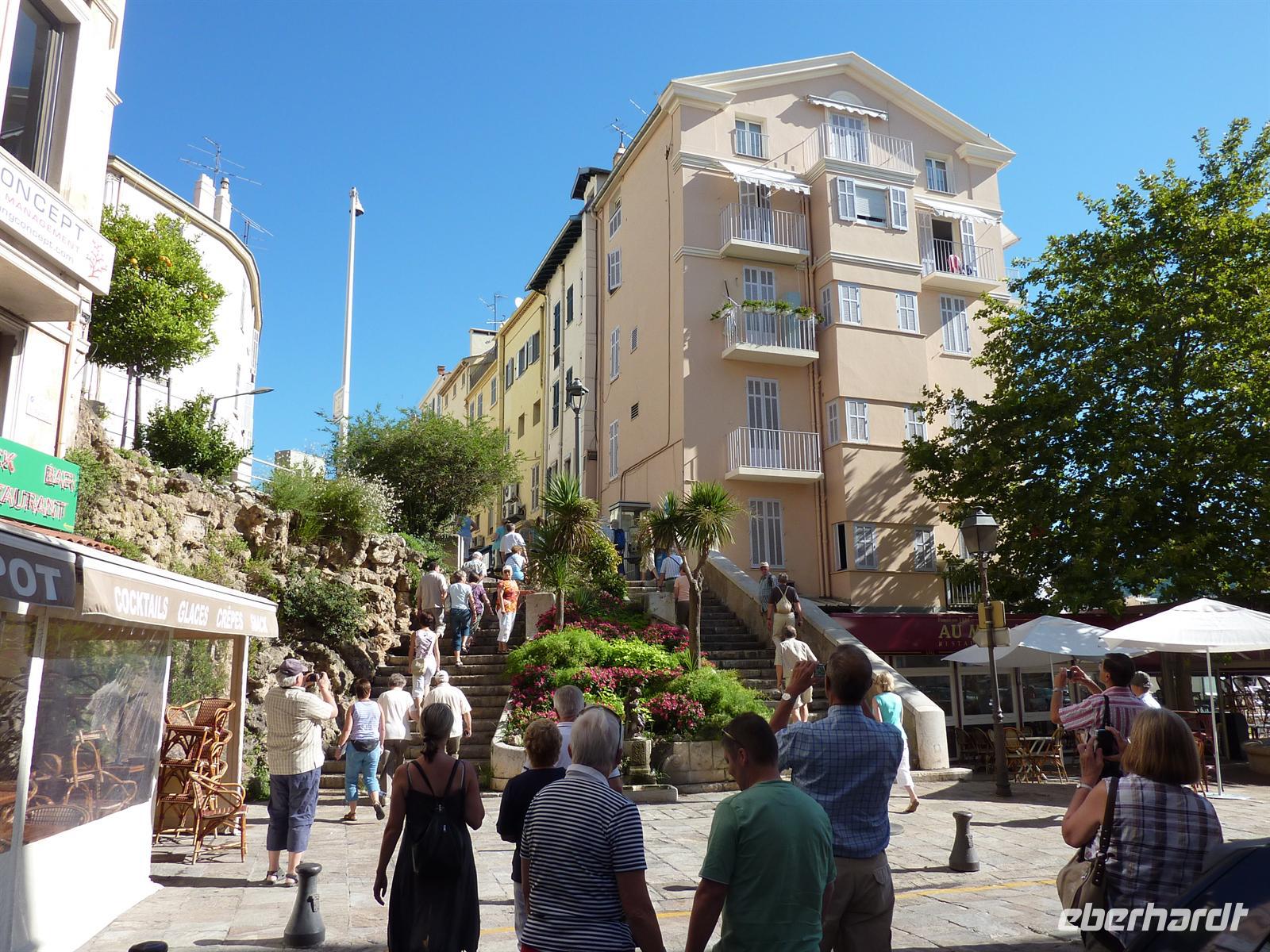 Nach dem Frühstück steht die Filmstadt Cannes im Programm. Cannes ist nicht so großstädtisch und italienisch wie Nizza, nicht so verbaut und herausgeputzt wie Monaco, kein Badeort wie St. Tropez. Cannes hat von allem etwas. Die 75.000- Einwohner-Stadt ist gerade noch überschaubar. Dabei hat Cannes von allen Städten der Côte d’Azur wohl das internationalste
