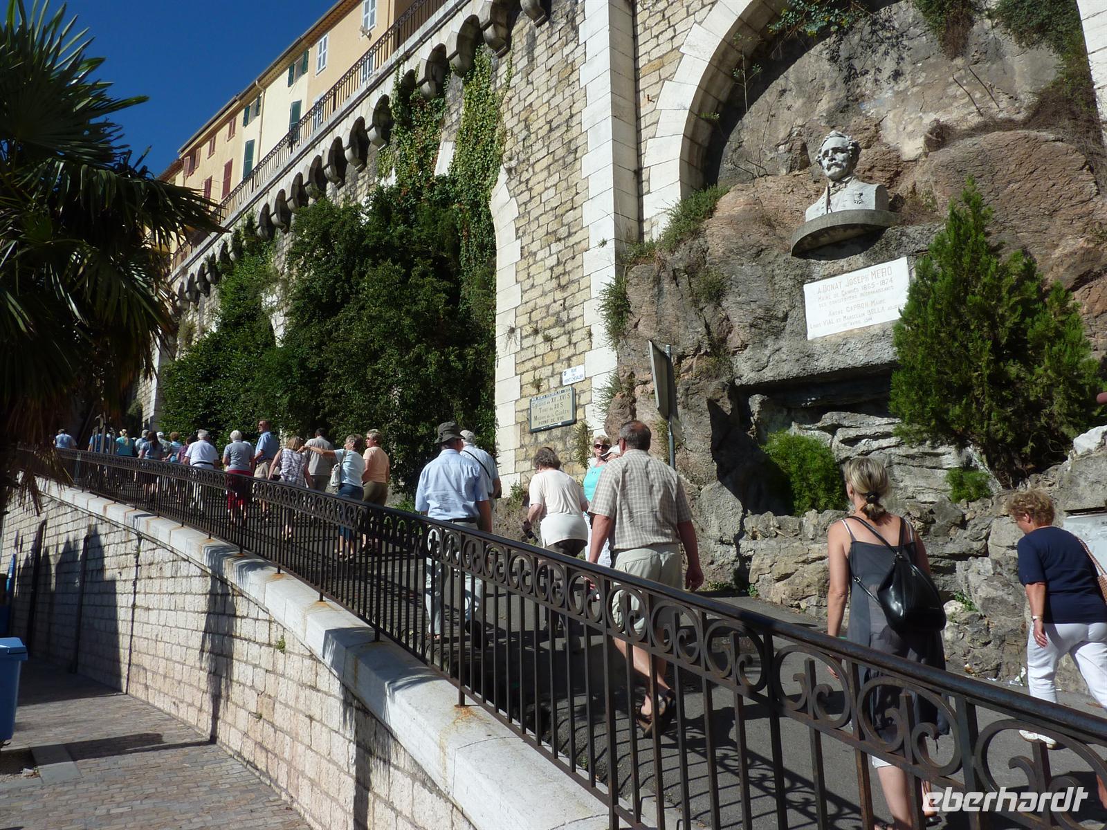 Am „Jardin exotique“ (botanischer Garten) müssen wir unsere Einfahrts- und Parkgenehmigung holen. Für 121 € darf man sich mit dem Bus im Fürstentum Monaco einen Tag lang aufhalten. Wir parken in einem unterirdischen Parkhaus und unternehmen anschließend einen Stadtrundgang. Gleich an den Rolltreppen des Parkhauses sehen wir das Ozeanografische Museum, mit dem weltweit einzigen lebenden Korallenriff, welches aus dem Roten Meer hierher nach Monaco gebracht wurde. Unser Rundgang führt und weiter an den Privathäusern von Prinzessin Caroline und Stéphanie vorbei zur Kathedrale von Monaco-Ville. In der im neoromanistischen Stil errichteten Kathedrale sind die Gräber der Grimaldifamilie untergebracht. Hier befindet sich auch das Grab der 1982 tödlich verunglückten Fürstin Gracia Patricia. Auf dem 60 Meter hohen Felsen, der aus dem Meer ragt ist der Fürstenpalast der Hauptanziehungspunkt. Zu jeder vollen Stunde