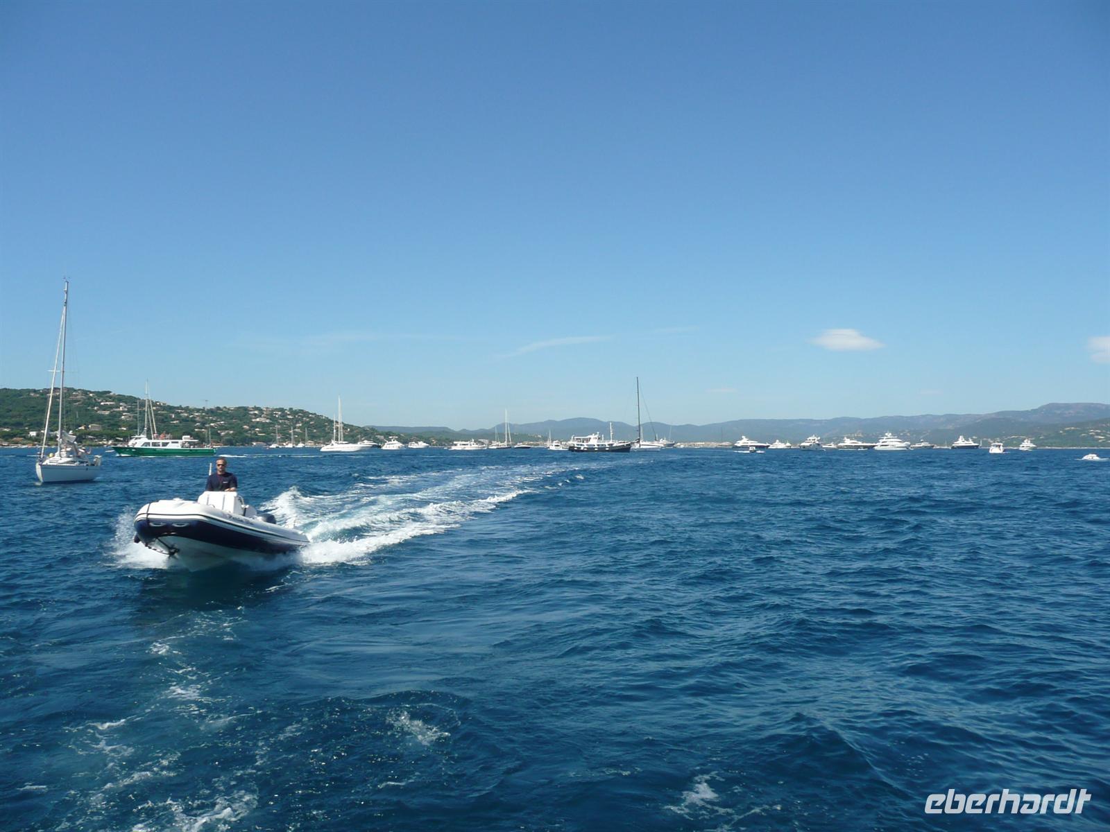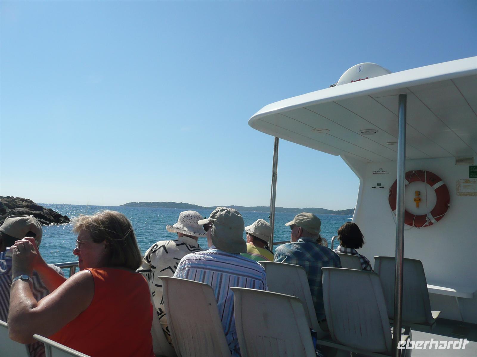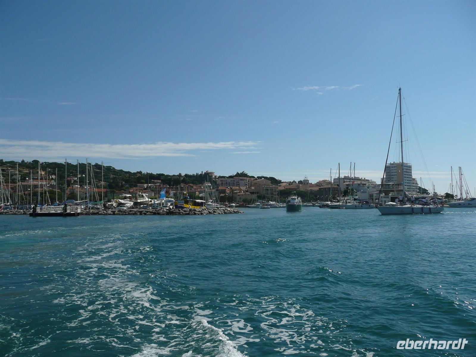 Heute nehmen wir Abschied von unserem Hotel in Mouans-Sartoux und verladen die Koffer nach dem Frühstück. Das erste Ziel am heutigen Tag ist Sainte-Maxime. Der lebhafte Badeort liegt gegenüber von St. Tropez an der Nordseite der Bucht. Im Gegensatz zum benachbarten und exklusiven St. Tropez verbringen hier viele Familien ihren Sommerurlaub. Die Sandstrände sind weitläufig und liegen alle unterhalb der lauten Küstenstraße. Wir steigen am Hafen aus und besorgen das Ticket für die Bootsfahrt nach St. Tropez. Dann treffen wir uns alle am Anleger „Les Bateaux Verts“. Man fühlt sich richtig gut, wenn man auf ein Boot steigt, welches nur für unsere Eberhardt-Reisegäste reserviert ist! Wir legen 10:40 Uhr ab und fahren hinaus auf das tiefblaue