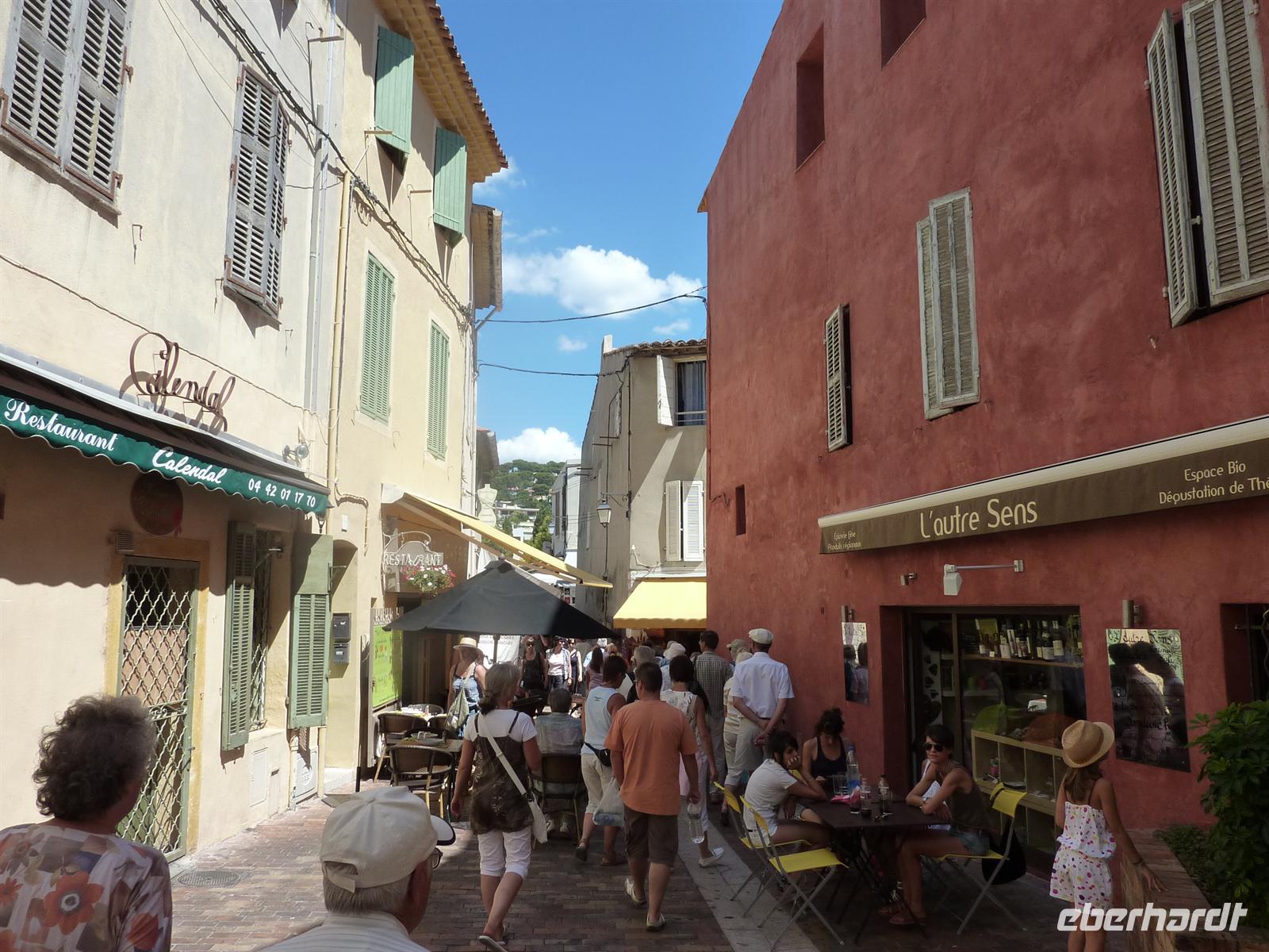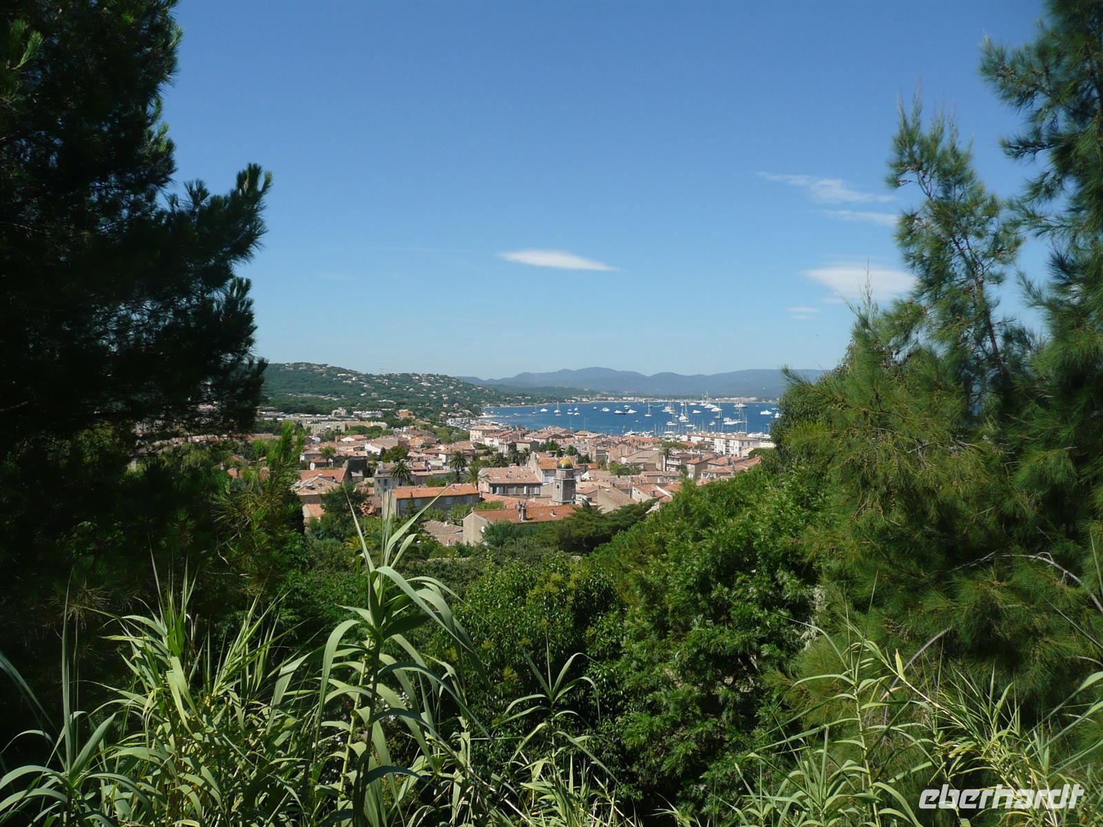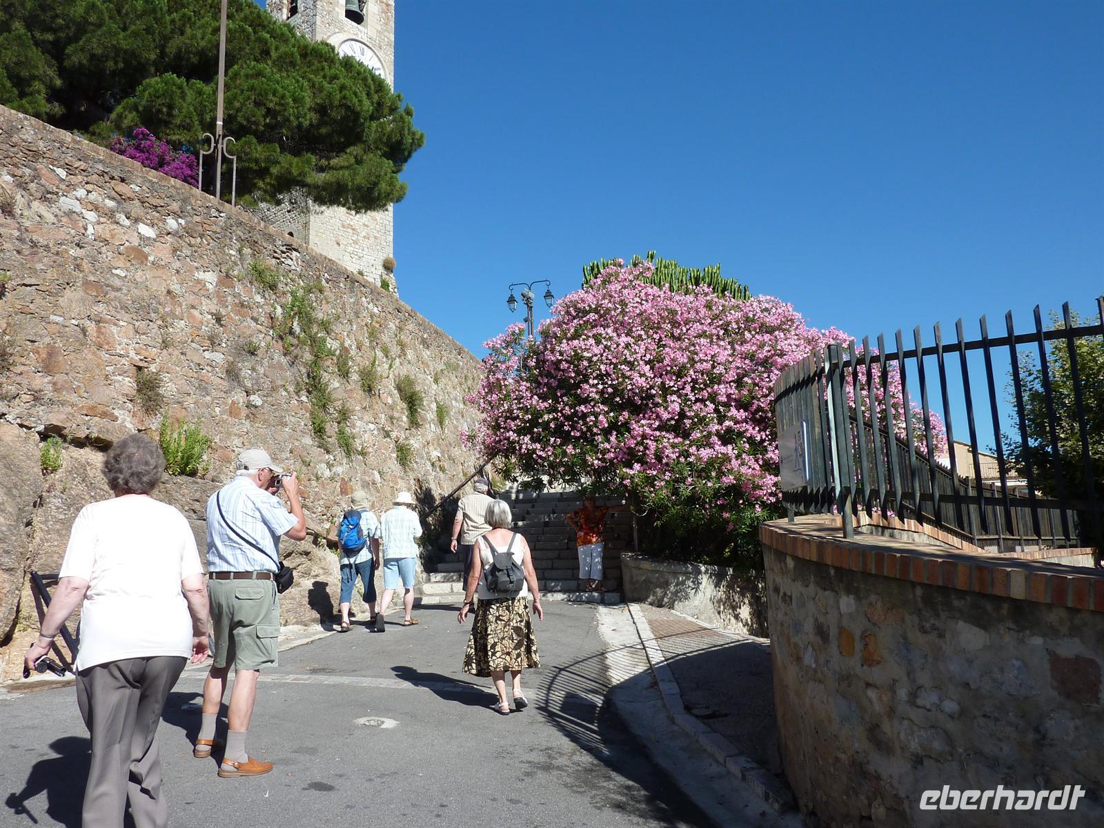 Heute nehmen wir Abschied von unserem Hotel in Mouans-Sartoux und verladen die Koffer nach dem Frühstück. Das erste Ziel am heutigen Tag ist Sainte-Maxime. Der lebhafte Badeort liegt gegenüber von St. Tropez an der Nordseite der Bucht. Im Gegensatz zum benachbarten und exklusiven St. Tropez verbringen hier viele Familien ihren Sommerurlaub. Die Sandstrände sind weitläufig und liegen alle unterhalb der lauten Küstenstraße. Wir steigen am Hafen aus und besorgen das Ticket für die Bootsfahrt nach St. Tropez. Dann treffen wir uns alle am Anleger „Les Bateaux Verts“. Man fühlt sich richtig gut, wenn man auf ein Boot steigt, welches nur für unsere Eberhardt-Reisegäste reserviert ist! Wir legen 10:40 Uhr ab und fahren hinaus auf das tiefblaue