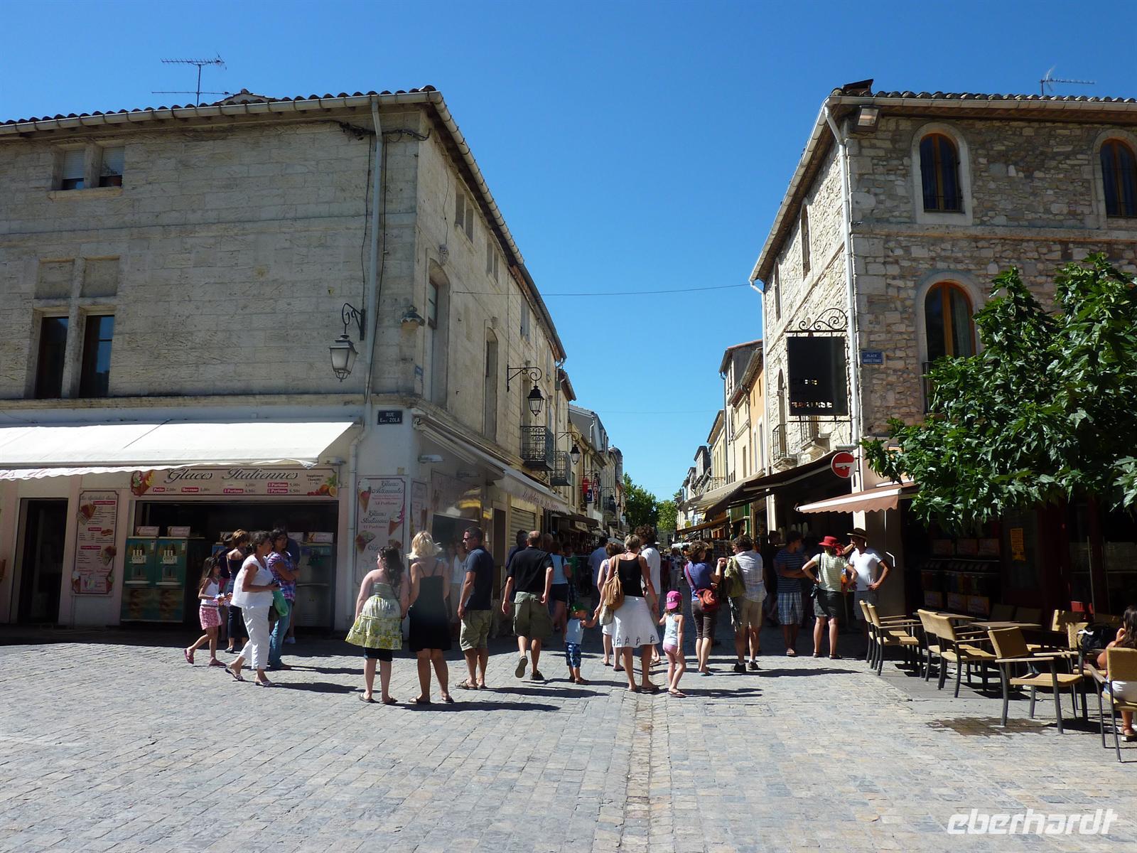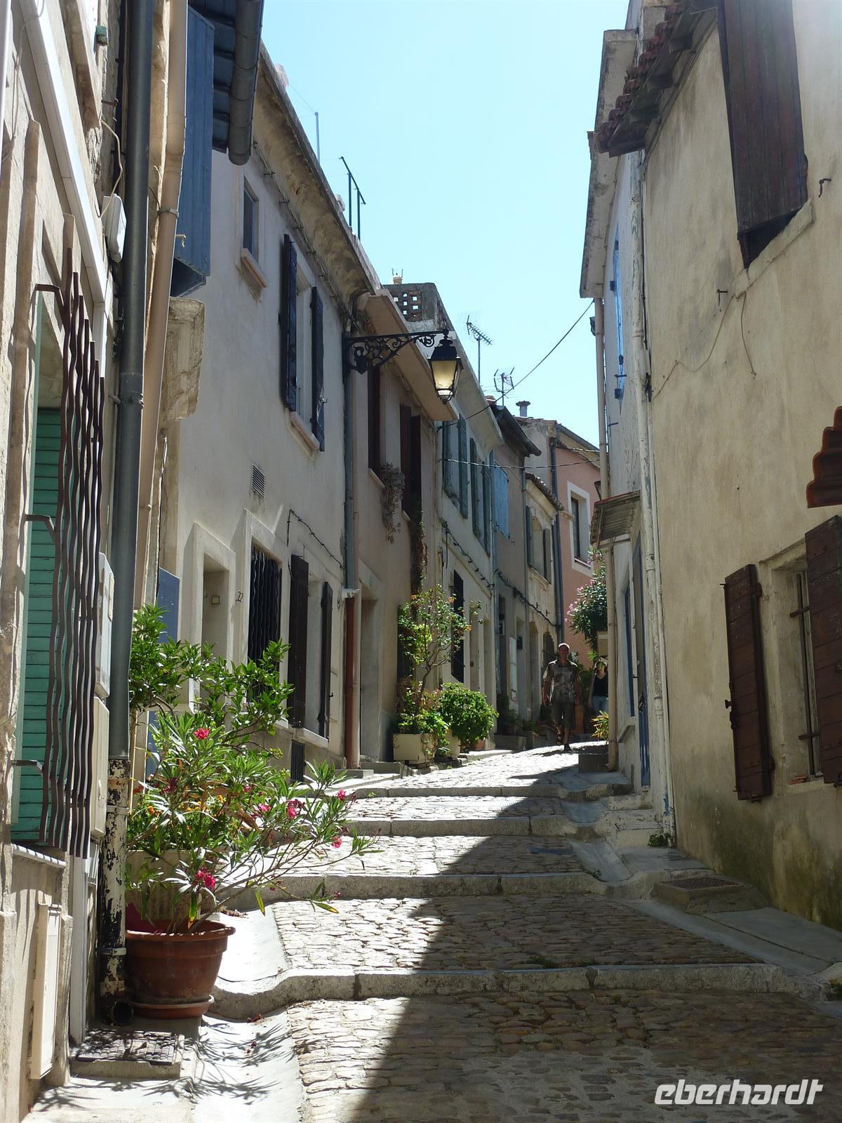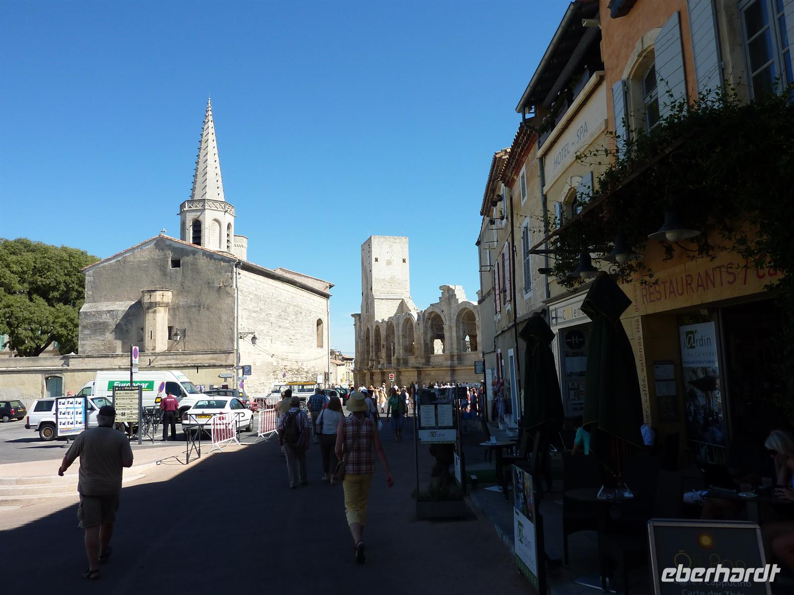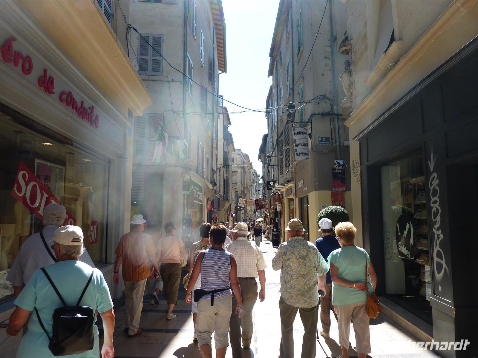 Wasser der Bucht von St. Tropez. Von weitem sehen wir die prunkvollen und luxuriösen Villen der Schönen und Reichen. Zum Beispielt hat Brigitte Bardot hier ein Anwesen auf der Halbinsel vor St. Tropez, auch wenn sie kaum in St. Tropez weilt. Noch immer gilt St. Tropez als Treffpunkt des europäischen Jetsets, wenn sich die Reichen auch seit langem ins Private zurückgezogen haben. Heute zählt man im Ort in den Sommermonaten bis zu 100.000 Touristen am Tag. Wir fahren in den Yachthafen ein und verlassen „unsere“ Yacht. Gleich im Hafen machen wir unser Gruppenfoto, bevor wir mit einem kleinen Stadtrundgang beginnen. Wir sehen die Kirche und machen einen Bummel über den Fischmarkt, bevor wir hinauf zur Zitadelle steigen und den herrlichen Blick über den Ort genießen. Anschließend haben wir Zeit zur freien Verfügung. Einige drängen sich am Hafen durch die Menschenmengen, um die prachtvollen und teuren Yachten zu betrachten, andere sitzen in den kleinen Gassen und lassen sich einen Café au lait schmecken. Dann bekomm ich einen Anruf, dass Roy immer noch auf dem Weg von Sainte-Maxime nach St.Tropez ist, da auf den Straßen in und um St. Tropez ein weitläufiger Stau ist. An der Kirche treffen wir uns dann, um gemeinsam zum neuen Hafen zu gehen. Roy hat sich durch das Verkehrschaos gekämpft und steht zur Abfahrt nach Arles bereit.