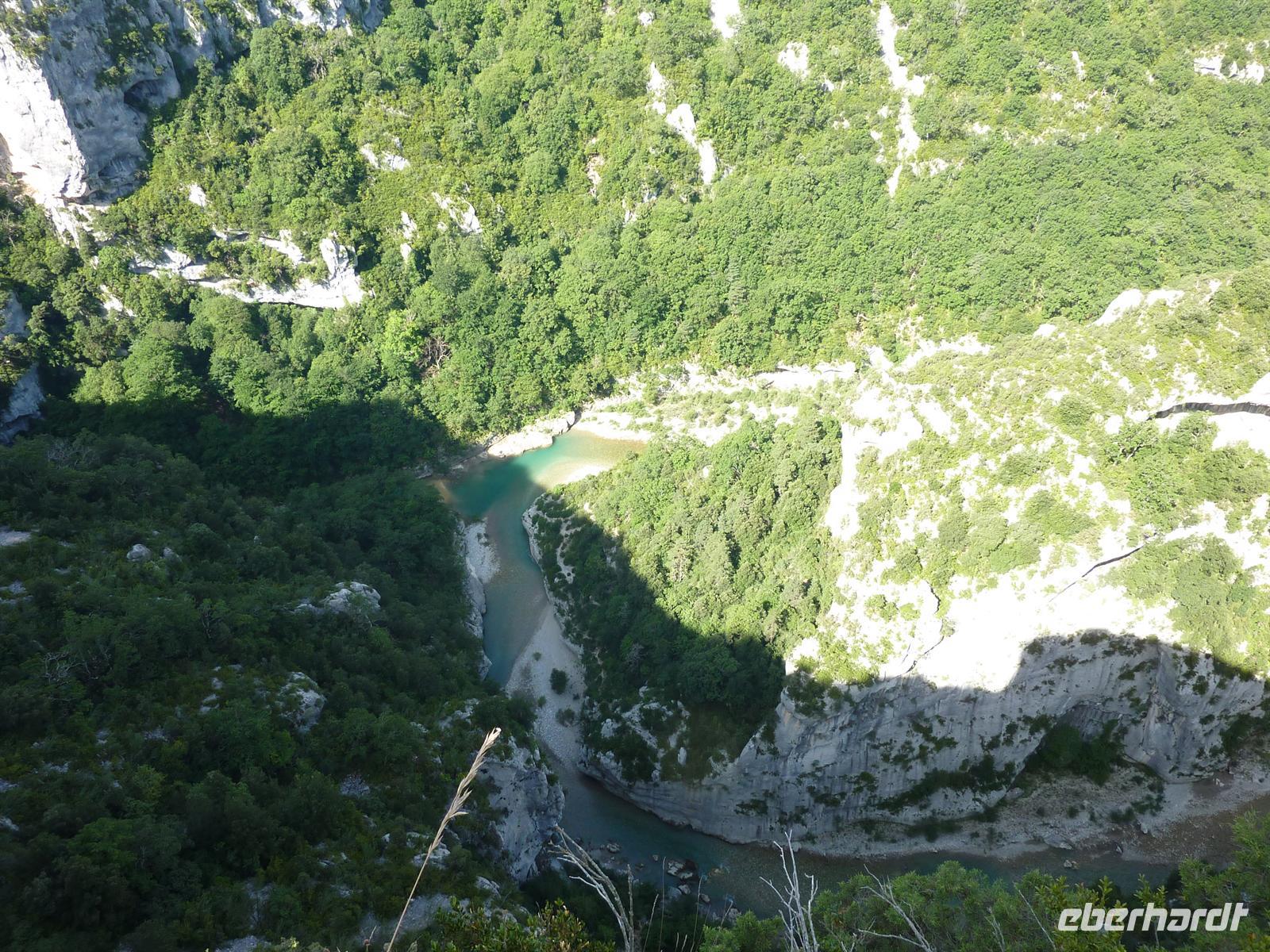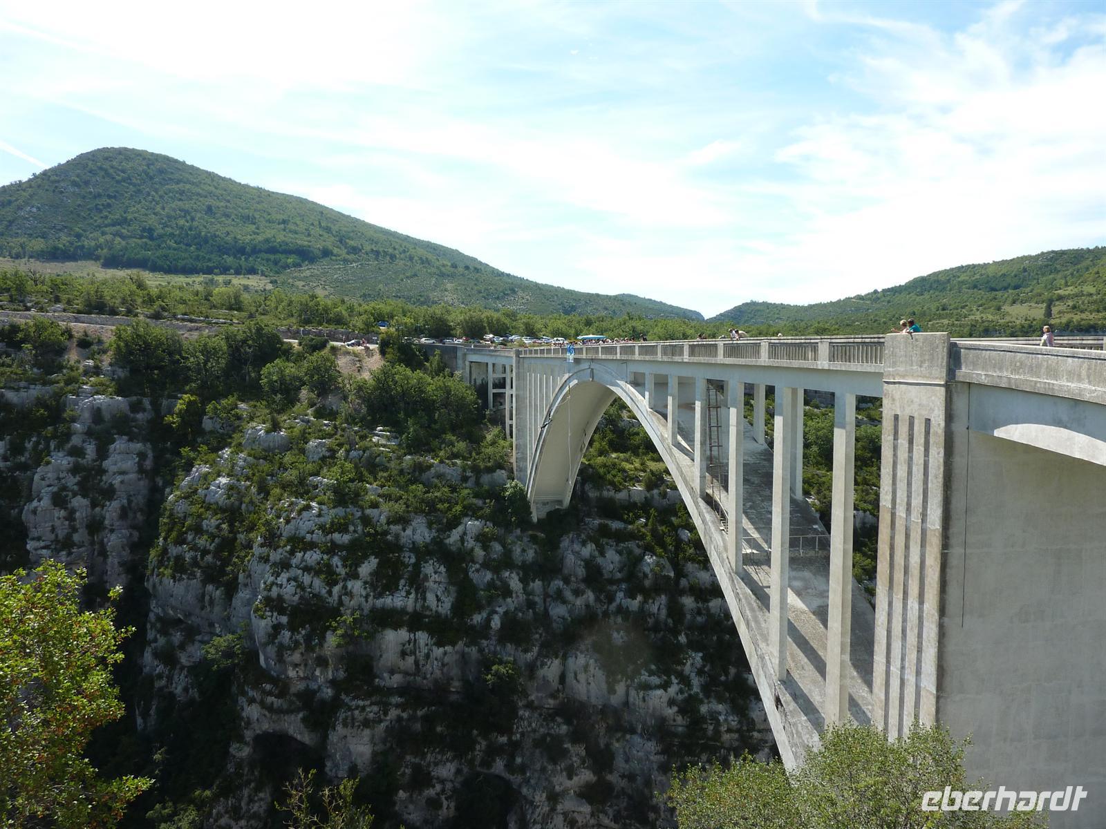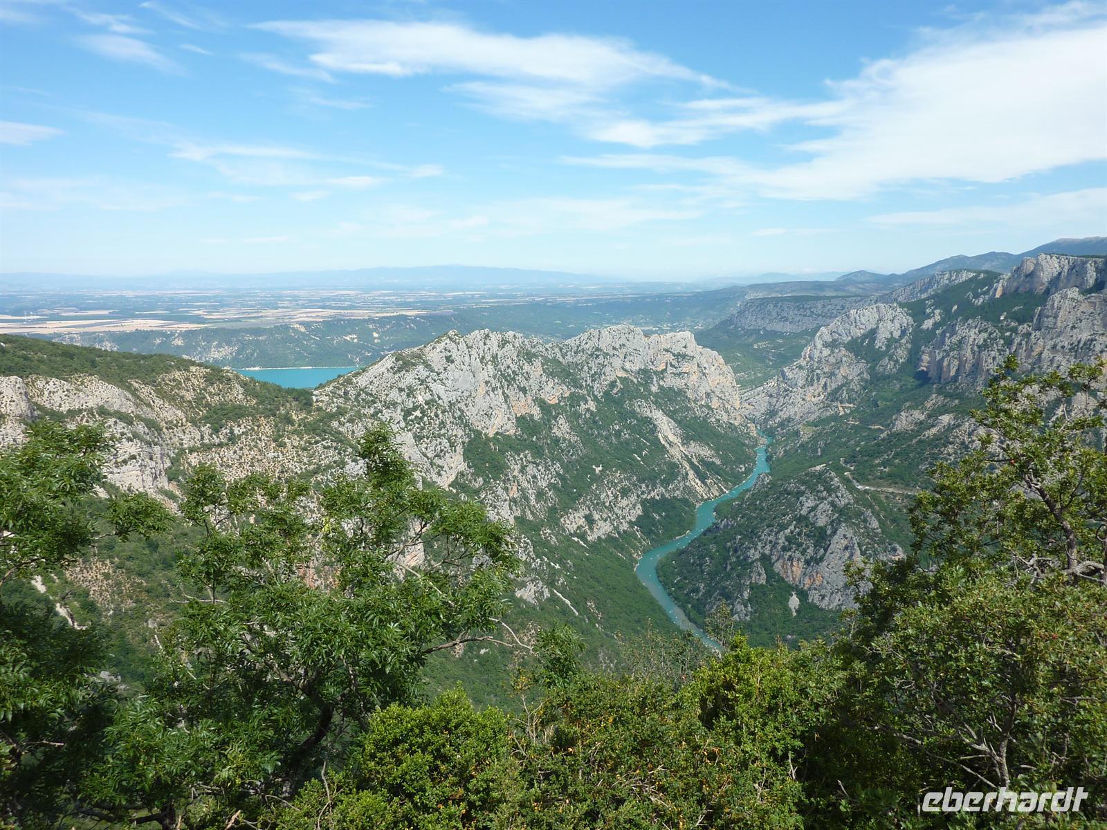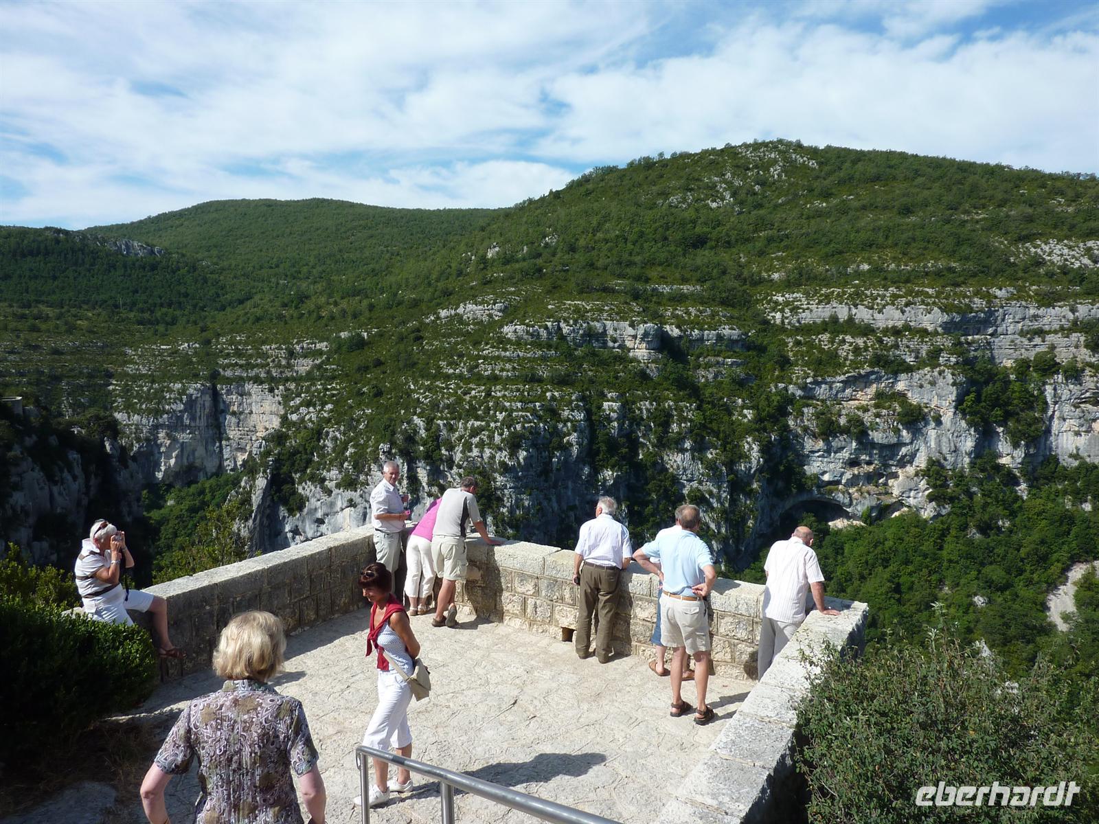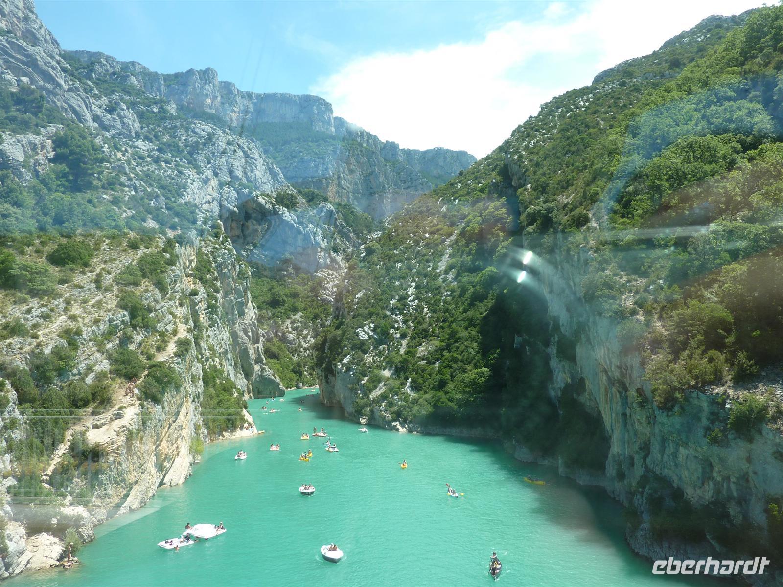 sogenanntes „südländisches Flair“ haben. Anschließend beginnt unsere Panoramafahrt entlang des „rive gauche“ (linkes Ufer). Die engen Straßen entlang des Canyon du Verdon machen die Fahrt mit dem Bus nicht einfach. Doch unser Fahrer Roy hat alles voll im Griff. Bis zu 700 Meter tief hat sich der Fluss Verdon in den uralten Kalkstein eingegraben. Der gigantische, nahezu senkrecht in den Fels geschnittene Graben erstreckt sich über eine Strecke von 21 Kilometern von Rougon bis zum Lac de Ste-Croix. Unseren ersten Fotostopp machen wir am „Balcon de la Mescla“. Von dieser Terrasse fällt der Blick aus 250 Metern auf die Mescla, den Zusammenfluss von Verdon und Artuby. In diesem wildromantischen Rahmen windet sich der Verdon um einen schmalen Felsvorsprung. Nach nur wenigen Metern, aber unzähligen Ausblicken, kommen wir an die Pont de l’Artuby. Auf der Brücke tummeln sich viele Menschen. Und dann sehen wir einen jungen Mann, der an einem Seil befestigt auf dem Geländer steht. Wir kommen gerade richtig, als sich der Wagemutige in die Schluchten stürzt. Es ist für viele ein toller, aber auch Angst einflößender Anblick. Wir halten nach der Brücke an und alle steigen zum Fotografieren aus. Nun klettert der nächste Herr auf die Brüstung und springt in die Schluchten des Canyon du Verdon. Wir fahren weiter und sind von der gewaltigen Landschaft beeindruckt. Nachdem wir uns durch zwei sehr schmale Tunnel zwängten, machen wir unseren nächsten Fotostopp am Tels de Fayet. Von hier hat man einen atemberaubenden Blick auf die Biegung der Schlucht. Dann kennzeichnet eine scharfe Linkskurve die Einfahrt in einen bewaldeten Talkessel. 700 Meter über dem Verdon erreicht die Straße auf 1202 Metern ihren höchsten Punkt. Hier, am Cirque de Vaumale, bietet sich ein schöner Blick auf den Verdon flussabwärts zum Lac de Ste-Croix. Als wir hinunterschauen, sehen wir sehr viele kleine Boote auf dem grünblauen Wasser des Flusses. Nun haben wir ein weiteres, tolles Fotomotiv „im Kasten“. Unsere Fahrt entlang der „Corniche Sublime“ mit ihren vielen Windungen führt uns hinunter nach Aiguines. Da heute ein Markt in der Stadt ist, kämpfen wir uns langsam durch die Menschenmassen und die engen Gassen der Stadt. Am Ortsausgang machen wir unsere Mittagspause an einem Picknickplatz mit einem schönen Blick auf den Lac de Ste-Croix. Dieser See wurde 1975 beim Bau des Staudammes erschaffen. Mit seinem intensiven Blauton lässt er die Landschaft erstrahlen. Am Ende der Schlucht vermischt sich das blaue Wasser des Sees mit dem grünen Wasser des Flusses Verdon. Dort sehen wir dann auch die vielen Tretboote und Kanus, die