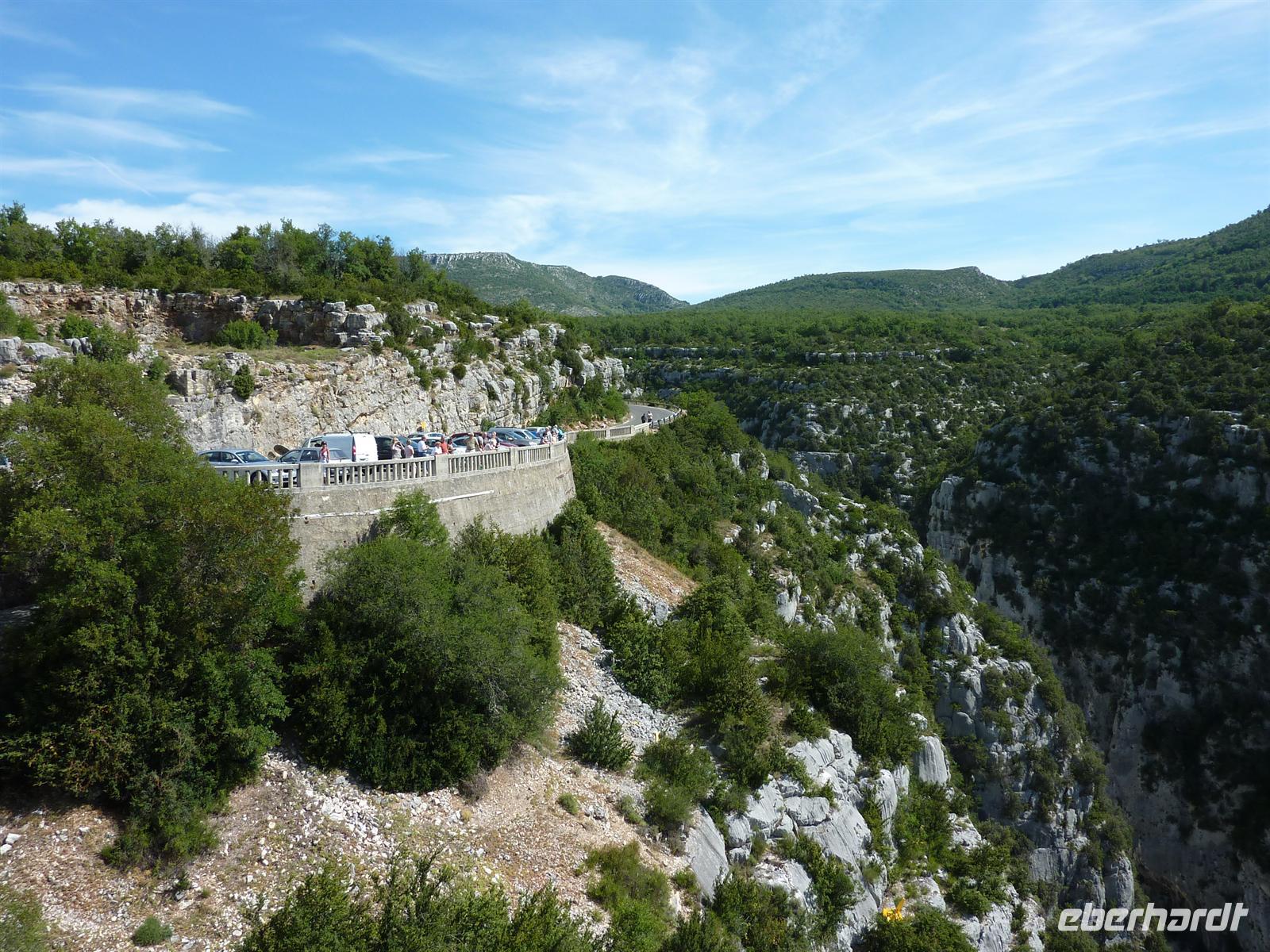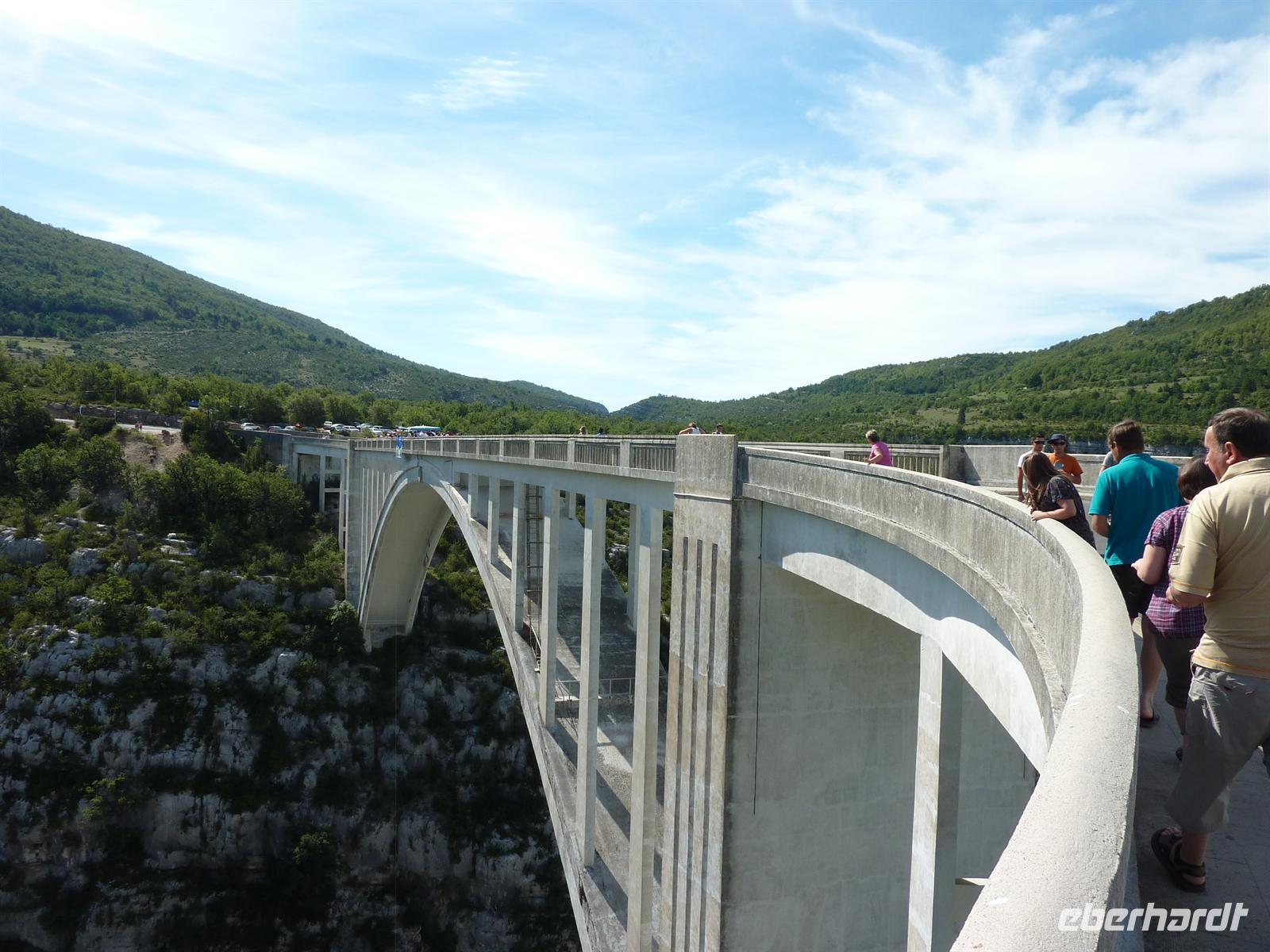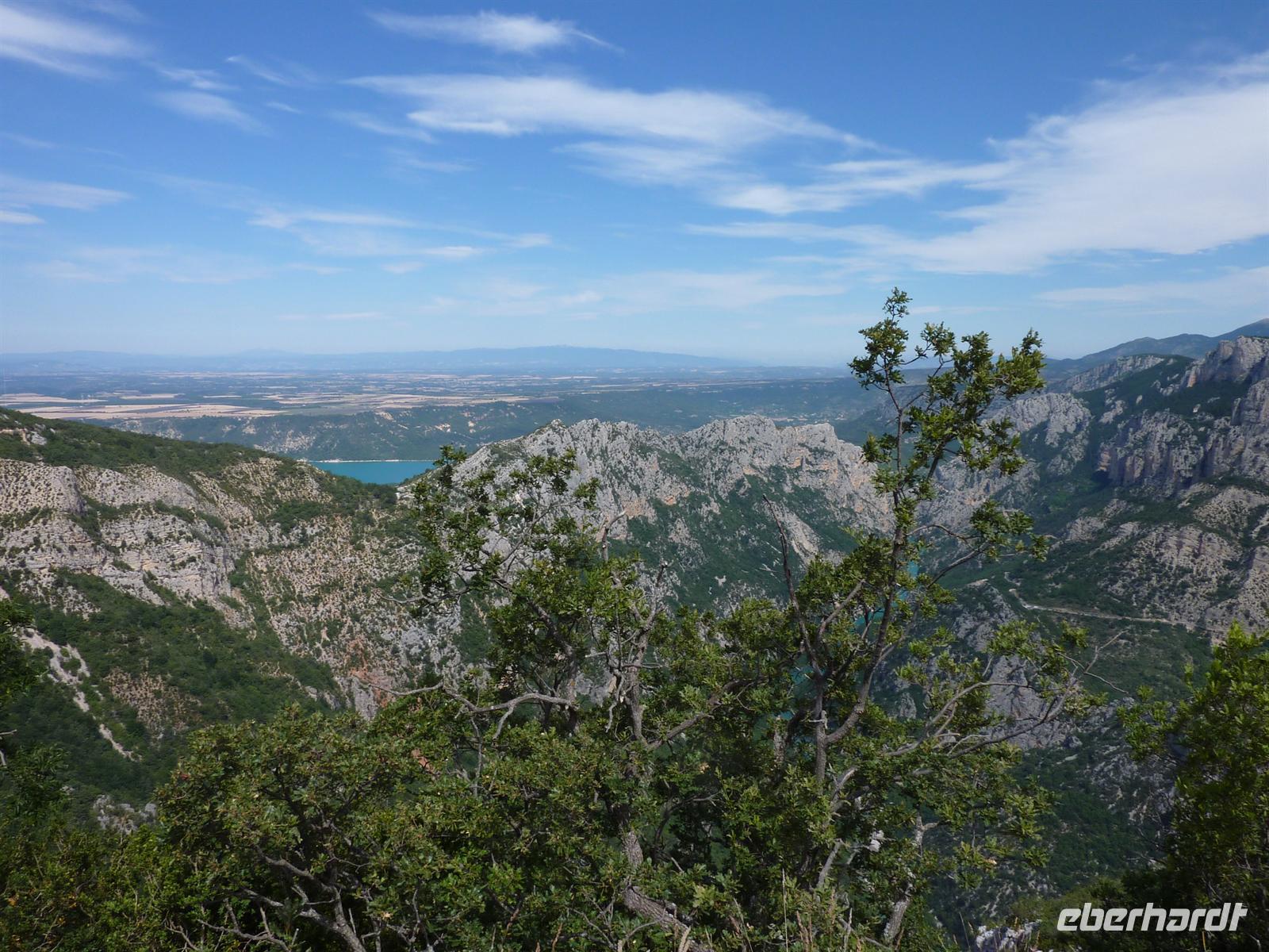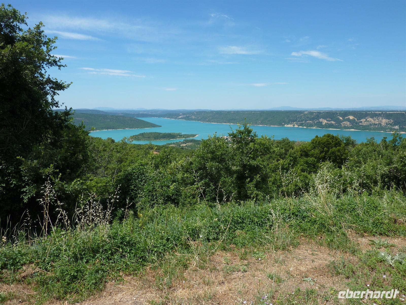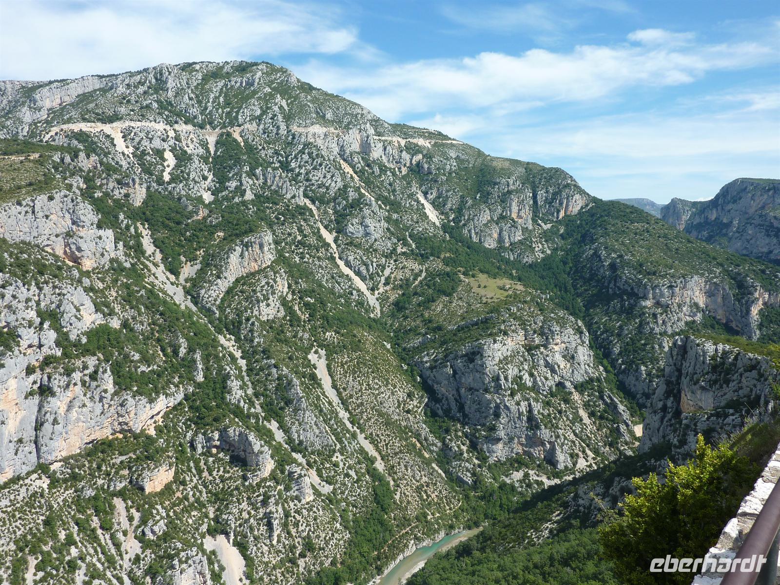 sogenanntes „südländisches Flair“ haben. Anschließend beginnt unsere Panoramafahrt entlang des „rive gauche“ (linkes Ufer). Die engen Straßen entlang des Canyon du Verdon machen die Fahrt mit dem Bus nicht einfach. Doch unser Fahrer Roy hat alles voll im Griff. Bis zu 700 Meter tief hat sich der Fluss Verdon in den uralten Kalkstein eingegraben. Der gigantische, nahezu senkrecht in den Fels geschnittene Graben erstreckt sich über eine Strecke von 21 Kilometern von Rougon bis zum Lac de Ste-Croix. Unseren ersten Fotostopp machen wir am „Balcon de la Mescla“. Von dieser Terrasse fällt der Blick aus 250 Metern auf die Mescla, den Zusammenfluss von Verdon und Artuby. In diesem wildromantischen Rahmen windet sich der Verdon um einen schmalen Felsvorsprung. Nach nur wenigen Metern, aber unzähligen Ausblicken, kommen wir an die Pont de l’Artuby. Auf der Brücke tummeln sich viele Menschen. Und dann sehen wir einen jungen Mann, der an einem Seil befestigt auf dem Geländer steht. Wir kommen gerade richtig, als sich der Wagemutige in die Schluchten stürzt. Es ist für viele ein toller, aber auch Angst einflößender Anblick. Wir halten nach der Brücke an und alle steigen zum Fotografieren aus. Nun klettert der nächste Herr auf die Brüstung und springt in die Schluchten des Canyon du Verdon. Wir fahren weiter und sind von der gewaltigen Landschaft beeindruckt. Nachdem wir uns durch zwei sehr schmale Tunnel zwängten, machen wir unseren nächsten Fotostopp am Tels de Fayet. Von hier hat man einen atemberaubenden Blick auf die Biegung der Schlucht. Dann kennzeichnet eine scharfe Linkskurve die Einfahrt in einen bewaldeten Talkessel. 700 Meter über dem Verdon erreicht die Straße auf 1202 Metern ihren höchsten Punkt. Hier, am Cirque de Vaumale, bietet sich ein schöner Blick auf den Verdon flussabwärts zum Lac de Ste-Croix. Als wir hinunterschauen, sehen wir sehr viele kleine Boote auf dem grünblauen Wasser des Flusses. Nun haben wir ein weiteres, tolles Fotomotiv „im Kasten“. Unsere Fahrt entlang der „Corniche Sublime“ mit ihren vielen Windungen führt uns hinunter nach Aiguines. Da heute ein Markt in der Stadt ist, kämpfen wir uns langsam durch die Menschenmassen und die engen Gassen der Stadt. Am Ortsausgang machen wir unsere Mittagspause an einem Picknickplatz mit einem schönen Blick auf den Lac de Ste-Croix. Dieser See wurde 1975 beim Bau des Staudammes erschaffen. Mit seinem intensiven Blauton lässt er die Landschaft erstrahlen. Am Ende der Schlucht vermischt sich das blaue Wasser des Sees mit dem grünen Wasser des Flusses Verdon. Dort sehen wir dann auch die vielen Tretboote und Kanus, die
