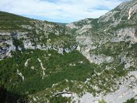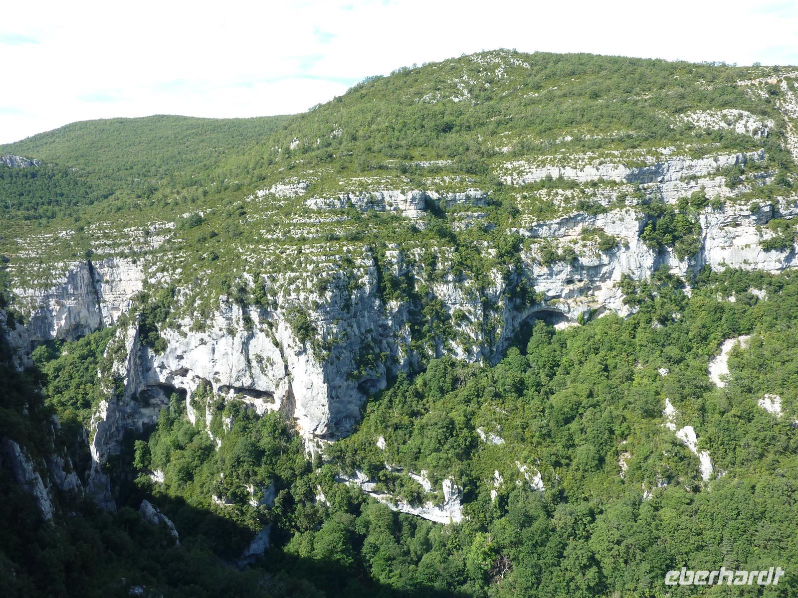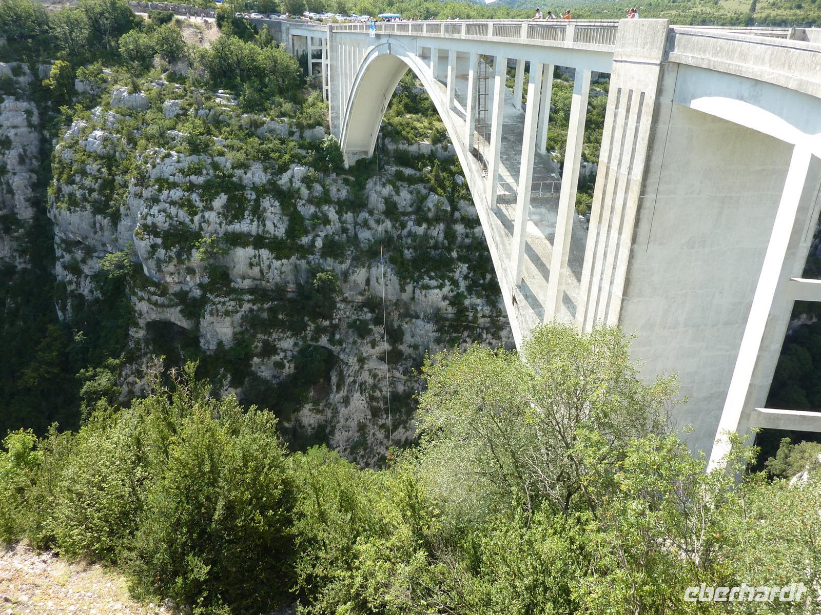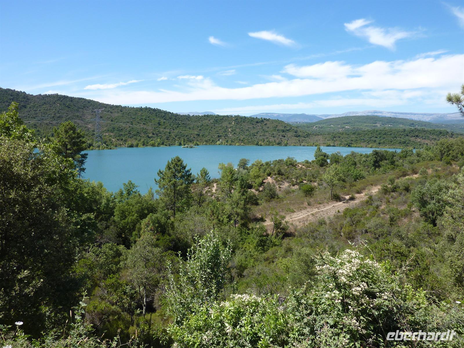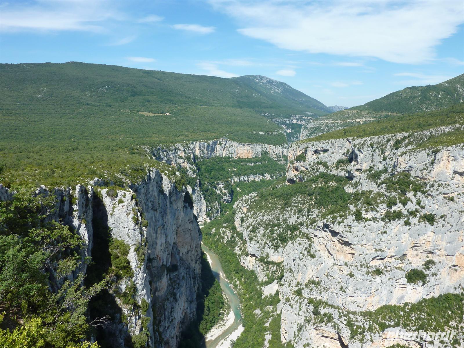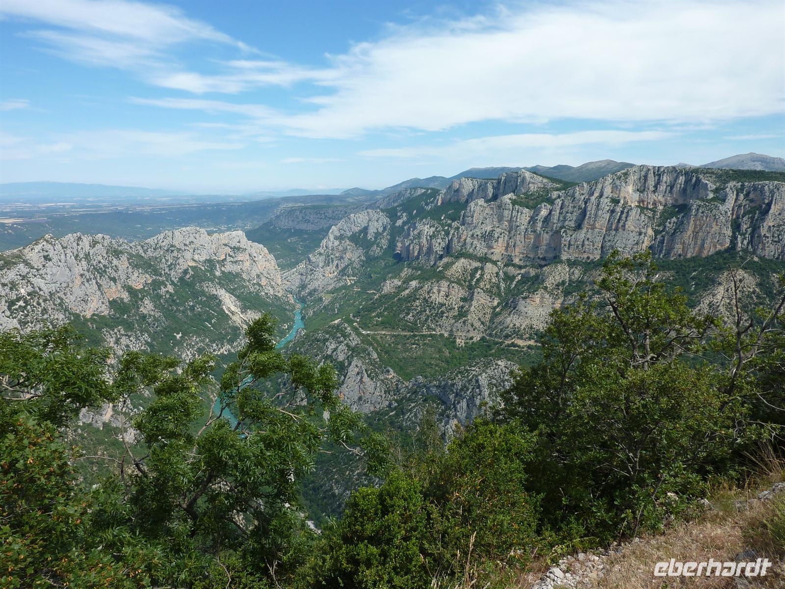 sogenanntes „südländisches Flair“ haben. Anschließend beginnt unsere Panoramafahrt entlang des „rive gauche“ (linkes Ufer). Die engen Straßen entlang des Canyon du Verdon machen die Fahrt mit dem Bus nicht einfach. Doch unser Fahrer Roy hat alles voll im Griff. Bis zu 700 Meter tief hat sich der Fluss Verdon in den uralten Kalkstein eingegraben. Der gigantische, nahezu senkrecht in den Fels geschnittene Graben erstreckt sich über eine Strecke von 21 Kilometern von Rougon bis zum Lac de Ste-Croix. Unseren ersten Fotostopp machen wir am „Balcon de la Mescla“. Von dieser Terrasse fällt der Blick aus 250 Metern auf die Mescla, den Zusammenfluss von Verdon und Artuby. In diesem wildromantischen Rahmen windet sich der Verdon um einen schmalen Felsvorsprung. Nach nur wenigen Metern, aber unzähligen Ausblicken, kommen wir an die Pont de l’Artuby. Auf der Brücke tummeln sich viele Menschen. Und dann sehen wir einen jungen Mann, der an einem Seil befestigt auf dem Geländer steht. Wir kommen gerade richtig, als sich der Wagemutige in die Schluchten stürzt. Es ist für viele ein toller, aber auch Angst einflößender Anblick. Wir halten nach der Brücke an und alle steigen zum Fotografieren aus. Nun klettert der nächste Herr auf die Brüstung und springt in die Schluchten des Canyon du Verdon. Wir fahren weiter und sind von der gewaltigen Landschaft beeindruckt. Nachdem wir uns durch zwei sehr schmale Tunnel zwängten, machen wir unseren nächsten Fotostopp am Tels de Fayet. Von hier hat man einen atemberaubenden Blick auf die Biegung der Schlucht. Dann kennzeichnet eine scharfe Linkskurve die Einfahrt in einen bewaldeten Talkessel. 700 Meter über dem Verdon erreicht die Straße auf 1202 Metern ihren höchsten Punkt. Hier, am Cirque de Vaumale, bietet sich ein schöner Blick auf den Verdon flussabwärts zum Lac de Ste-Croix. Als wir hinunterschauen, sehen wir sehr viele kleine Boote auf dem grünblauen Wasser des Flusses. Nun haben wir ein weiteres, tolles Fotomotiv „im Kasten“. Unsere Fahrt entlang der „Corniche Sublime“ mit ihren vielen Windungen führt uns hinunter nach Aiguines. Da heute ein Markt in der Stadt ist, kämpfen wir uns langsam durch die Menschenmassen und die engen Gassen der Stadt. Am Ortsausgang machen wir unsere Mittagspause an einem Picknickplatz mit einem schönen Blick auf den Lac de Ste-Croix. Dieser See wurde 1975 beim Bau des Staudammes erschaffen. Mit seinem intensiven Blauton lässt er die Landschaft erstrahlen. Am Ende der Schlucht vermischt sich das blaue Wasser des Sees mit dem grünen Wasser des Flusses Verdon. Dort sehen wir dann auch die vielen Tretboote und Kanus, die