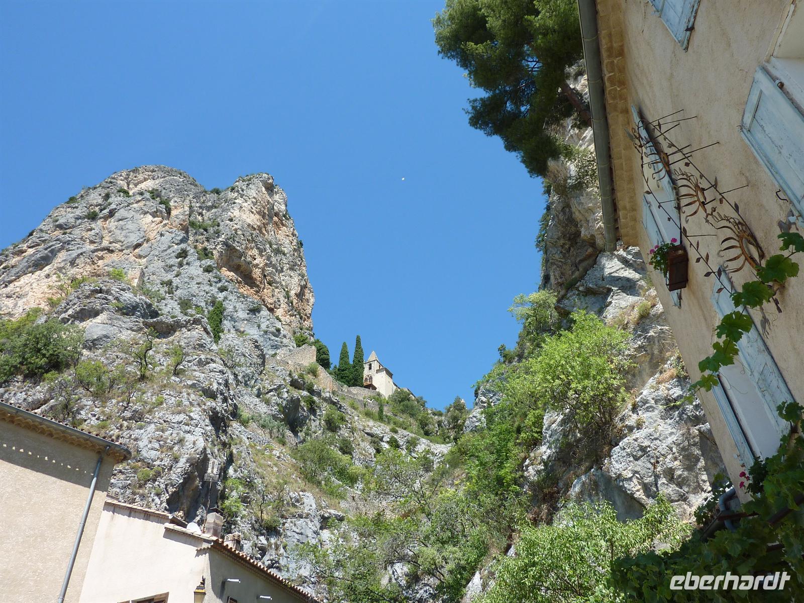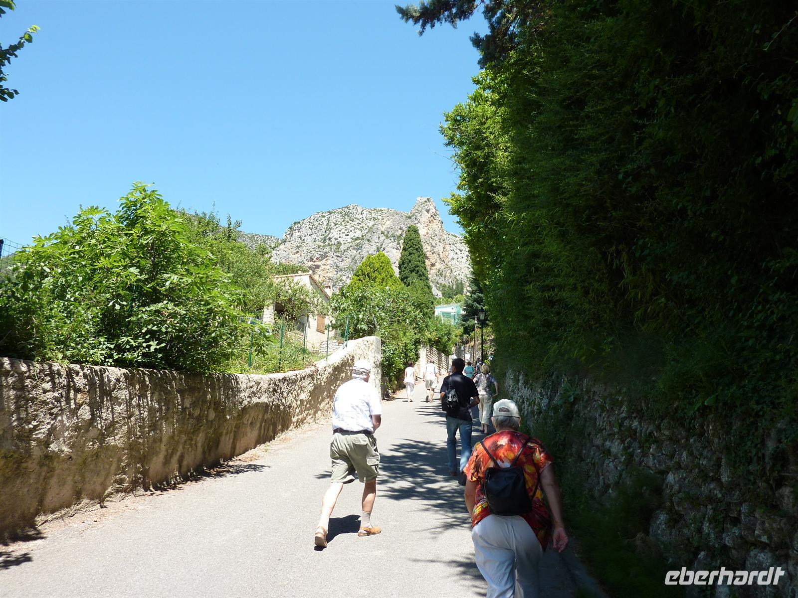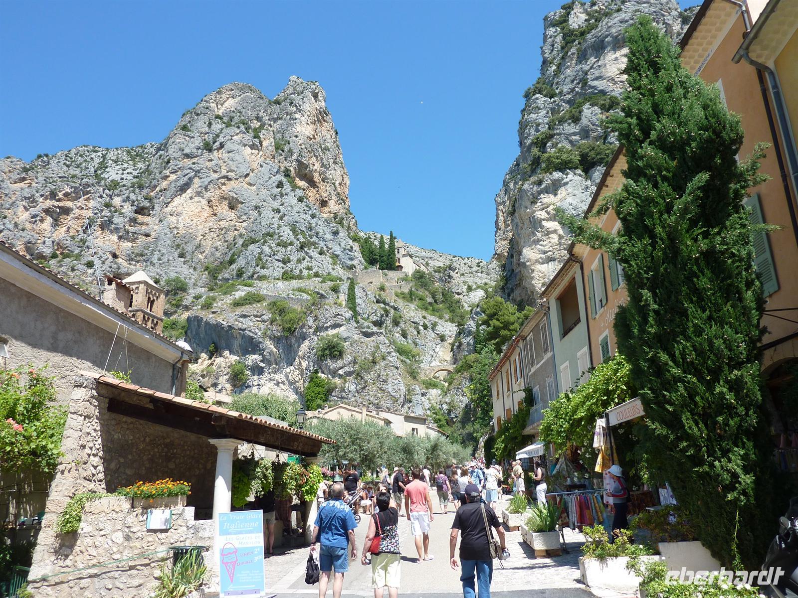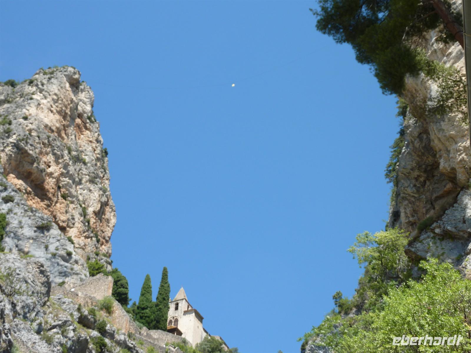 wir bereits vom Cirque de Vaumale aus 700 Metern Höhe erblickten. Auf unserer Fahrt sehen wir links und rechts der Strecke vereinzelt Lavendelbüsche stehen. Doch die Farben der Provence kommen erst richtig zur Geltung, wenn man ein ganzes Lavendelfeld sieht. Wir fahren also auf das Plateau de Valensole und bekommen schon nach wenigen Metern einen wunderschönen Blick auf ein Lavendelfeld. Wir machen kurz Rast und jeder ist von der Schönheit des Lavendelfeldes begeistert. Auf dem Weg nach Moustiers-Ste-Marie halten wir an einer Tankstelle, wo man Lavendelhonig kaufen kann. Moustiers-Ste-Marie ist eine Töpferstadt, die wie ein Amphitheater angelegt wurde. Da wir mit dem Bus nicht in den Ort fahren können, machen wir einen gemeinsamen Spaziergang hinauf in den Ort mit seinen schmalen Gassen und engen Straßen. Bemerkenswert ist die Kapelle Notre-Dame-de-Beauvoir, hoch oben über dem Ort. Von hier aus hat man einen wunderbaren Blick über das Dorf und das Tal. Wahrzeichen von Moustiers aber ist die 227 Meter lange Eisenkette mit einem vergoldeten Stern, die hoch über dem Ort zwischen zwei Felsen angebracht wurde. Sie dient als Erinnerung an die Silberkette, die einst ein Ritter zum Dank für seine Rückkehr aus jahrelanger arabischer Gefangenschaft gestiftet hatte. Hier in Moustiers bleibt uns Zeit, einen Kaffee zu trinken, ein Eis zu lecken, oder durch die Straßen zu bummeln. Dann geht unsere Fahrt weiter in Richtung Castellane. Entlang des Verdon fahren wir durch das beeindruckende Gebiet des Canyons. Die imposanten Abhänge sind nur wenige Zentimeter neben uns. Manchmal bekommen wir es mit der Angst zu tun, wenn uns auf den engen Serpentinen eine Autoschlange entgegen kommt. Aber unser Chauffeur Roy bleibt ganz ruhig und meistert auch diese Situationen mit Bravour. Wir fahren immer weiter hinab und erreichen schließlich Castellane am Ende der Verdon-Schlucht. Das Stadtbild wird bestimmt durch den „Roc“, einen gigantischen Kalkfelsen, auf dessen Höhe die kleine Kapelle „Notre-Dame-du-Roc“ thront. Hier machen wir im Zentrum eine kurze Rast, bevor es wieder zurück nach Mouans-Sartoux zum Hotel geht. Wir fahren wieder über die Route Napoléon nach Grasse und von dort aus nach Mouans-Sartoux. Mit vielen Eindrücken und beeindruckenden Bildern erreichen wir unser Hotel, wo wir auch gleich zum gemeinsamen Abendessen eintreffen. Heute gibt es als Vorspeise Tomate-Mozarella, als Hauptgang Schweinebraten in Tomatensoße und Nudeln und als Nachtisch einen erfrischenden Obstsalat.