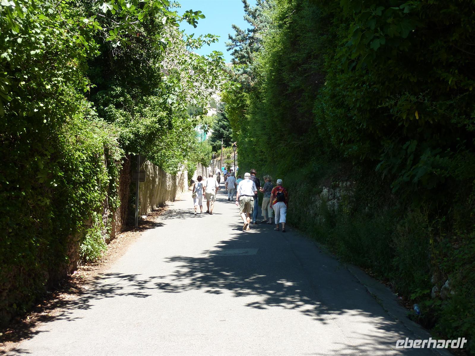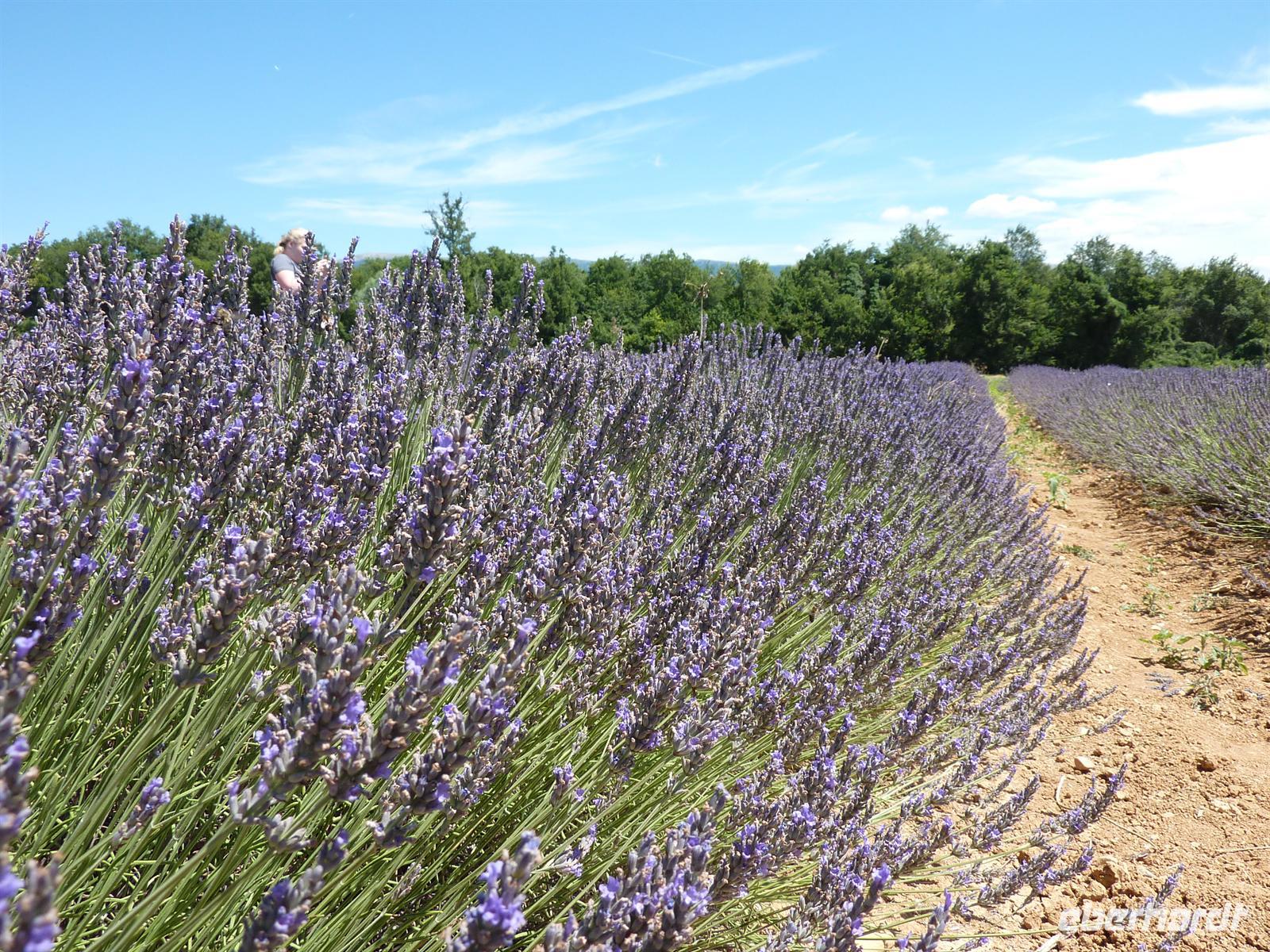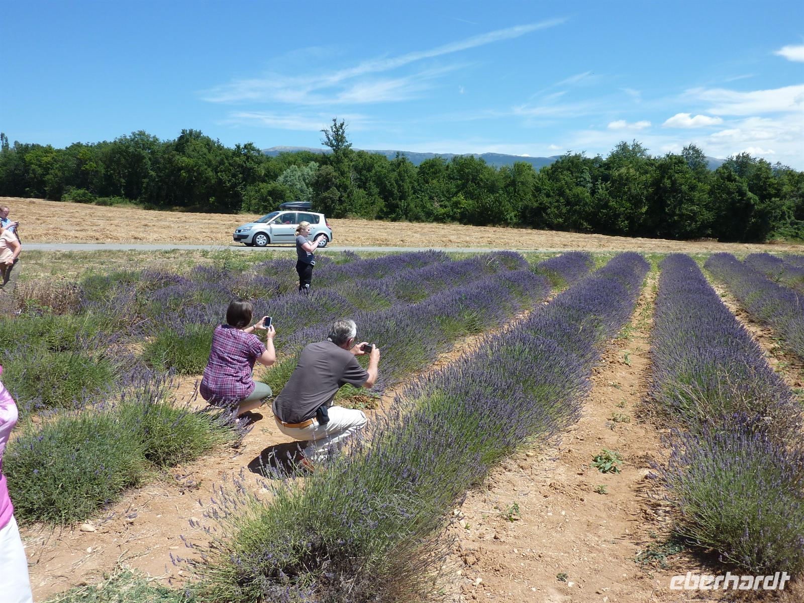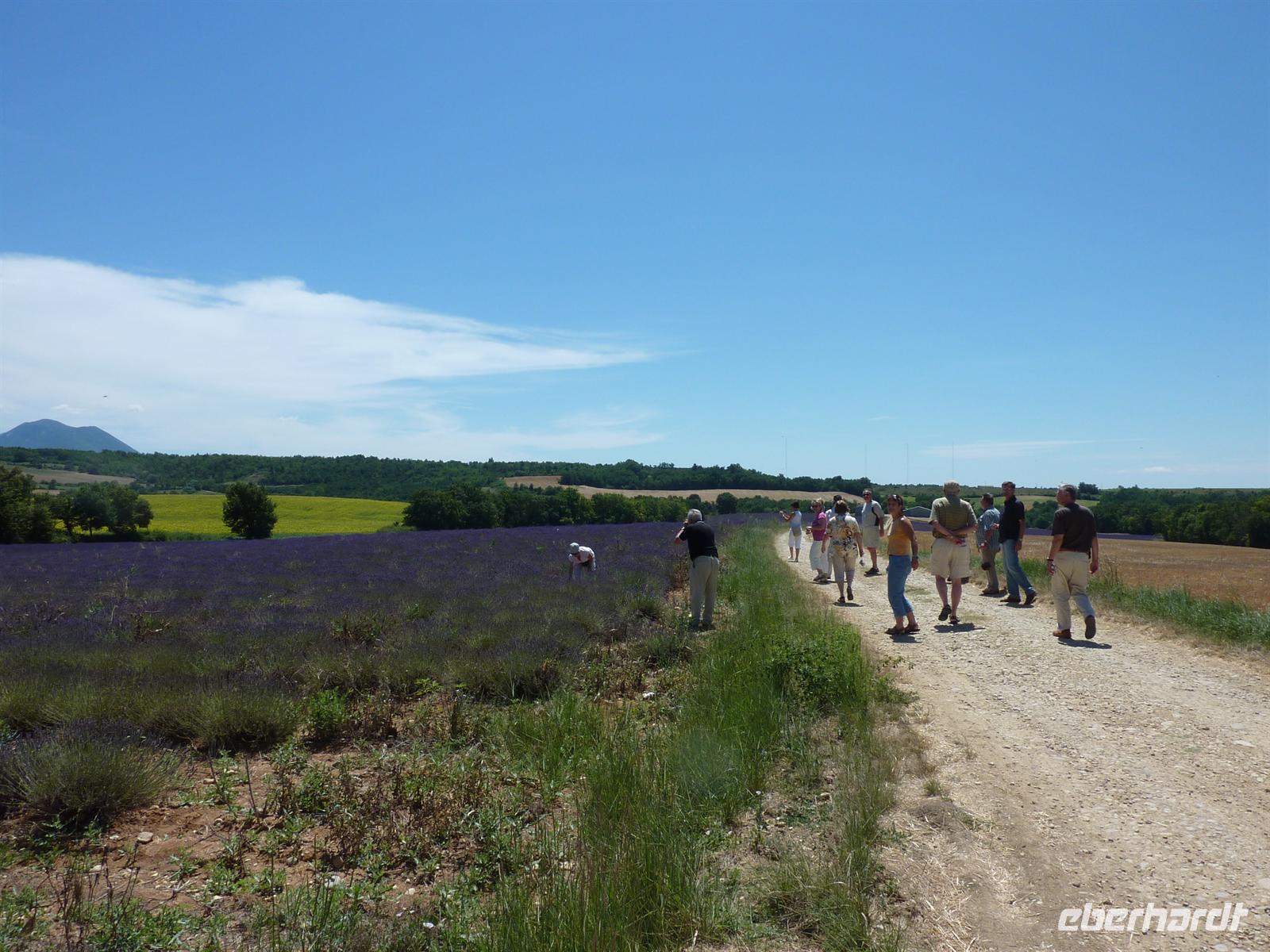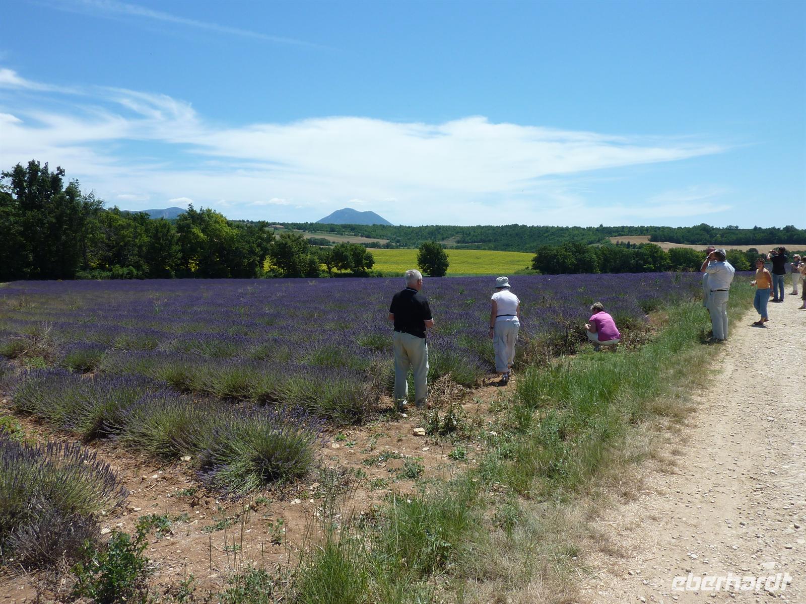 wir bereits vom Cirque de Vaumale aus 700 Metern Höhe erblickten. Auf unserer Fahrt sehen wir links und rechts der Strecke vereinzelt Lavendelbüsche stehen. Doch die Farben der Provence kommen erst richtig zur Geltung, wenn man ein ganzes Lavendelfeld sieht. Wir fahren also auf das Plateau de Valensole und bekommen schon nach wenigen Metern einen wunderschönen Blick auf ein Lavendelfeld. Wir machen kurz Rast und jeder ist von der Schönheit des Lavendelfeldes begeistert. Auf dem Weg nach Moustiers-Ste-Marie halten wir an einer Tankstelle, wo man Lavendelhonig kaufen kann. Moustiers-Ste-Marie ist eine Töpferstadt, die wie ein Amphitheater angelegt wurde. Da wir mit dem Bus nicht in den Ort fahren können, machen wir einen gemeinsamen Spaziergang hinauf in den Ort mit seinen schmalen Gassen und engen Straßen. Bemerkenswert ist die Kapelle Notre-Dame-de-Beauvoir, hoch oben über dem Ort. Von hier aus hat man einen wunderbaren Blick über das Dorf und das Tal. Wahrzeichen von Moustiers aber ist die 227 Meter lange Eisenkette mit einem vergoldeten Stern, die hoch über dem Ort zwischen zwei Felsen angebracht wurde. Sie dient als Erinnerung an die Silberkette, die einst ein Ritter zum Dank für seine Rückkehr aus jahrelanger arabischer Gefangenschaft gestiftet hatte. Hier in Moustiers bleibt uns Zeit, einen Kaffee zu trinken, ein Eis zu lecken, oder durch die Straßen zu bummeln. Dann geht unsere Fahrt weiter in Richtung Castellane. Entlang des Verdon fahren wir durch das beeindruckende Gebiet des Canyons. Die imposanten Abhänge sind nur wenige Zentimeter neben uns. Manchmal bekommen wir es mit der Angst zu tun, wenn uns auf den engen Serpentinen eine Autoschlange entgegen kommt. Aber unser Chauffeur Roy bleibt ganz ruhig und meistert auch diese Situationen mit Bravour. Wir fahren immer weiter hinab und erreichen schließlich Castellane am Ende der Verdon-Schlucht. Das Stadtbild wird bestimmt durch den „Roc“, einen gigantischen Kalkfelsen, auf dessen Höhe die kleine Kapelle „Notre-Dame-du-Roc“ thront. Hier machen wir im Zentrum eine kurze Rast, bevor es wieder zurück nach Mouans-Sartoux zum Hotel geht. Wir fahren wieder über die Route Napoléon nach Grasse und von dort aus nach Mouans-Sartoux. Mit vielen Eindrücken und beeindruckenden Bildern erreichen wir unser Hotel, wo wir auch gleich zum gemeinsamen Abendessen eintreffen. Heute gibt es als Vorspeise Tomate-Mozarella, als Hauptgang Schweinebraten in Tomatensoße und Nudeln und als Nachtisch einen erfrischenden Obstsalat.