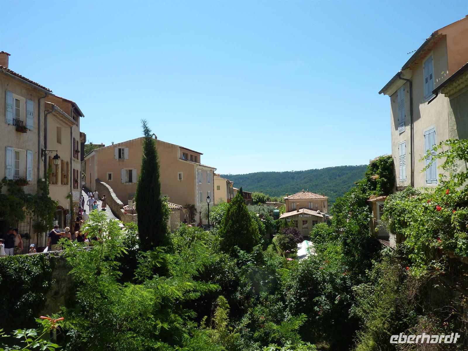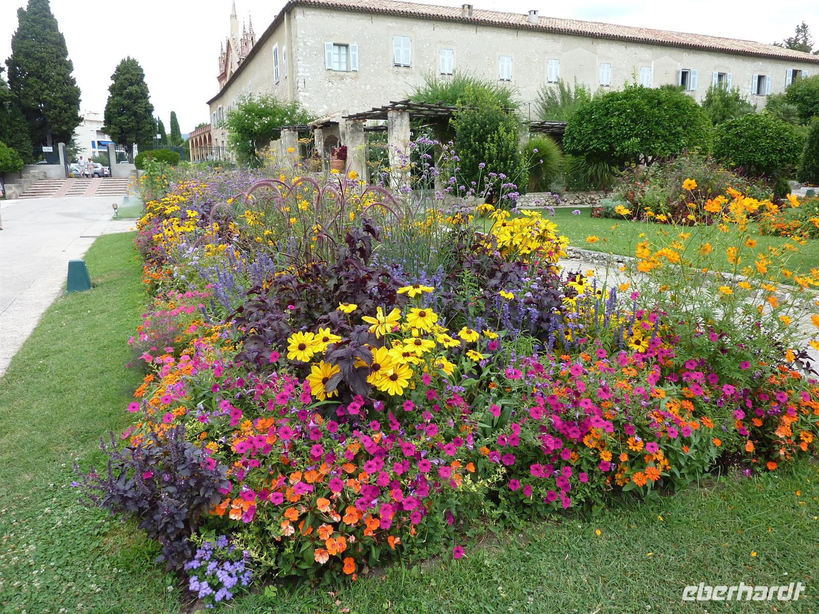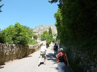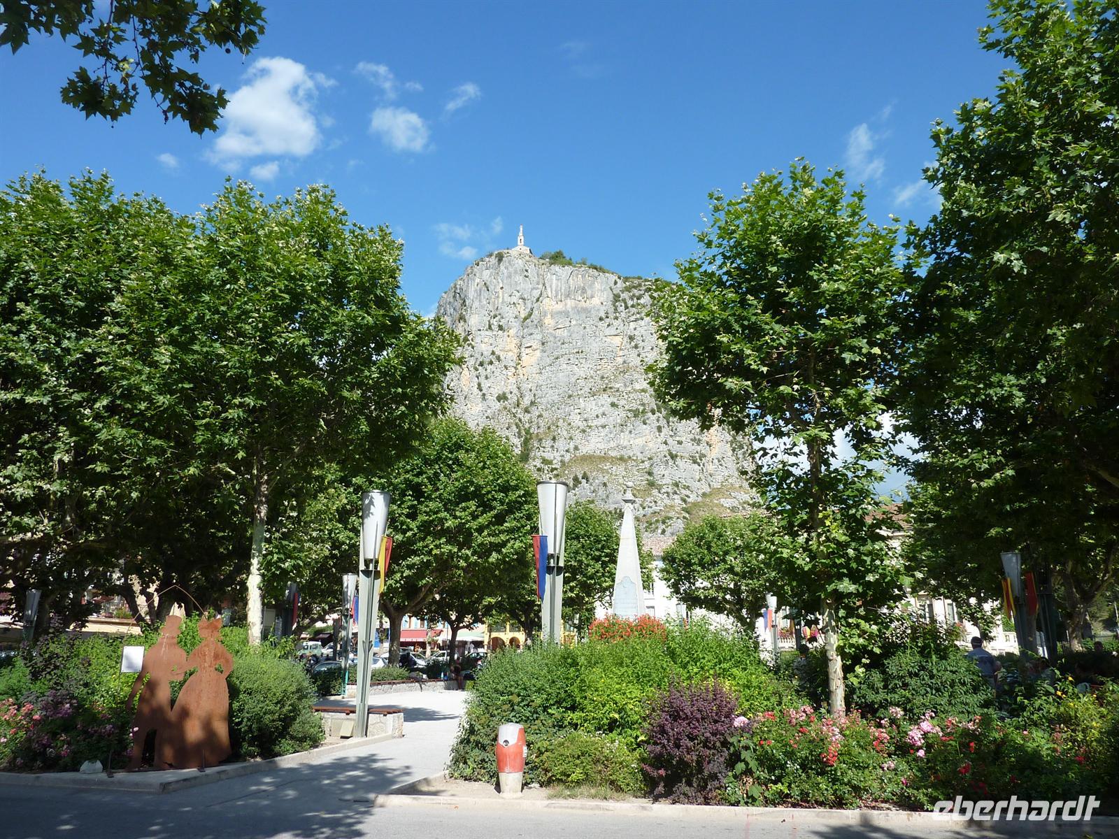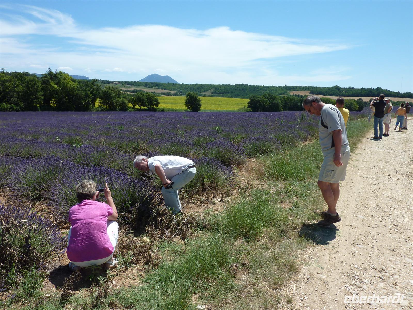 wir bereits vom Cirque de Vaumale aus 700 Metern Höhe erblickten. Auf unserer Fahrt sehen wir links und rechts der Strecke vereinzelt Lavendelbüsche stehen. Doch die Farben der Provence kommen erst richtig zur Geltung, wenn man ein ganzes Lavendelfeld sieht. Wir fahren also auf das Plateau de Valensole und bekommen schon nach wenigen Metern einen wunderschönen Blick auf ein Lavendelfeld. Wir machen kurz Rast und jeder ist von der Schönheit des Lavendelfeldes begeistert. Auf dem Weg nach Moustiers-Ste-Marie halten wir an einer Tankstelle, wo man Lavendelhonig kaufen kann. Moustiers-Ste-Marie ist eine Töpferstadt, die wie ein Amphitheater angelegt wurde. Da wir mit dem Bus nicht in den Ort fahren können, machen wir einen gemeinsamen Spaziergang hinauf in den Ort mit seinen schmalen Gassen und engen Straßen. Bemerkenswert ist die Kapelle Notre-Dame-de-Beauvoir, hoch oben über dem Ort. Von hier aus hat man einen wunderbaren Blick über das Dorf und das Tal. Wahrzeichen von Moustiers aber ist die 227 Meter lange Eisenkette mit einem vergoldeten Stern, die hoch über dem Ort zwischen zwei Felsen angebracht wurde. Sie dient als Erinnerung an die Silberkette, die einst ein Ritter zum Dank für seine Rückkehr aus jahrelanger arabischer Gefangenschaft gestiftet hatte. Hier in Moustiers bleibt uns Zeit, einen Kaffee zu trinken, ein Eis zu lecken, oder durch die Straßen zu bummeln. Dann geht unsere Fahrt weiter in Richtung Castellane. Entlang des Verdon fahren wir durch das beeindruckende Gebiet des Canyons. Die imposanten Abhänge sind nur wenige Zentimeter neben uns. Manchmal bekommen wir es mit der Angst zu tun, wenn uns auf den engen Serpentinen eine Autoschlange entgegen kommt. Aber unser Chauffeur Roy bleibt ganz ruhig und meistert auch diese Situationen mit Bravour. Wir fahren immer weiter hinab und erreichen schließlich Castellane am Ende der Verdon-Schlucht. Das Stadtbild wird bestimmt durch den „Roc“, einen gigantischen Kalkfelsen, auf dessen Höhe die kleine Kapelle „Notre-Dame-du-Roc“ thront. Hier machen wir im Zentrum eine kurze Rast, bevor es wieder zurück nach Mouans-Sartoux zum Hotel geht. Wir fahren wieder über die Route Napoléon nach Grasse und von dort aus nach Mouans-Sartoux. Mit vielen Eindrücken und beeindruckenden Bildern erreichen wir unser Hotel, wo wir auch gleich zum gemeinsamen Abendessen eintreffen. Heute gibt es als Vorspeise Tomate-Mozarella, als Hauptgang Schweinebraten in Tomatensoße und Nudeln und als Nachtisch einen erfrischenden Obstsalat.