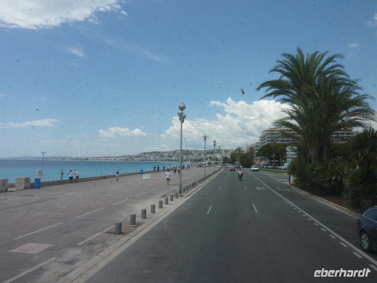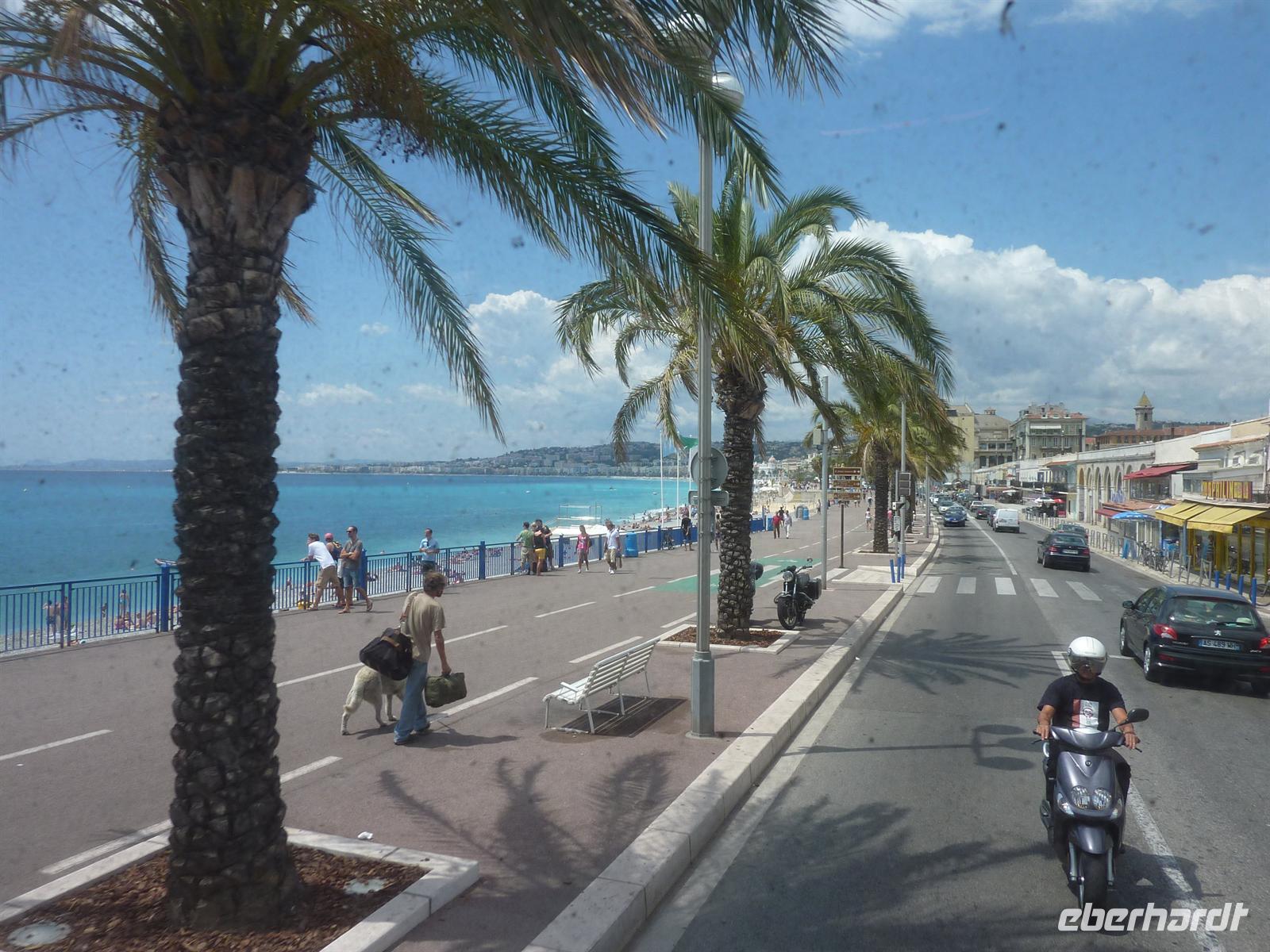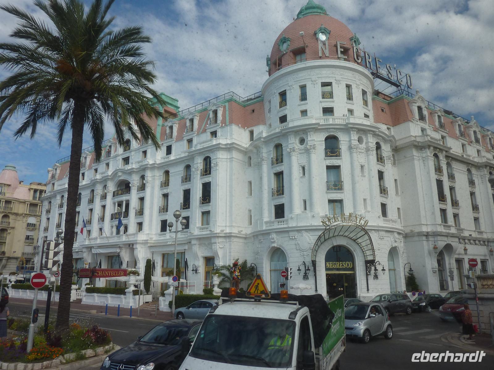 Der heutige Tag steht ganz im Zeichen der großen Stadt Nizza und dem Fürstentum Monaco. Wir frühstücken heute bereits etwas zeitiger, da wir pünktlich um 9 Uhr in Nizza sein müssen. Wir fahren vom Hotel in die größte Stadt an der Côte d’Azur - Nizza! Entlang der Promenade des Anglais fahren wir bis zum Nobelhotel Negresco, wo unsere beiden örtlichen Reiseleiterinnen Doris und Christel einsteigen. Die Promenade des Anglais, einstige Prachtstraße am Meer, ist noch immer Aushängeschild und Wahrzeichen der Stadt, ist aber inzwischen auch eine Hauptverkehrsstraße geworden. Sie beginnt etwa in Höhe des Flughafens Nice-Côte d’Azur und erstreckt sich bis in die Altstadt. Das Hotel „Negreco“ vermittelt noch immer einen Widerschein jener glanzvollen Epoche, als Englands Ladies und Lords hier im lauen Mittelmeerwinter unter Palmen und Sonnenschirmen flanierten. Die Promenade des Anglais entstand übrigens ab 1849 als Ergebnis einer Arbeitsbeschaffungsmaßnahme. Der englische Pastor Lewis Way ließ sie mit Kollektengeldern bauen, um der Arbeitslosigkeit in jenen Jahren entgegenzuwirken. Zuvor gab es hier nur einen schmalen Ufersteg.