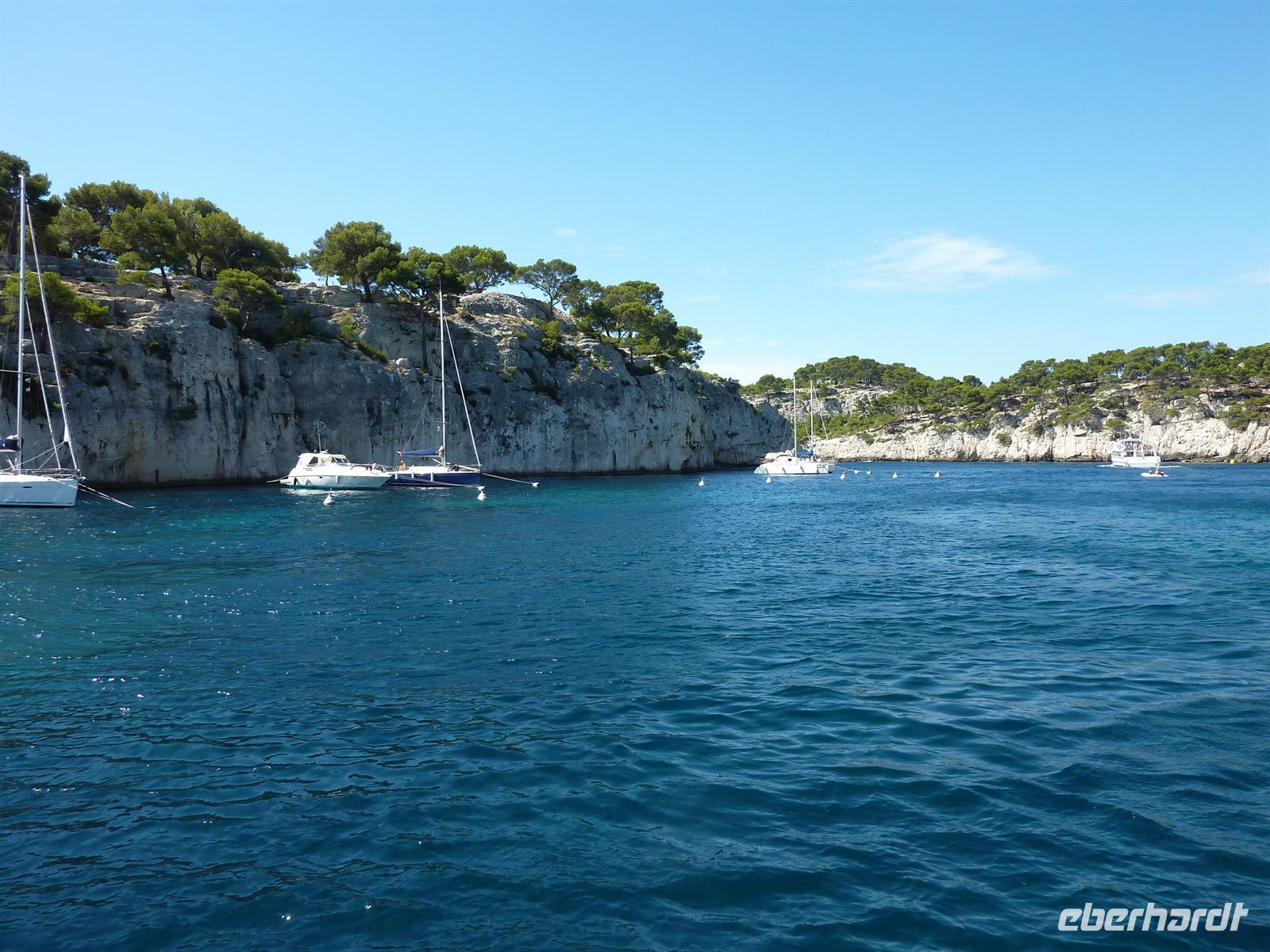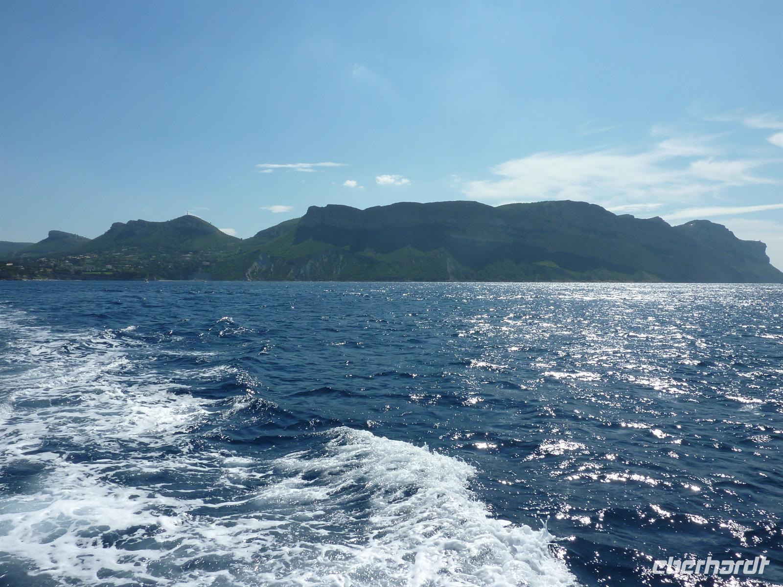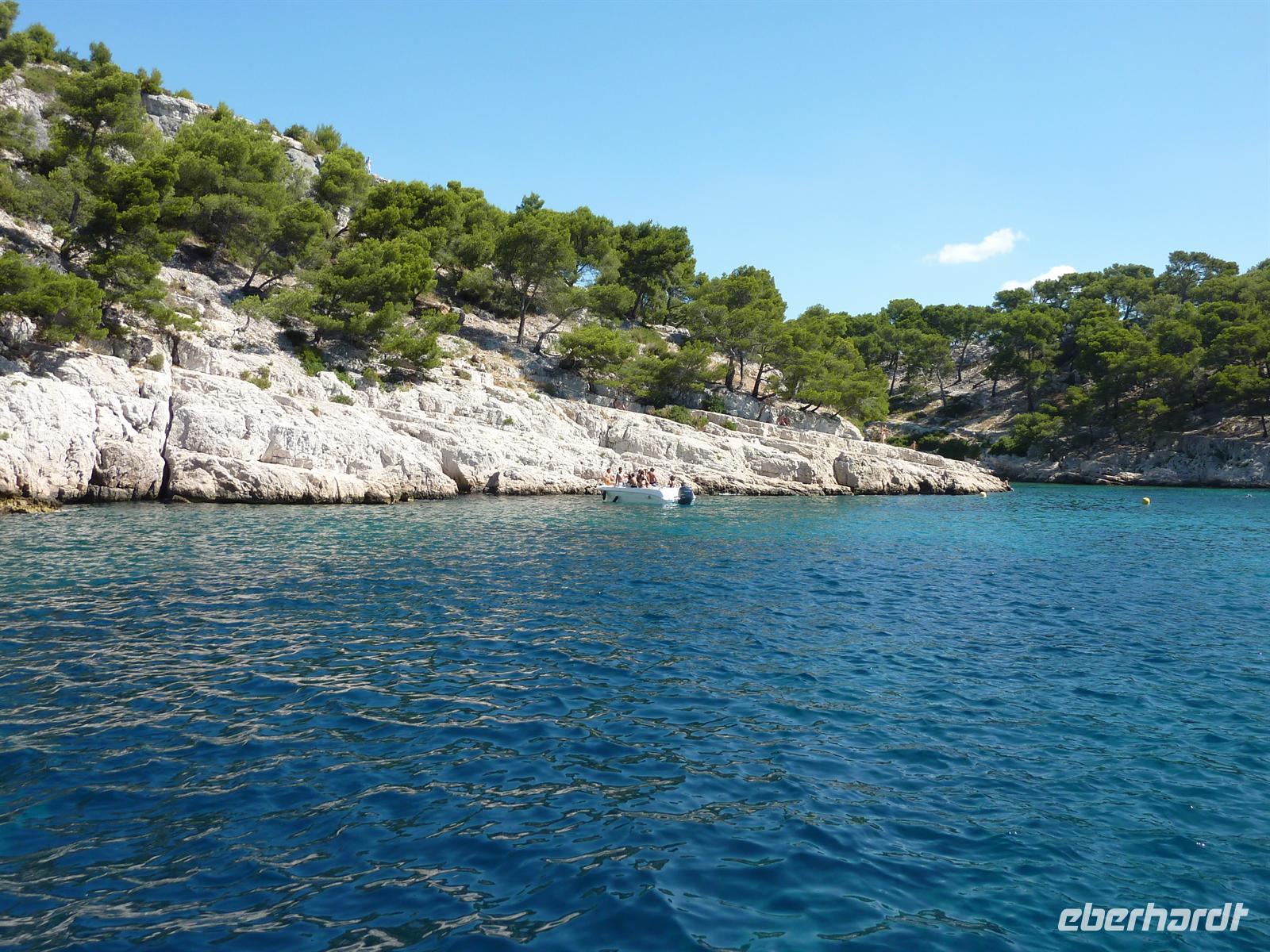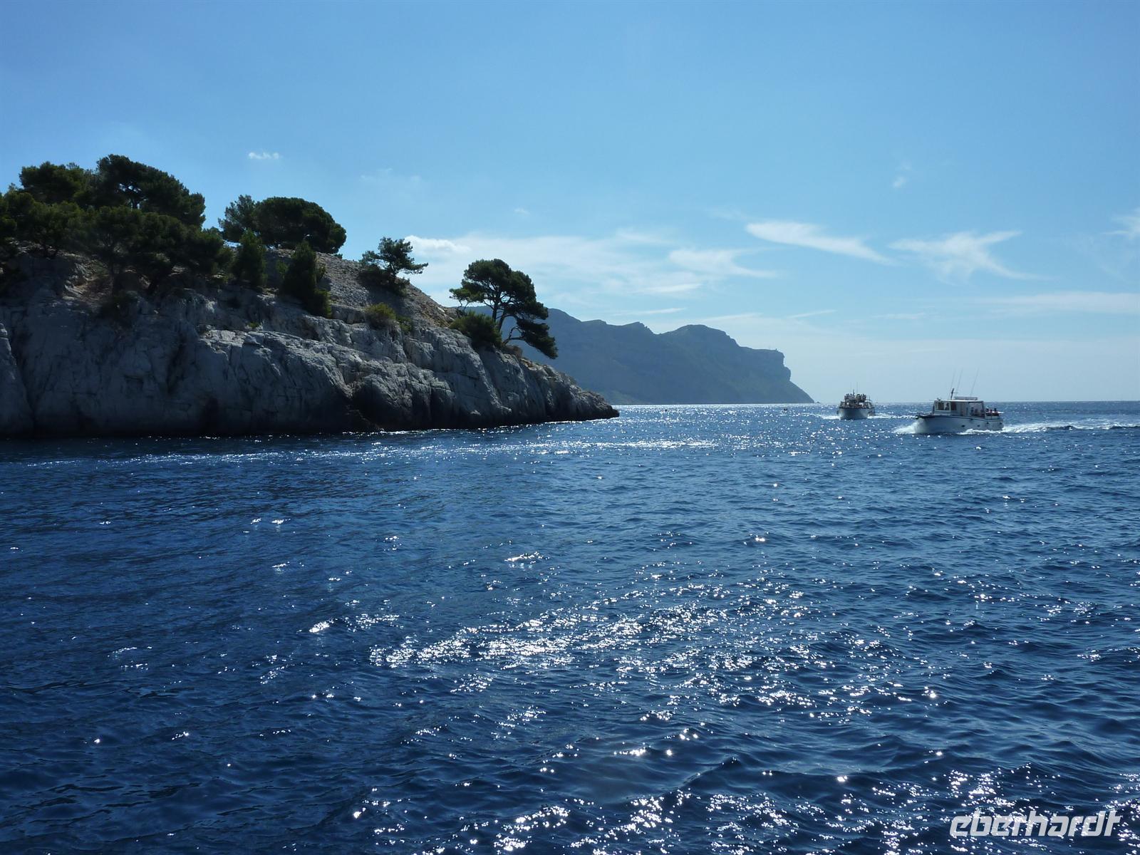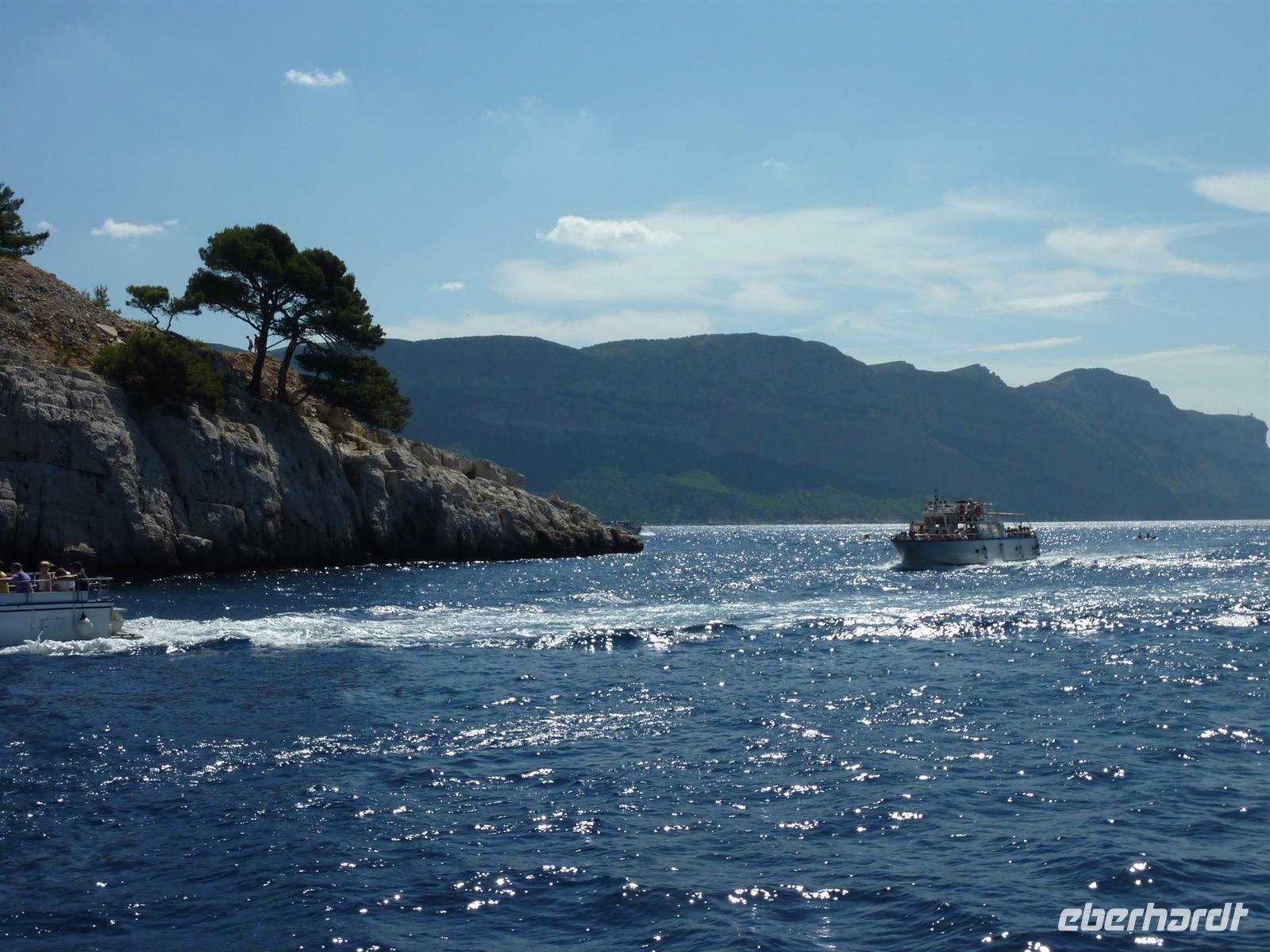 die uns die Landschaft der Calanque von der Meeresseite aus zeigt. Die Calanques bei Cassis gehören zu den schönsten Landschaften, die Frankreich zu bieten hat. Wildromantische Buchten, die teilweise wie Fjorde tief ins Land hineingehen, überragt von riesigen steilen Felswänden. Inmitten der Buchten mit dem flaschengrünen Meerwasser liegen kleine Segler. Die Wellen brechen sich an unserem Boot und man bekommt ab und zu eine feuchte Brise ab. Wir genießen die Fahrt und bestaunen die beeindruckende Landschaft. Dann legen wir wieder am Hafen von Cassis an. Wir bummeln noch eine wenig durch die Stadt, trinken einen Kaffee oder kaufen uns ein Baguette für den kleinen Happen zwischendurch. Dann laufen wir wieder zur Haltstelle des Petit Trains, der uns wieder zu unserem Bus bringt. Unser Roy steht schon bereit und unsere Fahrt führt uns weiter in die zweitgrößte Stadt Frankreichs - Marseille.