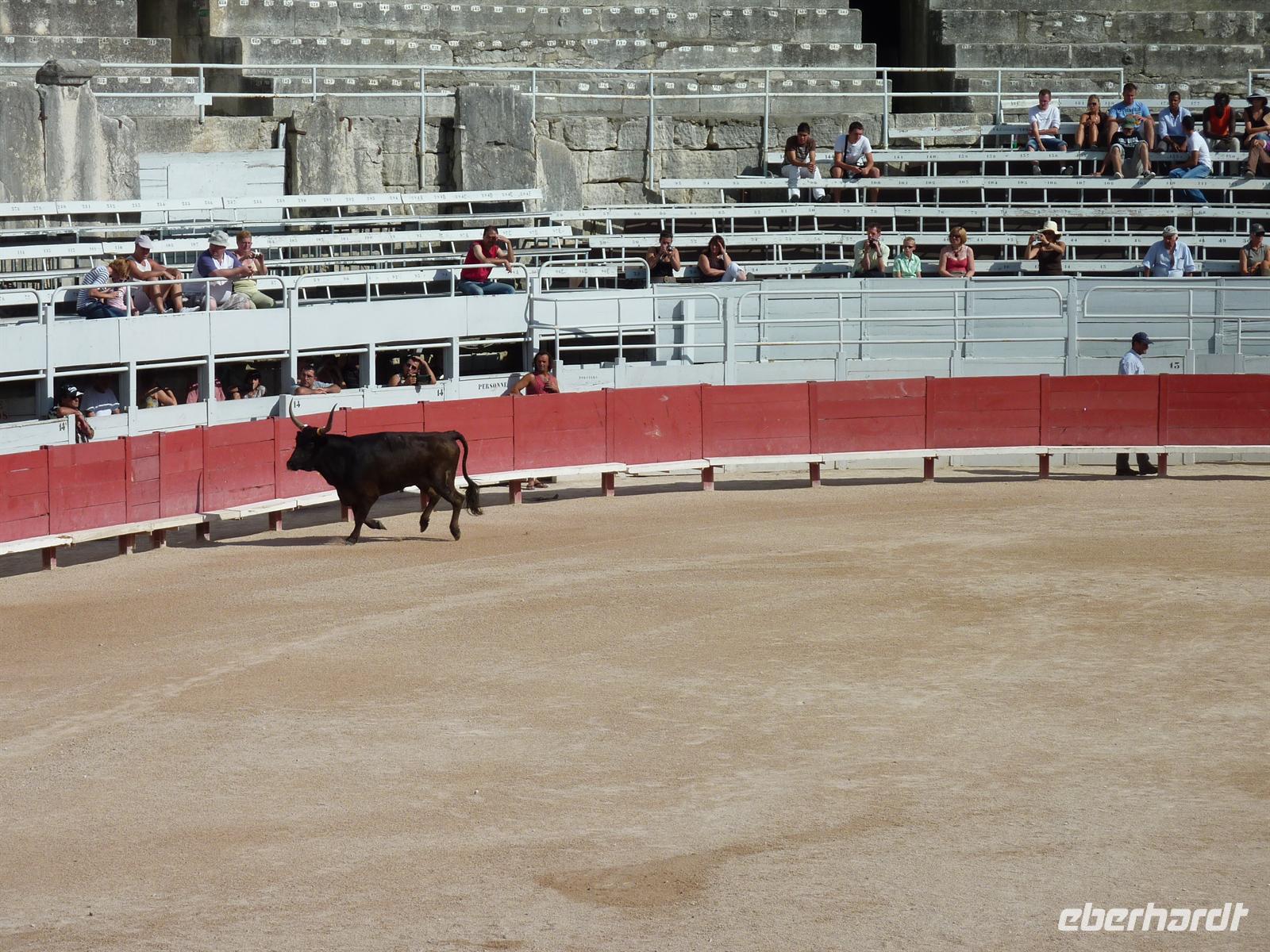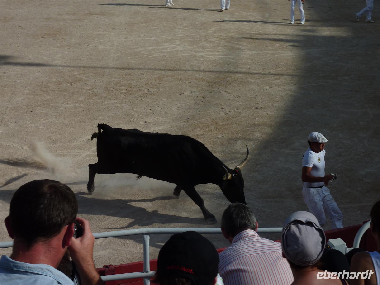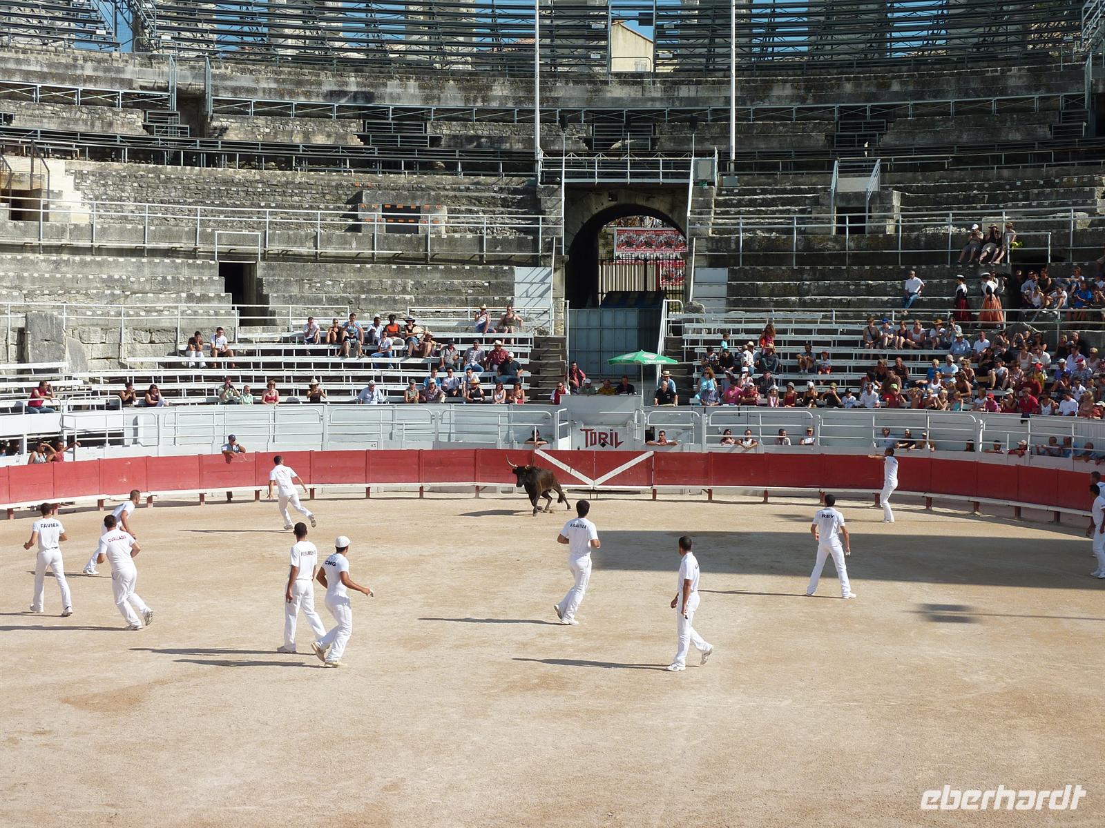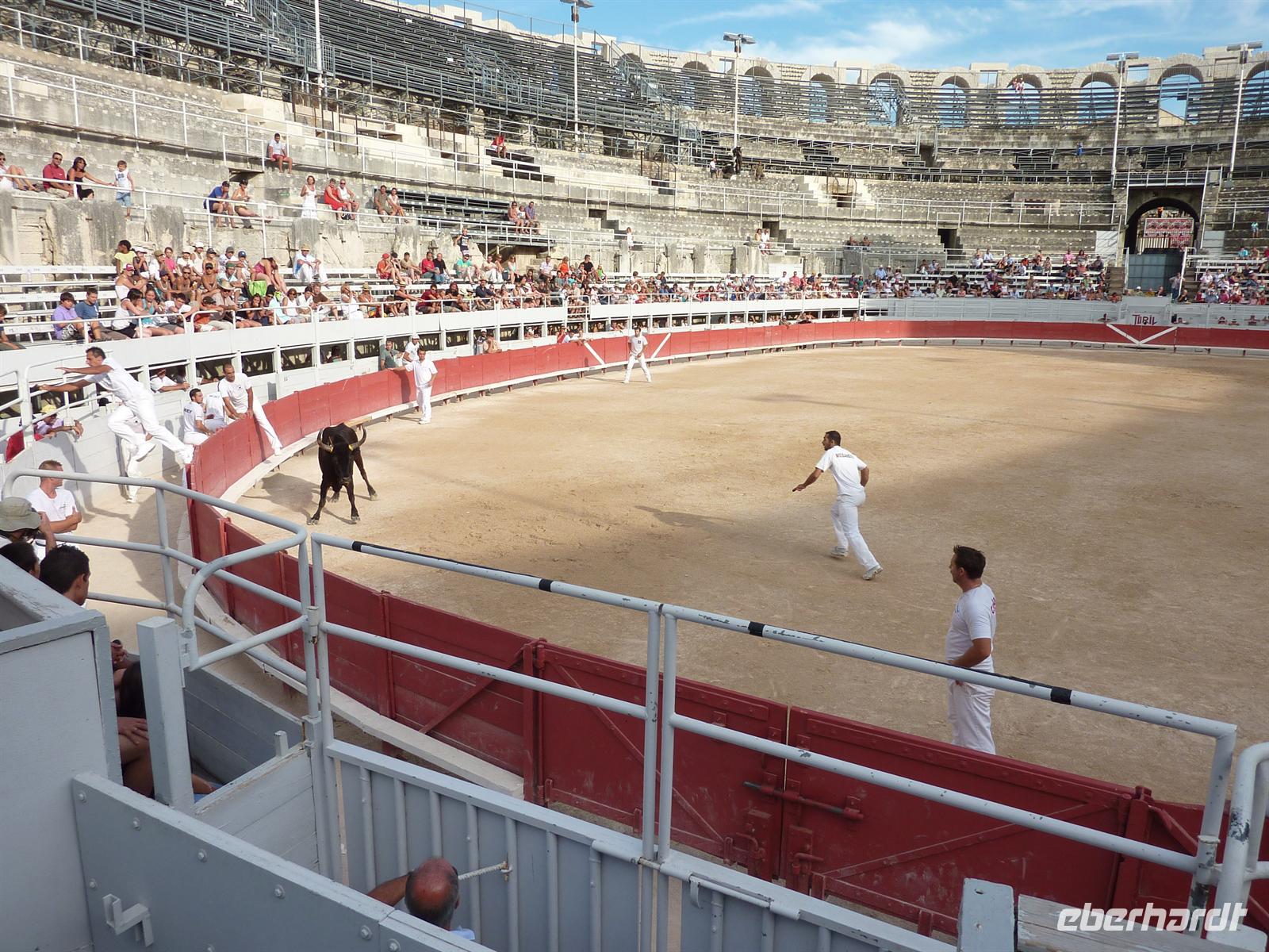 Südfrankreich ist bekannt für die traditionellen Stierkämpfe in der Region der Camargue. Im Sommer finden jeden Mittwoch und Freitag in der Arènes d’Arles die sogenannten „Courses Camarguaises“ statt. Und zu einem solchen Course Camarguaises gehen die Interessierten der Reisegruppe am Abend in das Amphitheater. Die provenzalischen Stierspiele haben in der Camargue eine sehr lange Tradition - erste Überlieferungen sind bereits aus dem 11. Jahrhundert bekannt. Demnach gab es in der Gegend um Arles regelmäßig Spiele, Wettkämpfe oder Kräftemessen mit Stieren. Dabei werden die Stiere niemals getötet - die Stiere erreichen oft ein sehr hohes Alter und werden nach den Spielen wieder auf die Weide entlassen. Der Course Camarguaise ist daher nicht mit dem spanischen Stierkampf zu vergleichen. Vielmehr handelt es sich dabei um einen sportlichen Wettkampf zwischen Mensch und Tier, bei dem ganz in weiß gekleidete Läufer, sogenannte Razeteurs, versuchen, dem Stier bunte Cocarden und Quasten zu entreißen, die zwischen seinen Hörnern befestigt wurden. Auf diese Cocarden sind Geldpreise ausgesetzt, die oft während dem Spiel über Lautsprecher noch erhöht werden, um so die