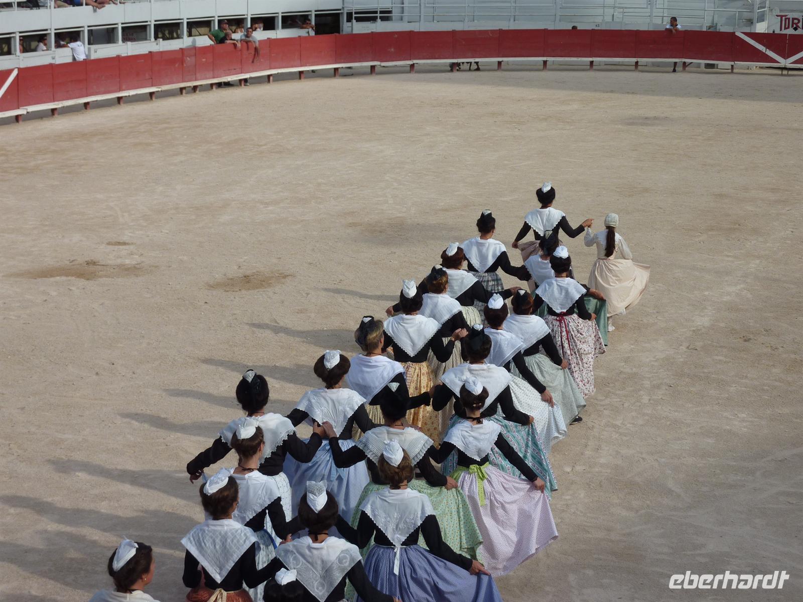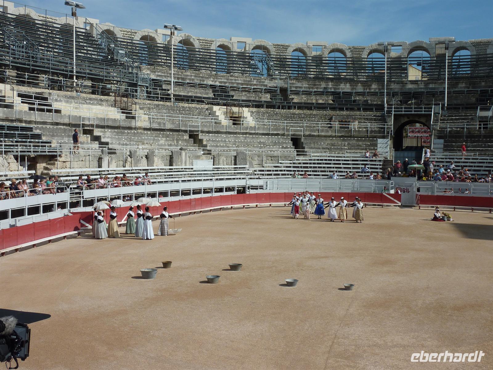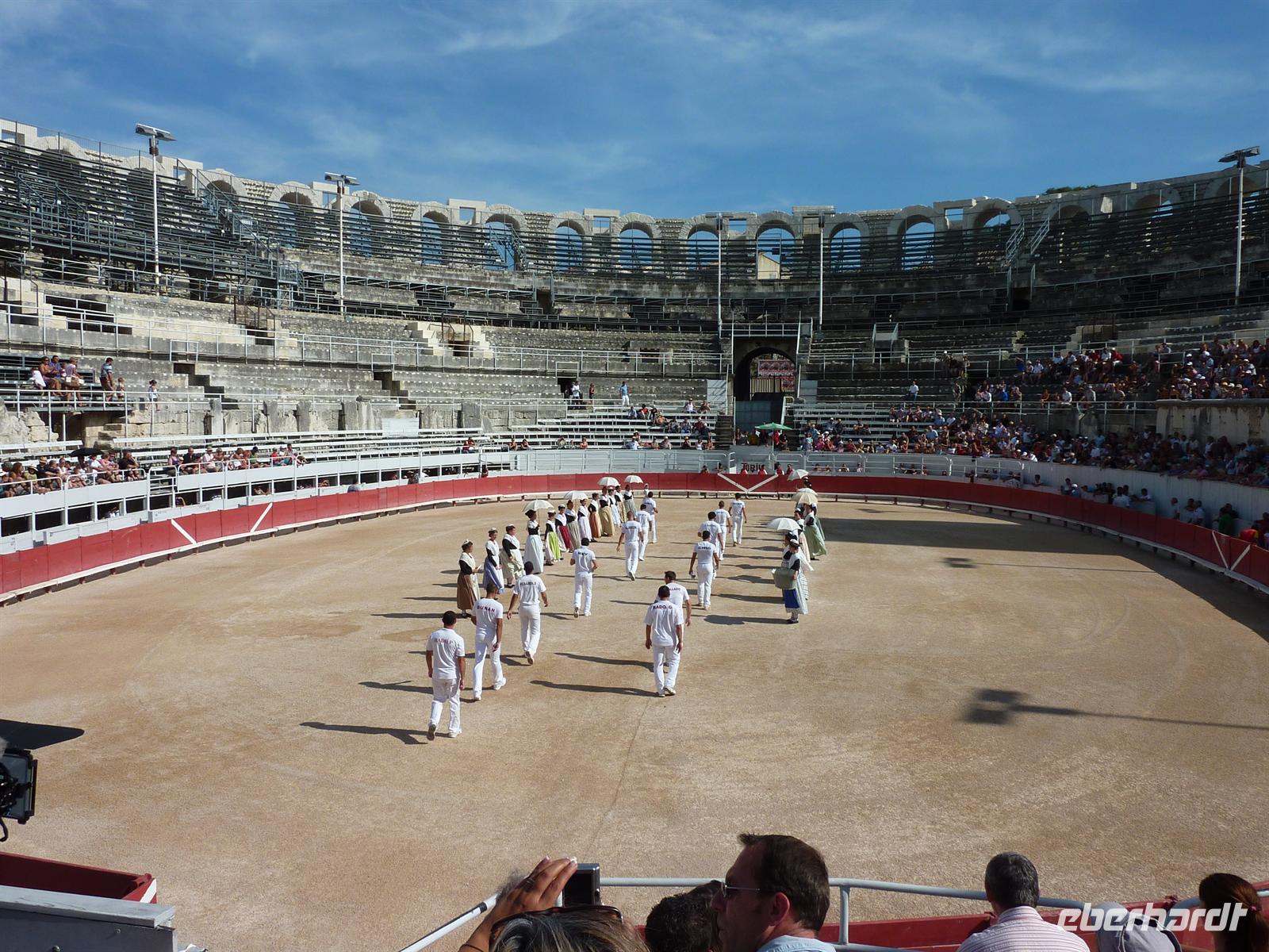Südfrankreich ist bekannt für die traditionellen Stierkämpfe in der Region der Camargue. Im Sommer finden jeden Mittwoch und Freitag in der Arènes d’Arles die sogenannten „Courses Camarguaises“ statt. Und zu einem solchen Course Camarguaises gehen die Interessierten der Reisegruppe am Abend in das Amphitheater. Die provenzalischen Stierspiele haben in der Camargue eine sehr lange Tradition - erste Überlieferungen sind bereits aus dem 11. Jahrhundert bekannt. Demnach gab es in der Gegend um Arles regelmäßig Spiele, Wettkämpfe oder Kräftemessen mit Stieren. Dabei werden die Stiere niemals getötet - die Stiere erreichen oft ein sehr hohes Alter und werden nach den Spielen wieder auf die Weide entlassen. Der Course Camarguaise ist daher nicht mit dem spanischen Stierkampf zu vergleichen. Vielmehr handelt es sich dabei um einen sportlichen Wettkampf zwischen Mensch und Tier, bei dem ganz in weiß gekleidete Läufer, sogenannte Razeteurs, versuchen, dem Stier bunte Cocarden und Quasten zu entreißen, die zwischen seinen Hörnern befestigt wurden. Auf diese Cocarden sind Geldpreise ausgesetzt, die oft während dem Spiel über Lautsprecher noch erhöht werden, um so die