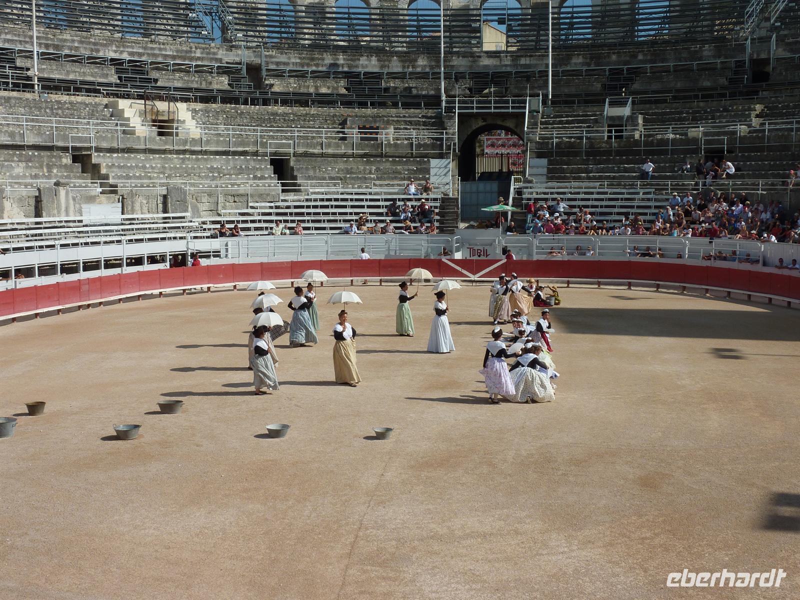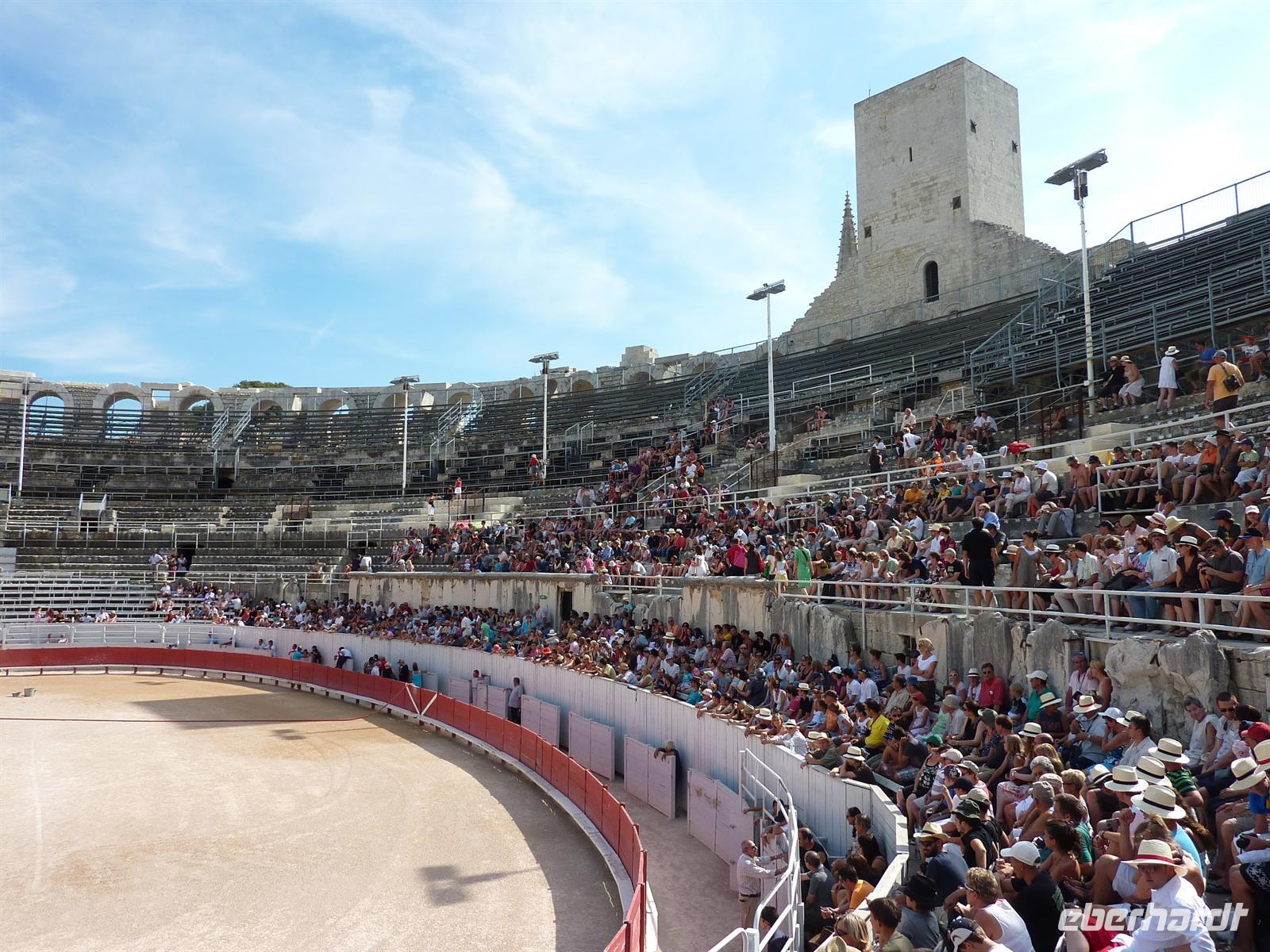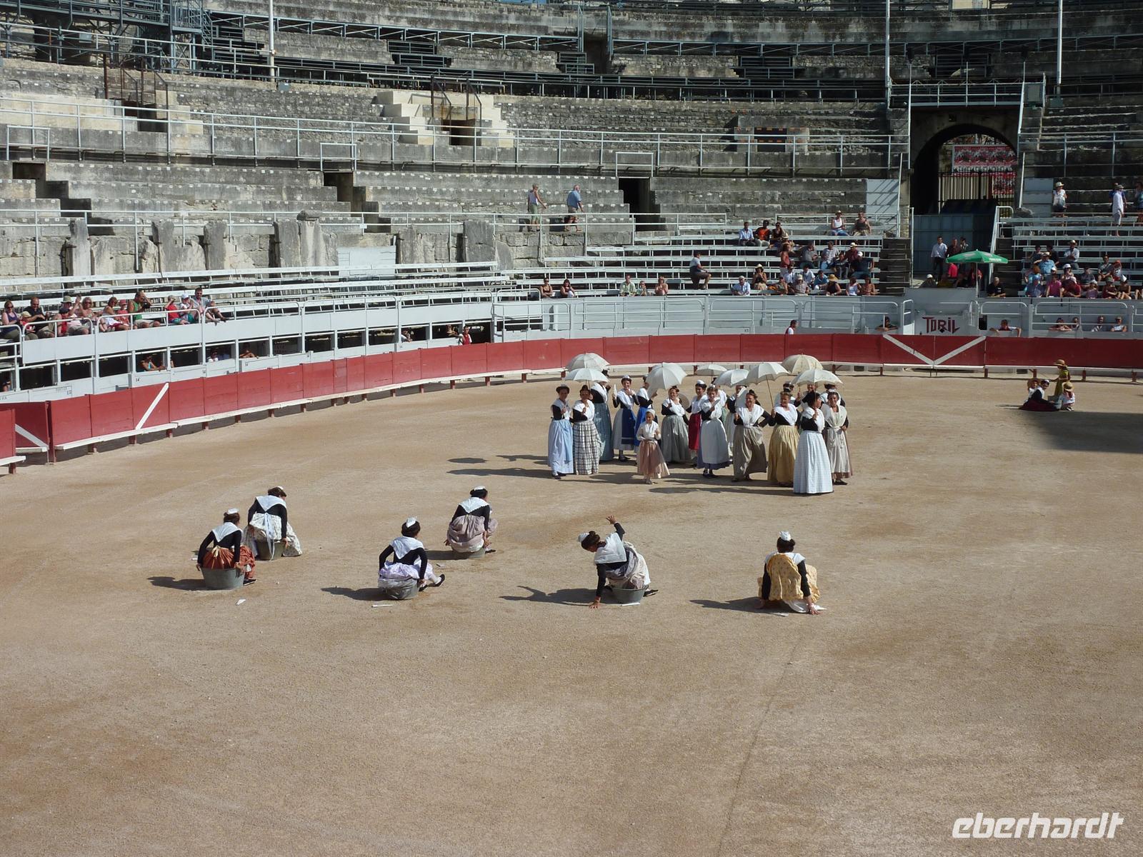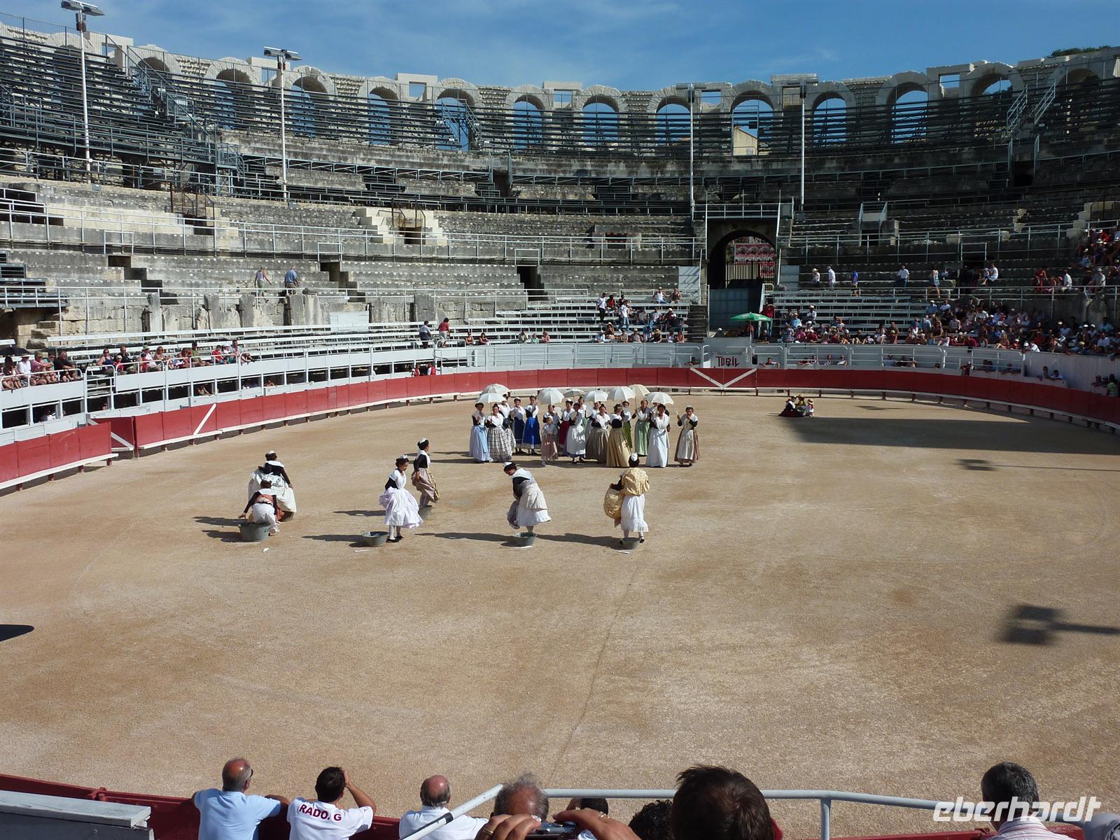 Südfrankreich ist bekannt für die traditionellen Stierkämpfe in der Region der Camargue. Im Sommer finden jeden Mittwoch und Freitag in der Arènes d’Arles die sogenannten „Courses Camarguaises“ statt. Und zu einem solchen Course Camarguaises gehen die Interessierten der Reisegruppe am Abend in das Amphitheater. Die provenzalischen Stierspiele haben in der Camargue eine sehr lange Tradition - erste Überlieferungen sind bereits aus dem 11. Jahrhundert bekannt. Demnach gab es in der Gegend um Arles regelmäßig Spiele, Wettkämpfe oder Kräftemessen mit Stieren. Dabei werden die Stiere niemals getötet - die Stiere erreichen oft ein sehr hohes Alter und werden nach den Spielen wieder auf die Weide entlassen. Der Course Camarguaise ist daher nicht mit dem spanischen Stierkampf zu vergleichen. Vielmehr handelt es sich dabei um einen sportlichen Wettkampf zwischen Mensch und Tier, bei dem ganz in weiß gekleidete Läufer, sogenannte Razeteurs, versuchen, dem Stier bunte Cocarden und Quasten zu entreißen, die zwischen seinen Hörnern befestigt wurden. Auf diese Cocarden sind Geldpreise ausgesetzt, die oft während dem Spiel über Lautsprecher noch erhöht werden, um so die