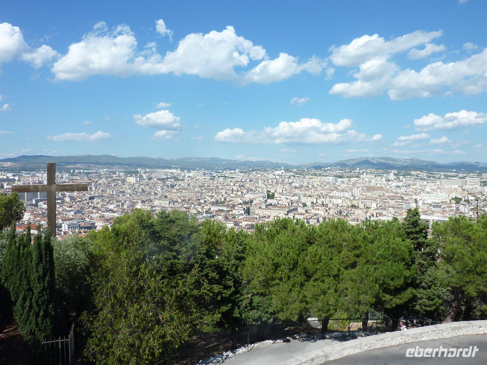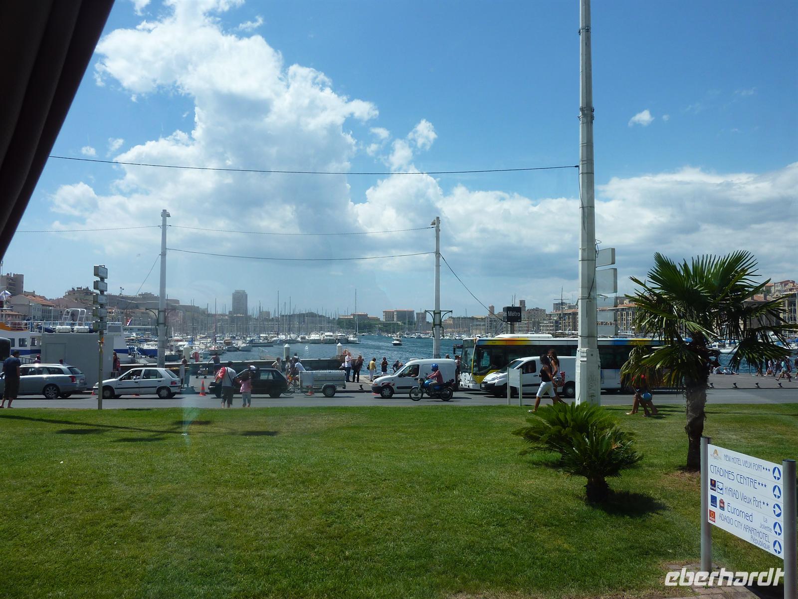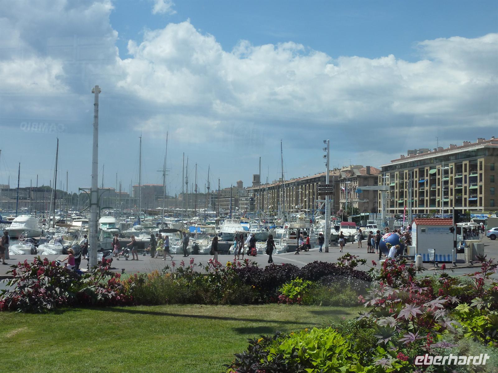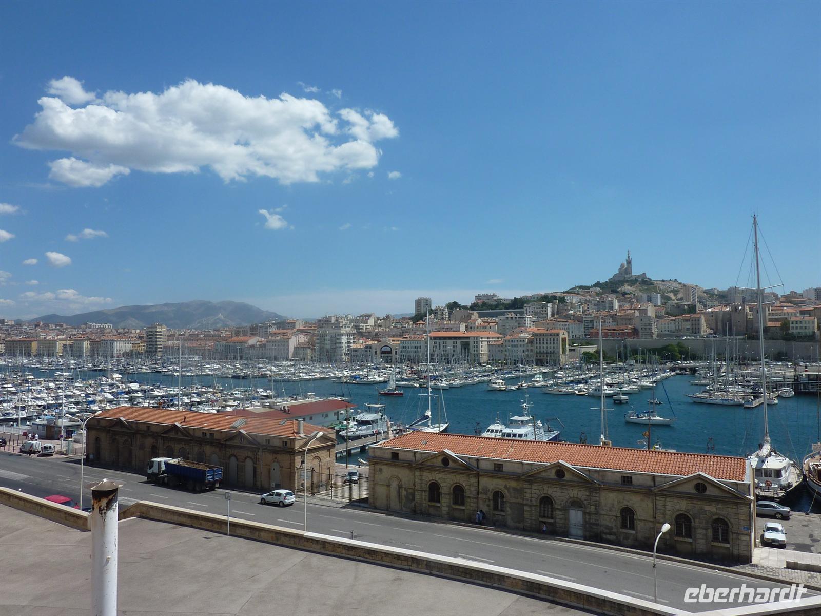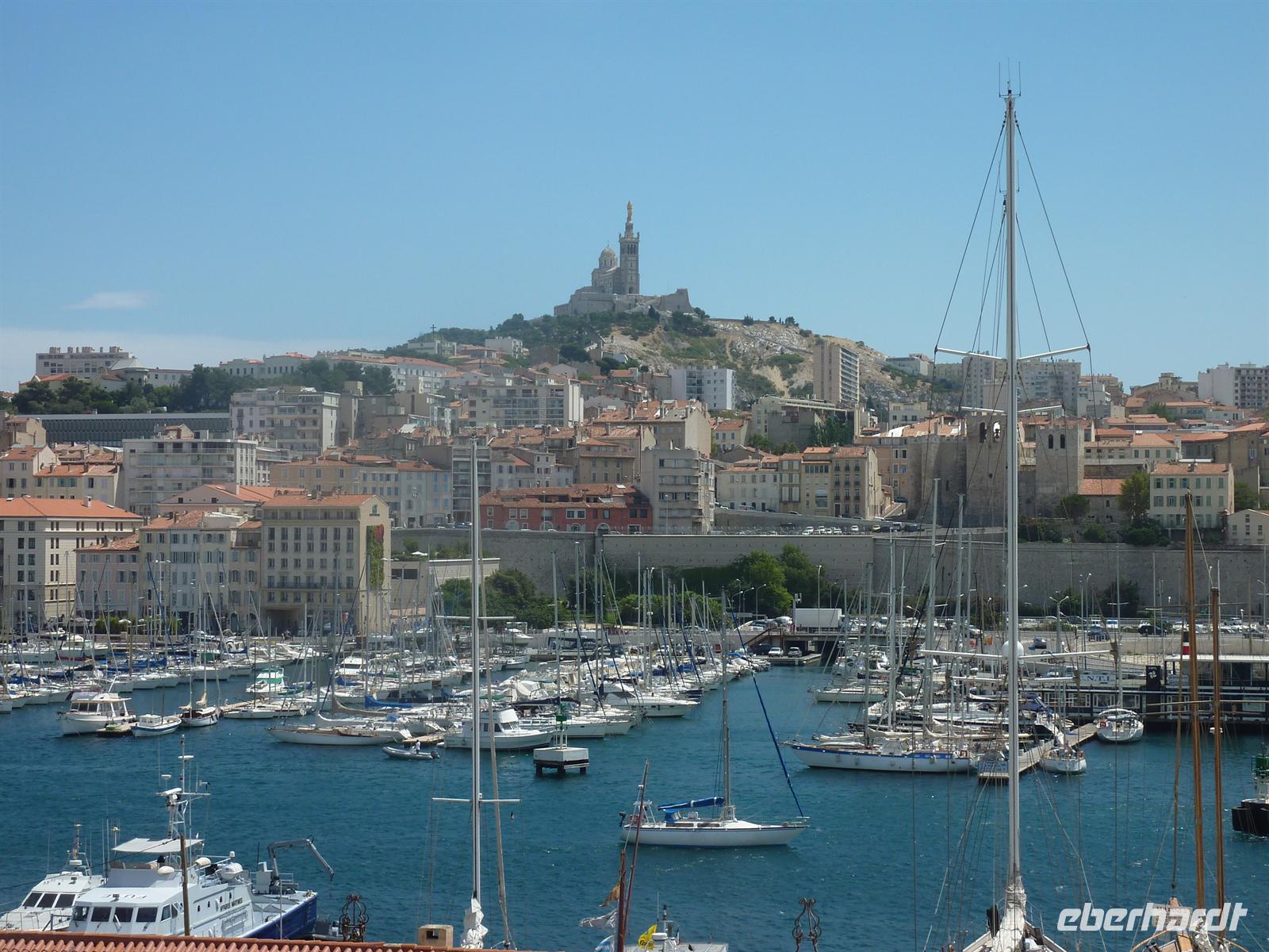 Marseille, die zweitgrößte Stadt Frankreichs und zugleich Zentrum der Mittelmeerregion liegt ideal im Herzen der Provence. Die vor 2600 Jahren gegründete, älteste Stadt Frankreichs vereint die unglaubliche Fülle eines einzigartigen Kulturerbes, ein intensives kulturelles Leben und eine außergewöhnliche Lage zwischen Hügeln und Meer. Auf unserer Fahrt ins Zentrum der Stadt erhaschen wir schon einen kleinen Eindruck von der Stadt. An der Tourismusinformation am Yachthafen treffen wir unsere örtliche Städteführerin Isabella. Mit dem typisch französischen Akzent zeigt sie uns ihre Stadt. Unsere Rundfahrt durch die Stadt beginnt am Alten Hafen (Vieux Port). Hier konzentrierte sich 2500 Jahre lang der gesamte Schiffsverkehr und bis heute ist er der eigentliche Mittelpunkt von Marseille. Hier laufen alle Wege zusammen, hier versammeln sich bei großen Veranstaltungen die Menschenmengen, hier bummeln Spaziergänger. Durch die Altstadt drängen wir uns durch die engen Straßen bis zu einem Aussichtspunkt, von dem man einen herrlichen Blick über den Hafen mit den unzähligen Segelboote und Yachten hat. Schon hier merken wir den Mistral. Ein starker Wind weht und wir müssen aufpassen, dass uns die Hüte nicht von den Köpfen fliegen. :) Isabella erklärt uns, dass dies aber nur der kleine Mistral sei, über den die Einwohner von Marseille sehr glücklich sind. Wenn das aber der kleine Mistral ist, wie ist dann der große?