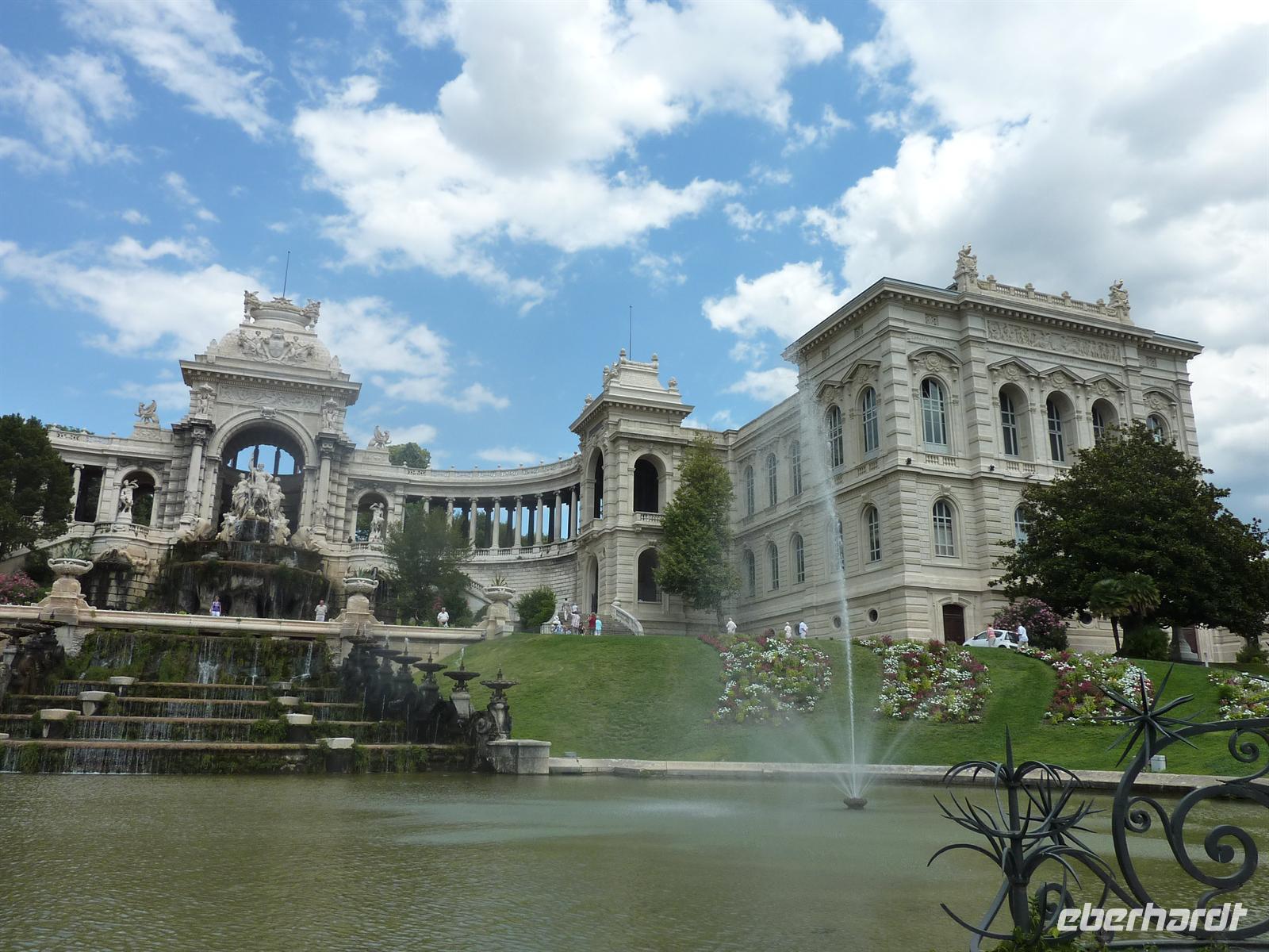 Nur wenige Hundert Meter weiter kommen wir an einer riesigen, monströsen Kirche namens Cathédrale de la Major vobei. Die Kirche wurde im 11. Jahrhundert erbaut und zählte einst zu den schönsten romanischen Kirchen überhaupt. Im 19. Jahrhundert ließ die katholische Kirche die Kathedrale neu bauen. Durch die Hauptstraßen der Stadt erreichen wir das Palais Longchamp. Dieser von Platanen gesäumte Boulevard wurde von den Besitzern der Stadtpaläste und anderer Geschäftsgebäude gestaltet, nachdem die Stadt den Boulevard in den dreißiger Jahren des 19. Jh. angelegt hatte. Hier machen wir unser zweites Gruppenfoto, da die Kulisse einfach sehr passend ist.