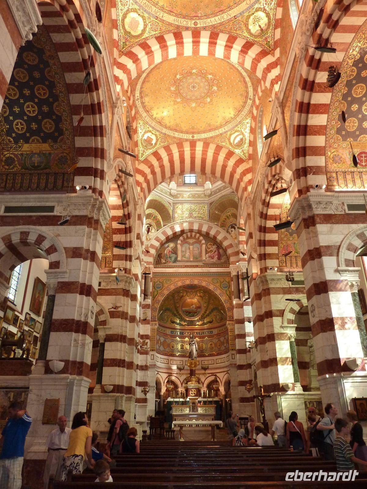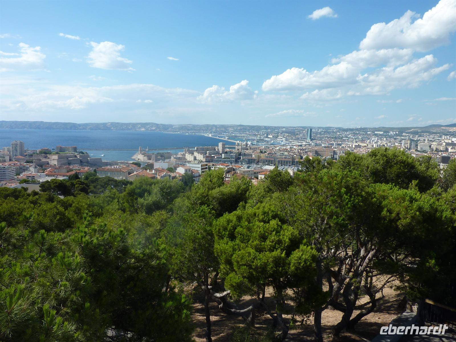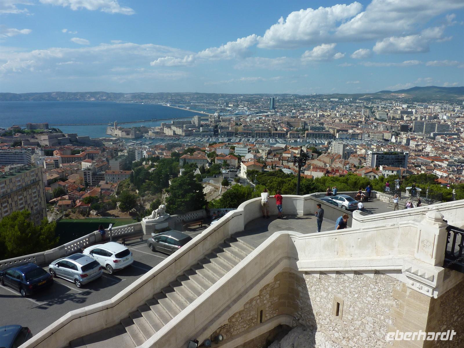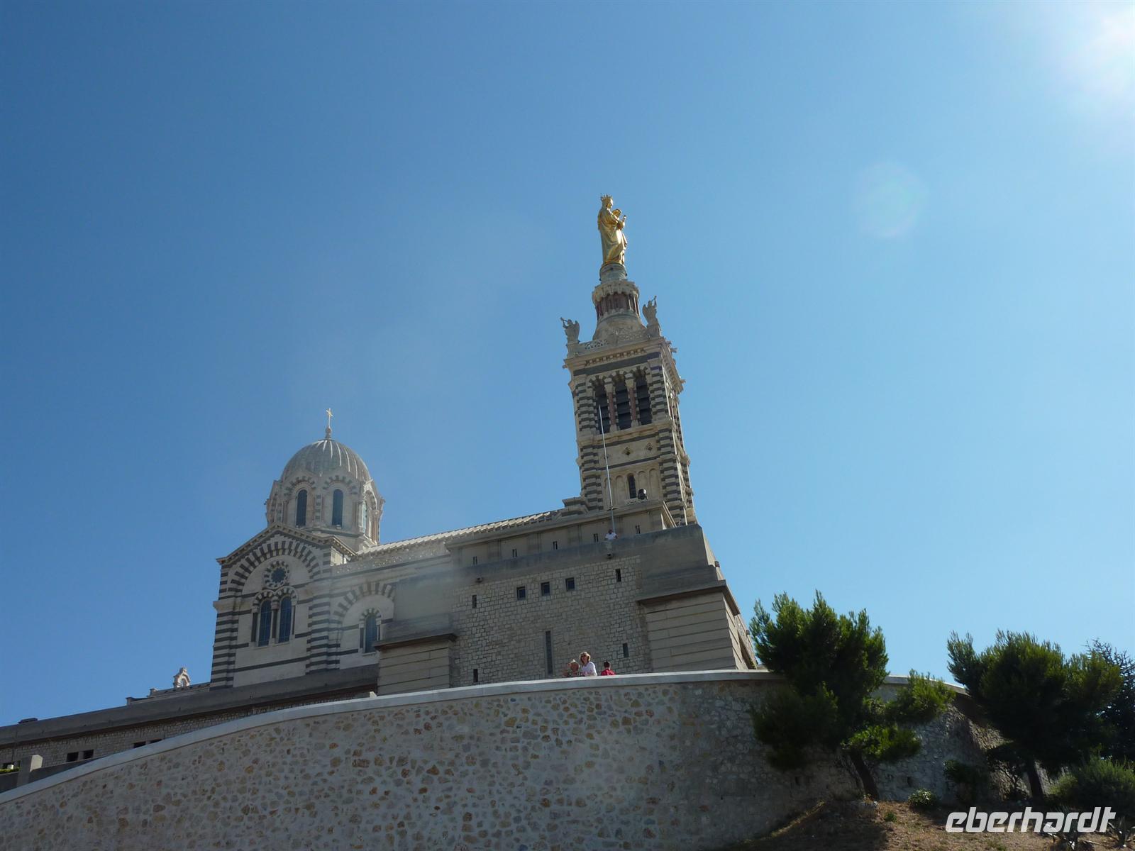 Dann setzen wir unsere Fahrt fort und kommen schließlich wieder an den Alten Hafen. Dort endet unsere Stadtrundfahrt und es bleibt noch Zeit, die Stadt auf eigene Faust zu erkunden. Isabella organisiert noch eine Fahrt mit dem Petit Train zu der wohl berühmtesten Sehenswürdigkeit von Marseille - die Basilika Notre-Dame de la Garde. Sie ist zweifellos das Wahrzeichen der Stadt, welches man schon von weitem erblickt. Denn die Kirche im neobyzantinischen Stil thront auf einem 147 Meter hohen Kalkfelsen in der südlichen Altstadt. Von der Terrasse aus haben wir einen eindrucksvollen Blick über die Stadt und das Mittelmeer. Nach einem kurzen Aufenthalt warten wir wieder auf unsere Bimmelbahn, die uns wieder hinunter zum Hafen bringt, wo auch schon der Bus und die anderen Gäste auf uns warten.