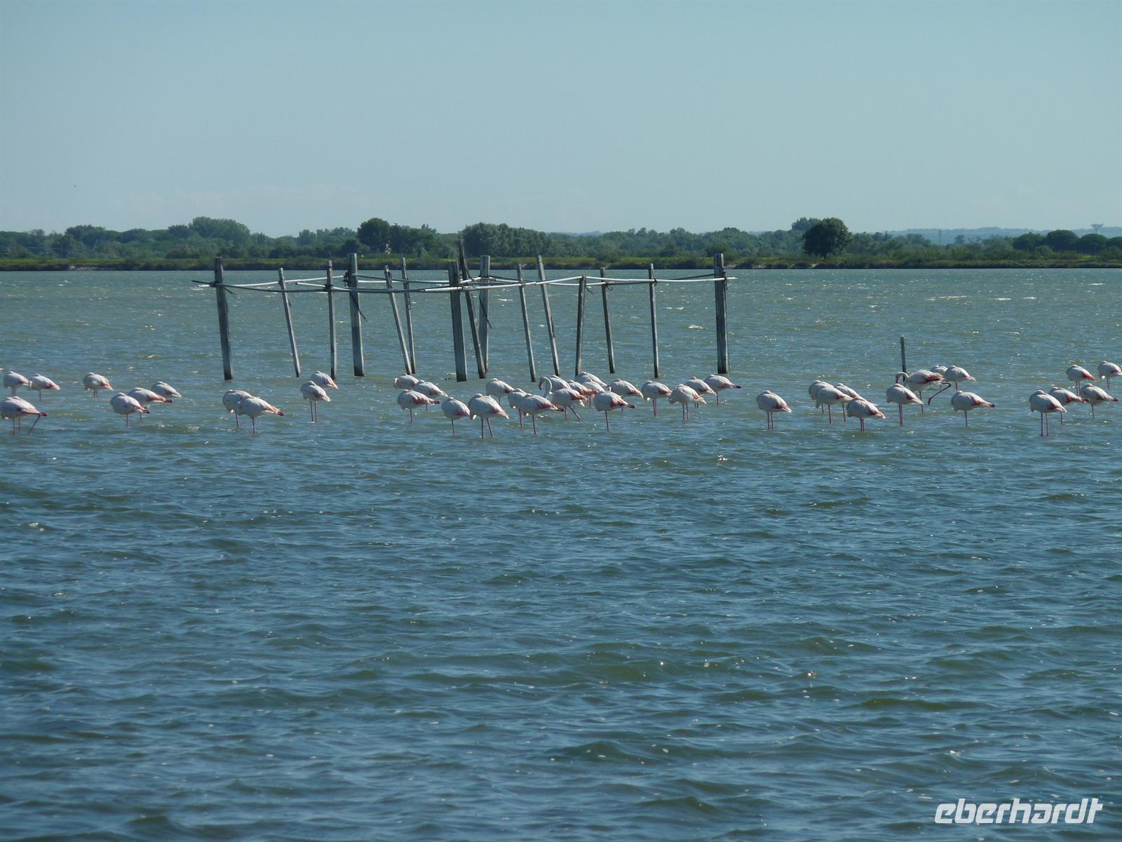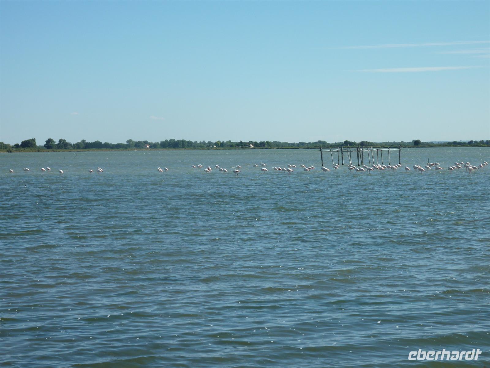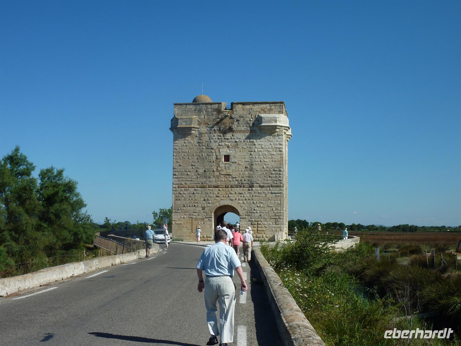 Wir fahren noch gar nicht lange, da können wir schon auf einer Weide am Straßenrand die schwarzen Stiere sehen. Dieser Anblick ist ein Foto wert. Unser nächster Halt ist der „Tour Carbonniére“. Das im Jahre 1346 erstmals urkundlich erwähnte Bauwerk war der letzte militärische Vorposten von Aigues-Mortes, der zur Verteidigung der einzigen Zufahrt zur Stadt errichtet worden war. Über einen kleinen Holzsteg laufen wir vom Turm wieder zurück an den Bus und bekommen schon einen Blick über das Sumpfgebiet mit der vielfältigen Vogelwelt. Anschließend fahren wir durch den Nationalpark Camargue in Richtung Le Grau du Roi. Rechts und links der Straße sind viele Seen- und Sumpflandschaften. Wir sind auf der Suche nach Flamingos. Und dann sehen wir, kurz vor den Salinen, jede Menge Flamingos im Wasser stehen. Die Suche hat sich also gelohnt. Dann fahren wir nach Aigues-Mortes. Das am westlichen Rand der Camargue liegende Aigues-Mortes ist ein Kleinod mittelalterlicher Baukunst. Schon im 13. Jahrhundert entstand die Stadtbefestigung mit ihrer 11 Meter hohen Stadtmauer und den 15 Türmen. Die gesamte, etwa 1600 Meter lange, Befestigungsanlage in der Form eines unregelmäßigen Vierecks umgibt das Zentrum der Stadt. Obwohl Aigues-Mortes im Mittelalter als Hafenstadt angelegt wurde, liegt es heute durch die Verlandung der Flachwasserzone etwa sechs Kilometer vom Meer entfernt. Auf dem Wasserweg ist aber es nach wie vor über den Canal du Rhône à Sète erreichbar, eine schiffbare Verbindung zwischen der Rhône und der Stadt Sète, von wo aus man in den Canal du Midi gelangt. Der Name Aigues-Mortes bedeutet eigentlich „totes Wasser“ und bezieht sich auf die zum Teil sehr