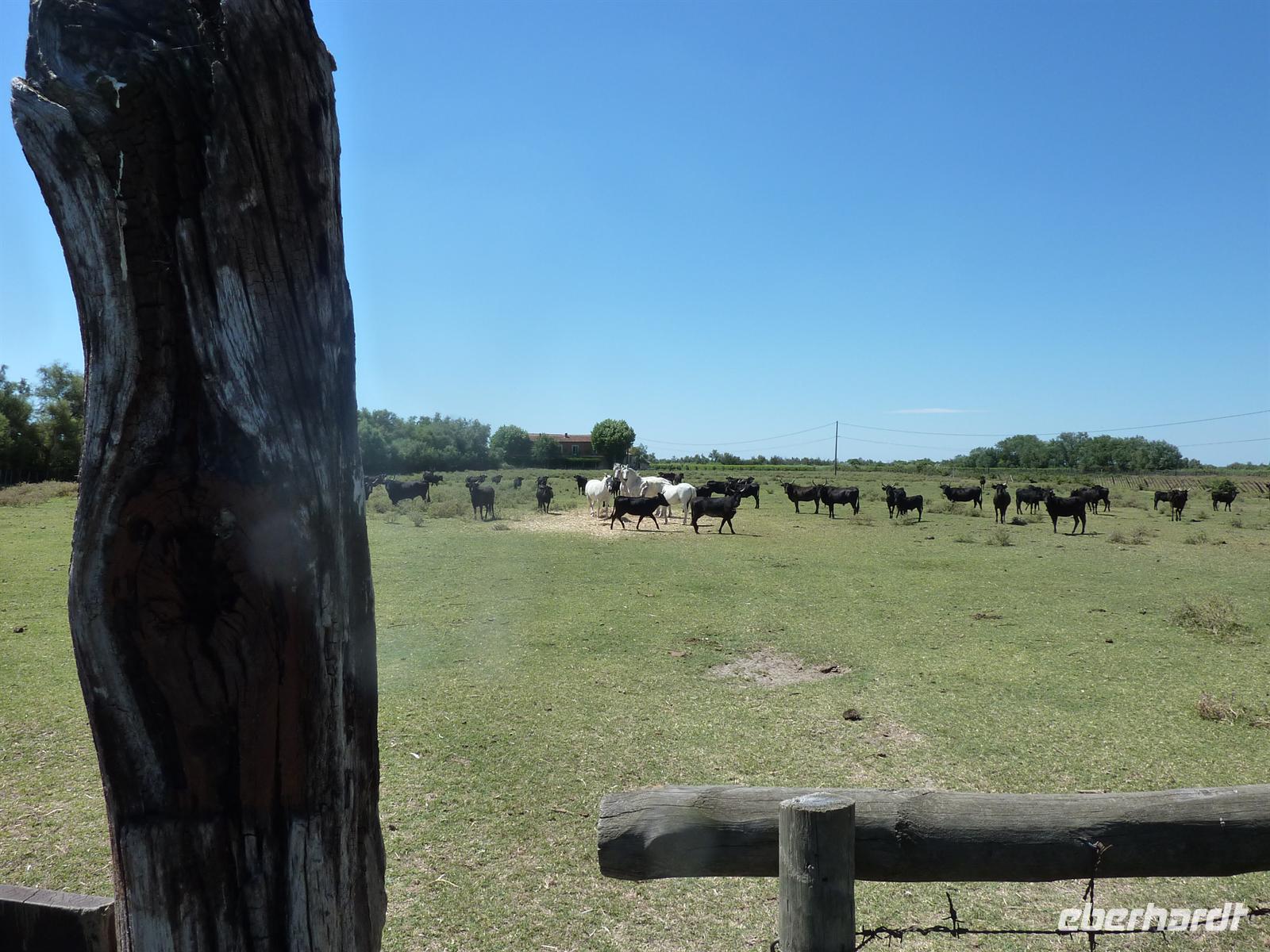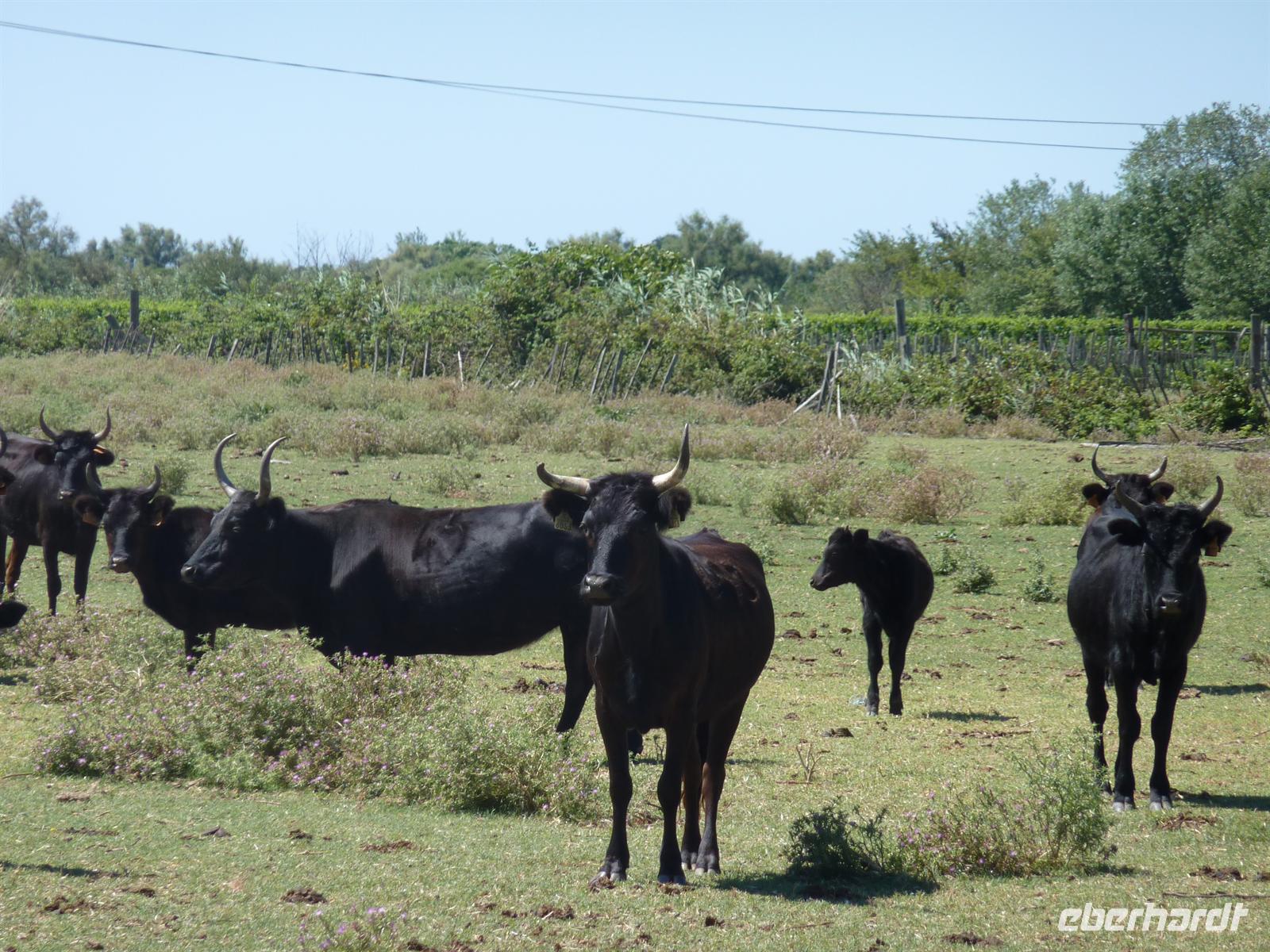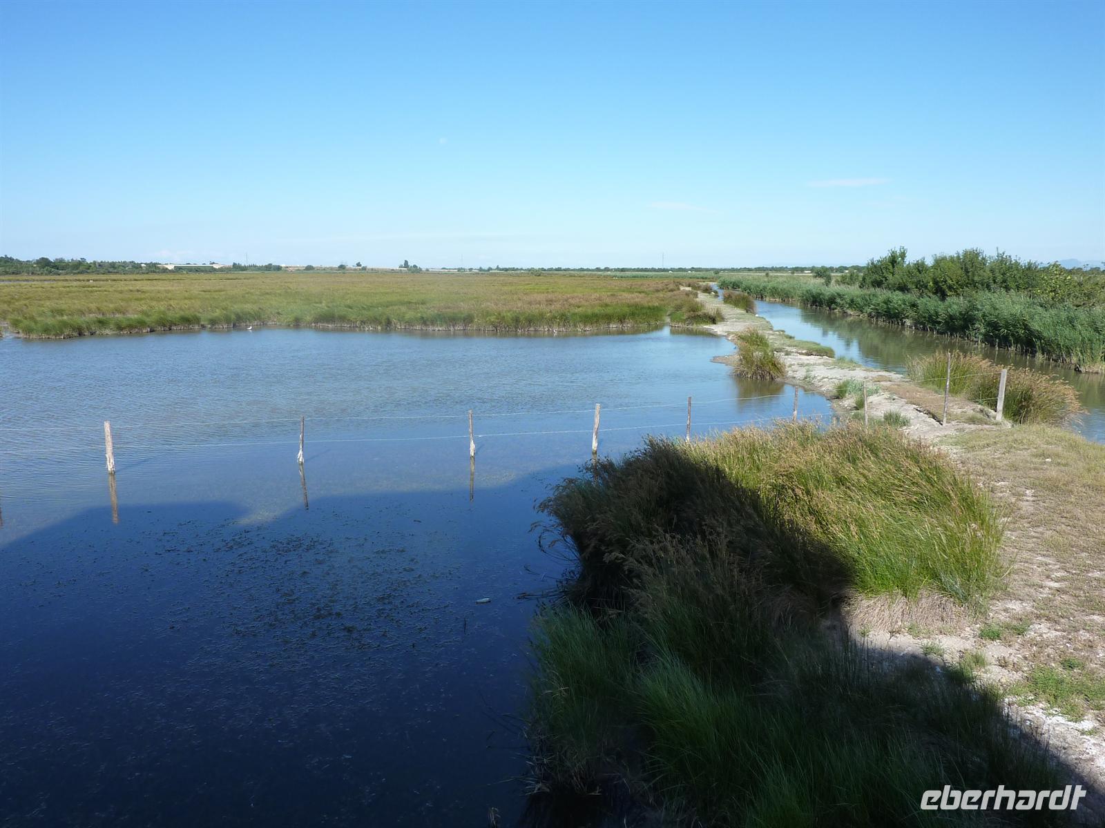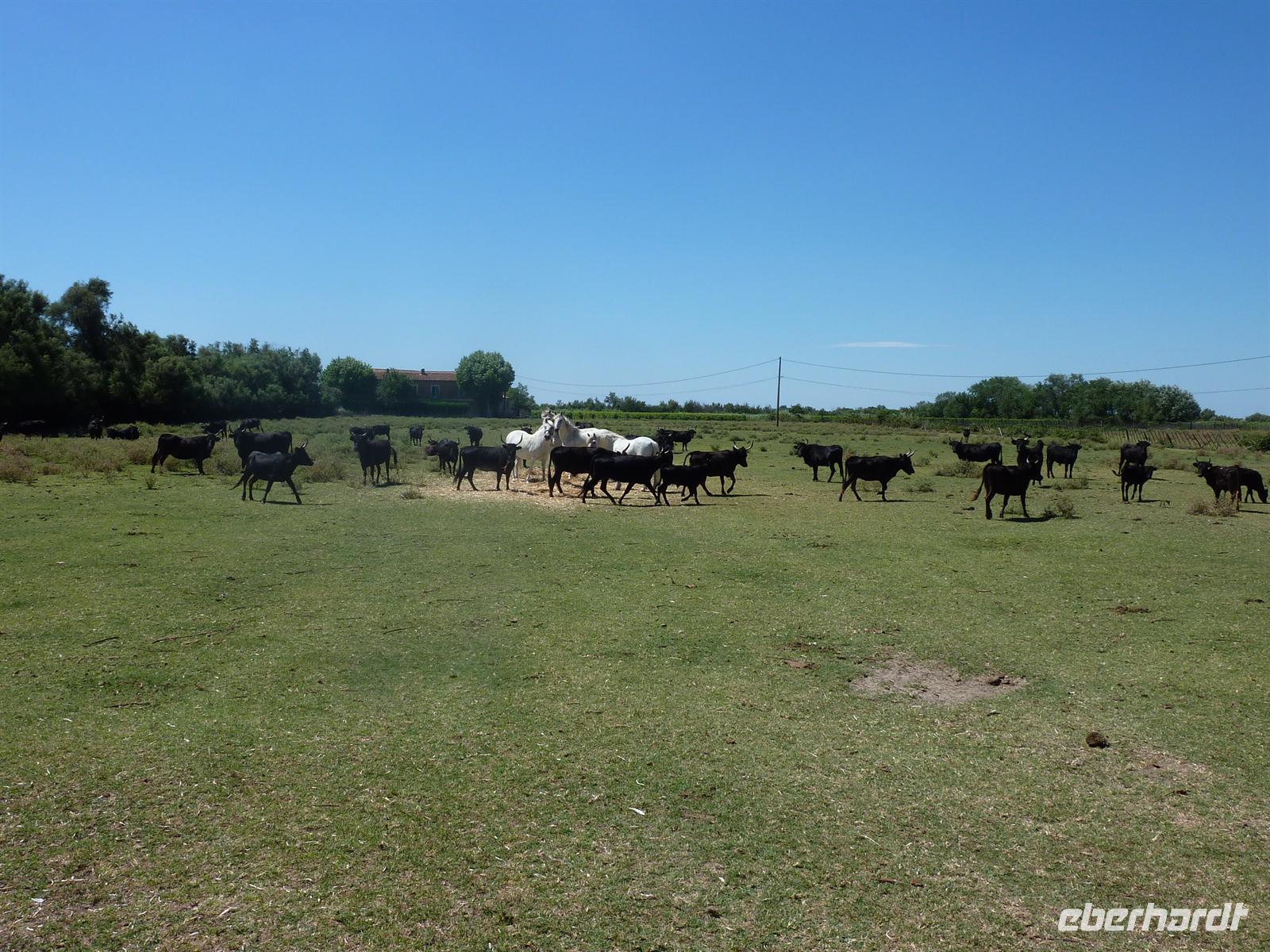 Olivenbäume sucht man hier vergeblich. Kleine Gräben mit Schilfrohr am Ufer durchziehen die Weiden. Rund 450 Kilometer sind die Kanäle lang, die zum Ent- und Bewässern gebraucht werden. Die Camargue ist eben die etwas andere Provence.
