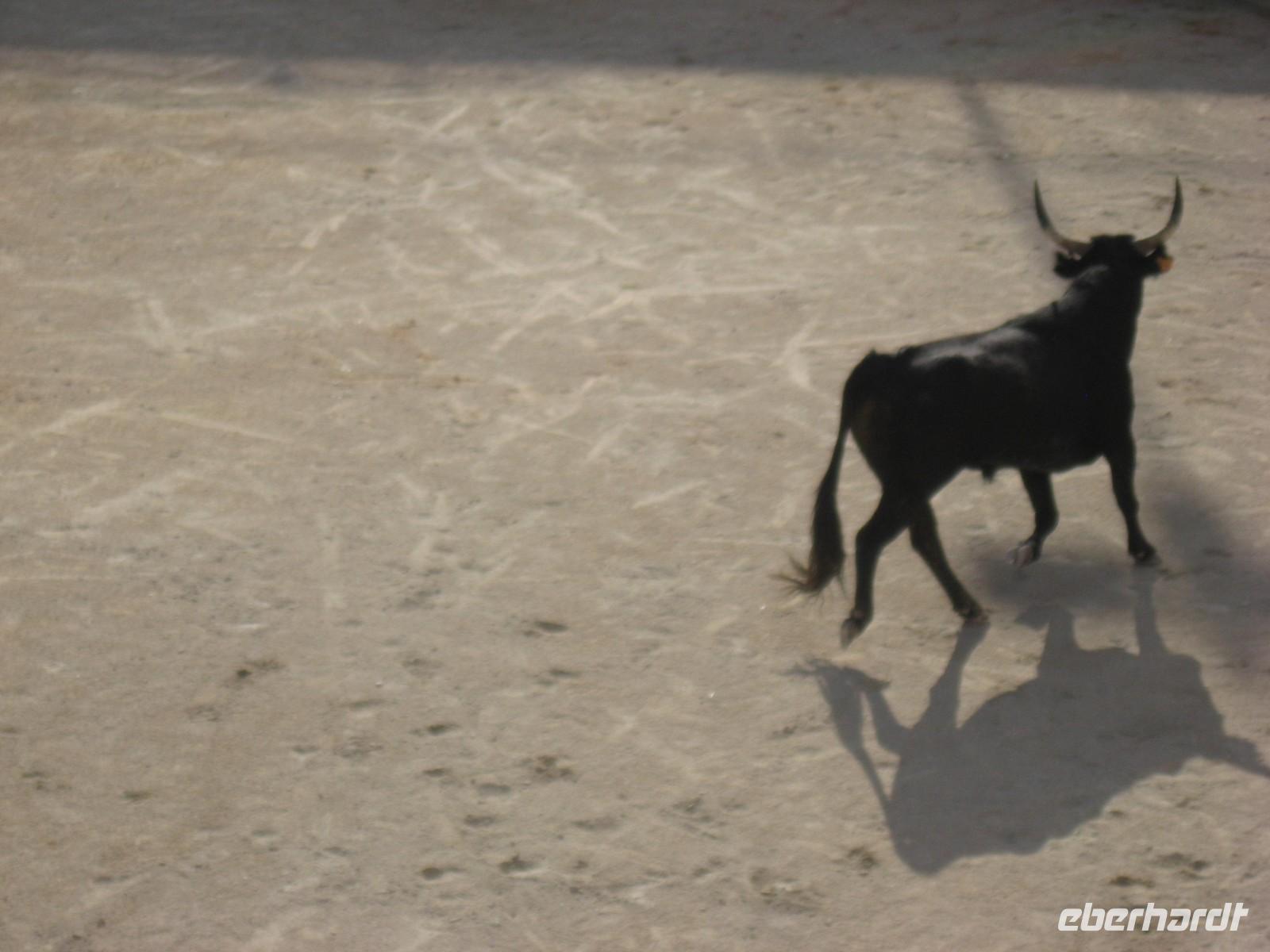 Danach fuhren wir vorbei an Reisfeldern, Stier- und Pferdeherden zurück ins Hotel, denn viele wollen vor dem Abendessen in die Arena, um eine zu erleben. Das ist die unblutige französische Variante des Stierkampfes, bei der die weiß gekleideten Teilnehmer, die ,dem Stier in festgelegter Reihenfolge verschiedene Attribute von den Hörnern abnehmen müssen. Eine spannende Veranstaltung, bei der man als Zuschauer auch die verschiedenen Stier-Charaktere studieren kann.