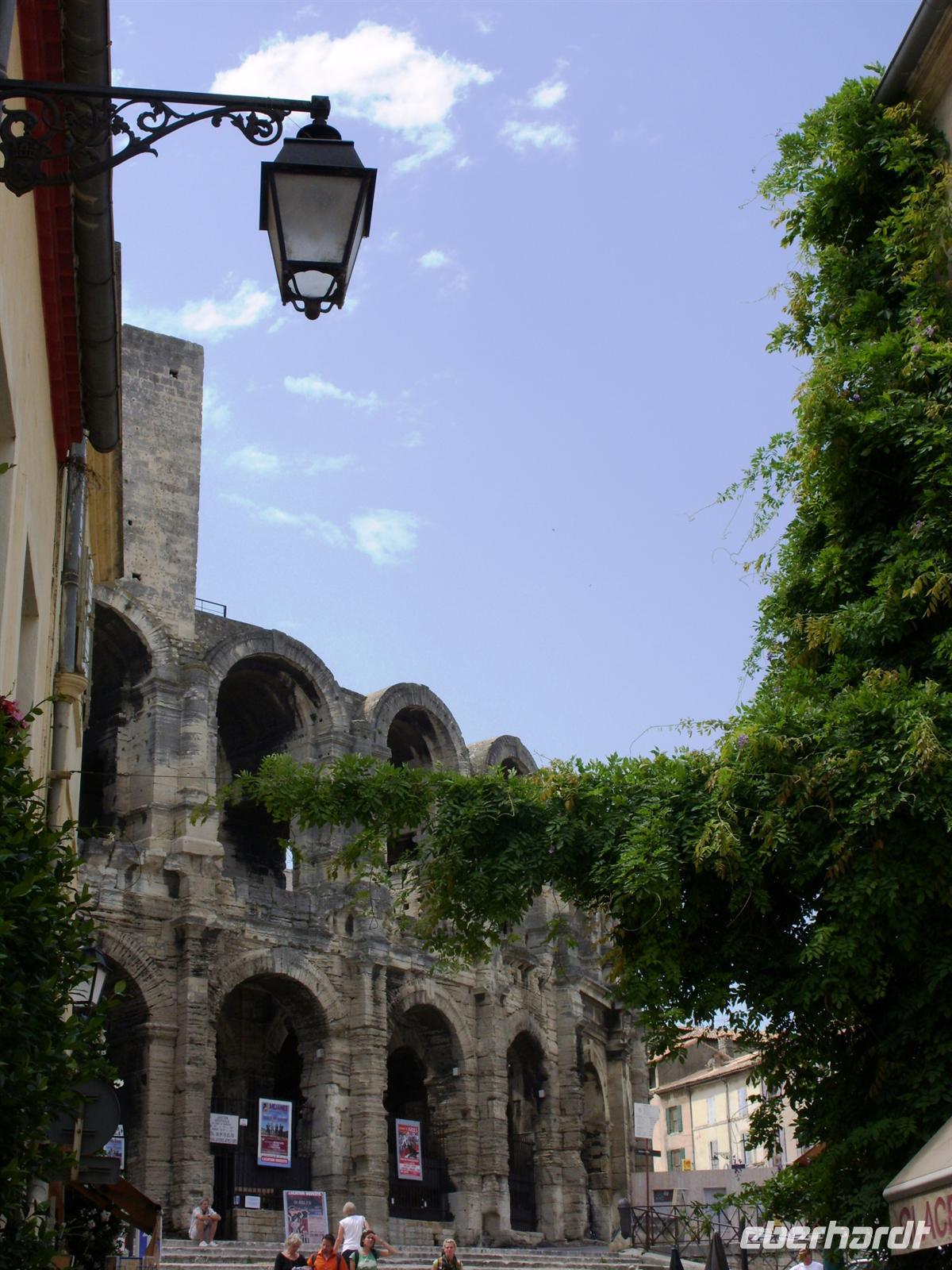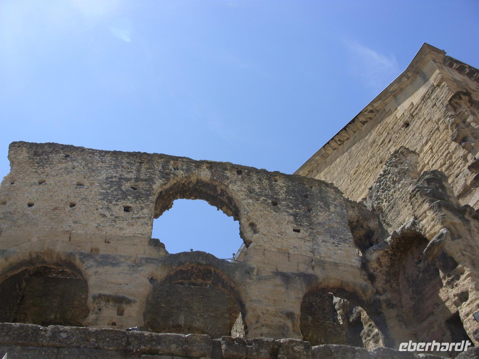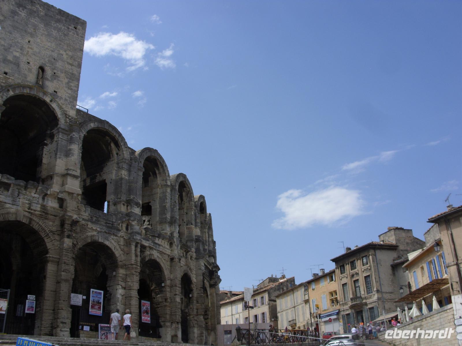 Konstantin und der Place du Forum. Hier soll sich zu römischen Zeiten, als Arles in seiner Blüte stand, das Forum Romanum befunden haben. Heute ist der Platz vielmehr durch seine zahlreichen Lokale, u.a. dem berühmten Café de la Nuit von Vincent van Gogh, und der Statue von Frédéric Mistral bekannt. Weiter ging es am Musée Arlaten, dem Heimatmuseum, vorbei zum Rathausplatz. Hier heiß uns nicht nur das Hôtel de ville sondern auch die Kathedrale St-Trophime willkommen. Diese weist ein sehr schönes romanisches Portal auf, welches als das schönste der gesamten Provence gilt und eher an einen Triumphbogen erinnert. Nach einer kurzen Pause näherten wir uns anschließend dem Höhepunkt aller römischen Baureste in Arles - zunächst dem antiken Theater und gleich daneben dem Amphitheater. Trotz der Restaurationsarbeiten verkörpern beide Bauten den einstigen Reichtum der Stadt und erinnern an lebhafte Zeiten.