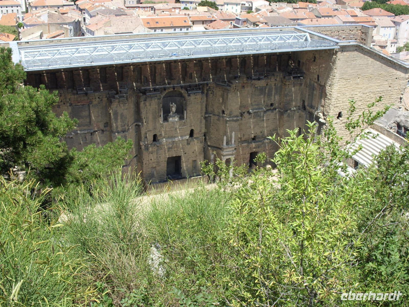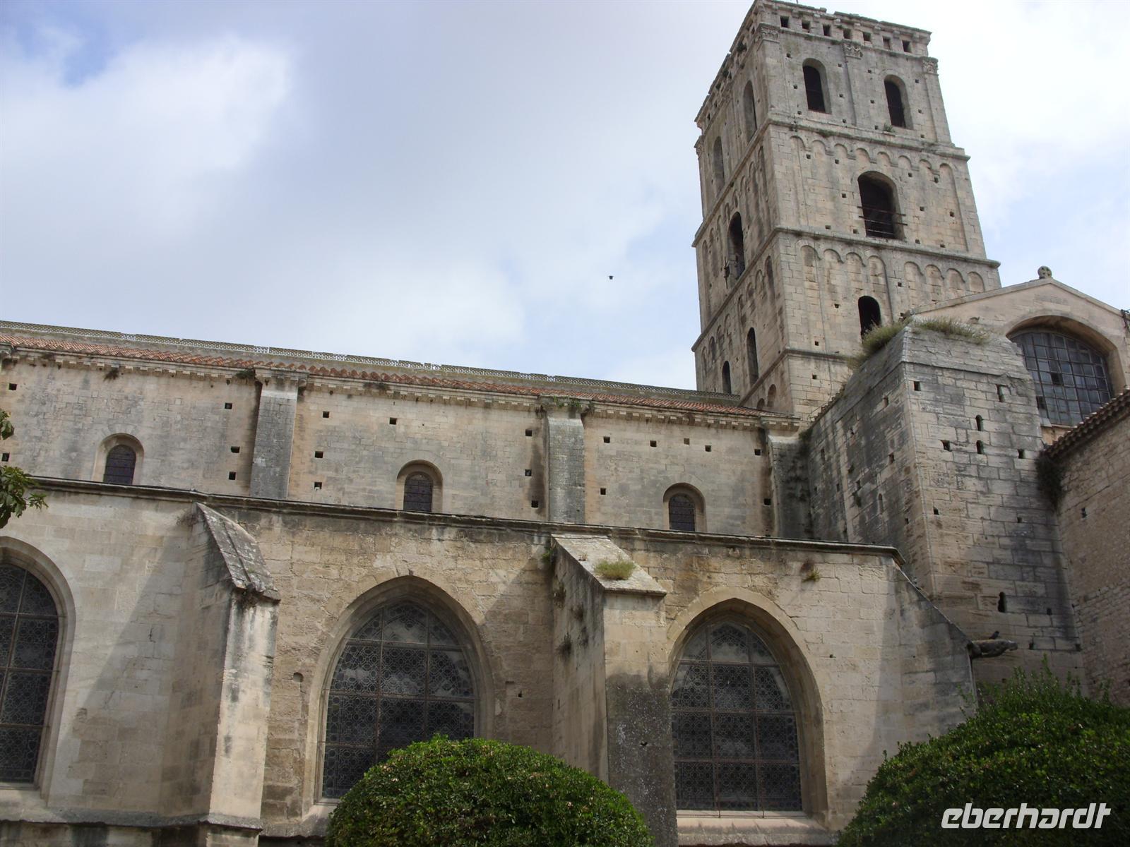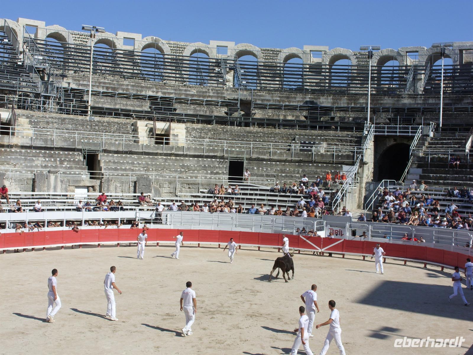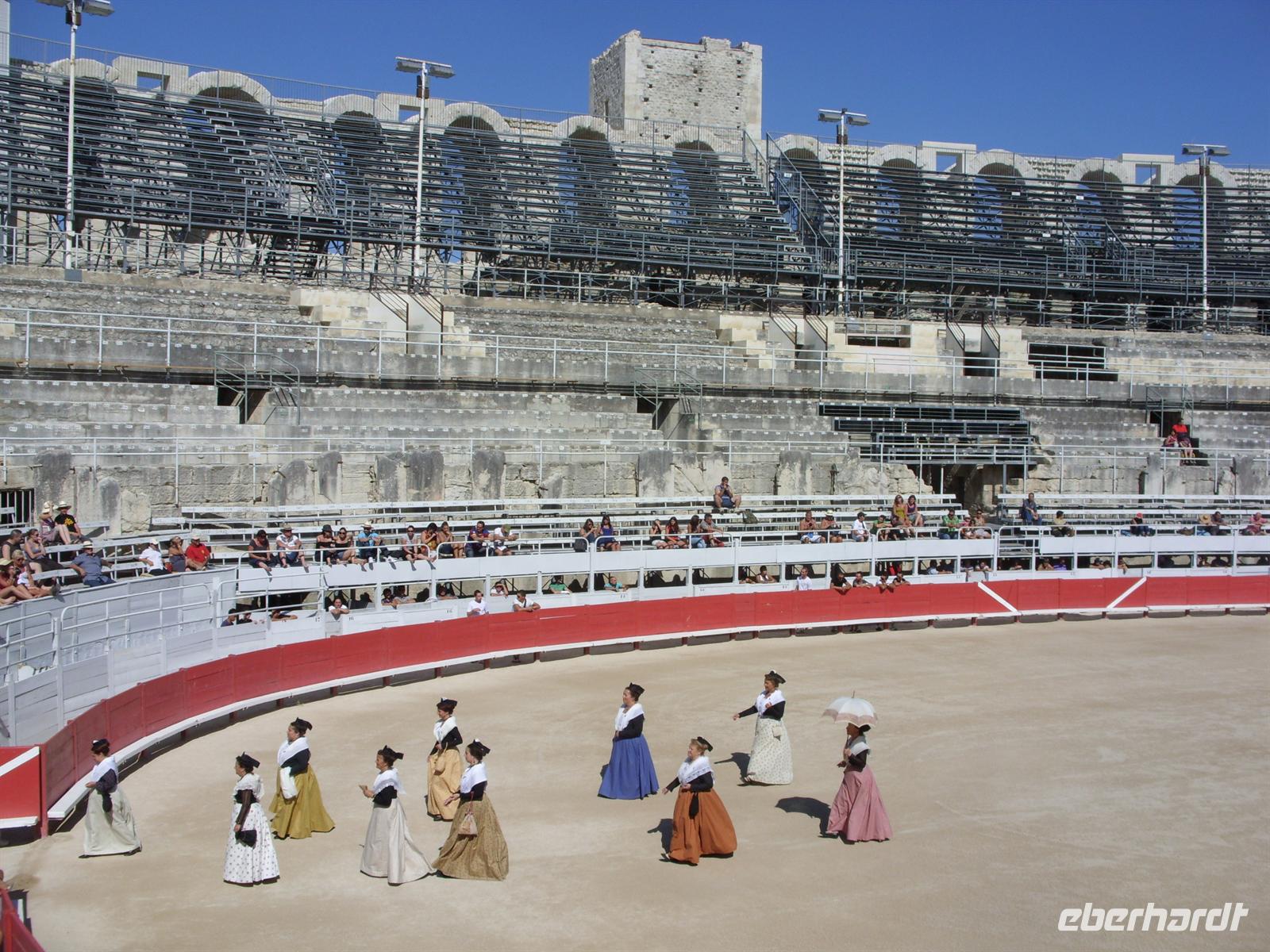 Konstantin und der Place du Forum. Hier soll sich zu römischen Zeiten, als Arles in seiner Blüte stand, das Forum Romanum befunden haben. Heute ist der Platz vielmehr durch seine zahlreichen Lokale, u.a. dem berühmten Café de la Nuit von Vincent van Gogh, und der Statue von Frédéric Mistral bekannt. Weiter ging es am Musée Arlaten, dem Heimatmuseum, vorbei zum Rathausplatz. Hier heiß uns nicht nur das Hôtel de ville sondern auch die Kathedrale St-Trophime willkommen. Diese weist ein sehr schönes romanisches Portal auf, welches als das schönste der gesamten Provence gilt und eher an einen Triumphbogen erinnert. Nach einer kurzen Pause näherten wir uns anschließend dem Höhepunkt aller römischen Baureste in Arles - zunächst dem antiken Theater und gleich daneben dem Amphitheater. Trotz der Restaurationsarbeiten verkörpern beide Bauten den einstigen Reichtum der Stadt und erinnern an lebhafte Zeiten.