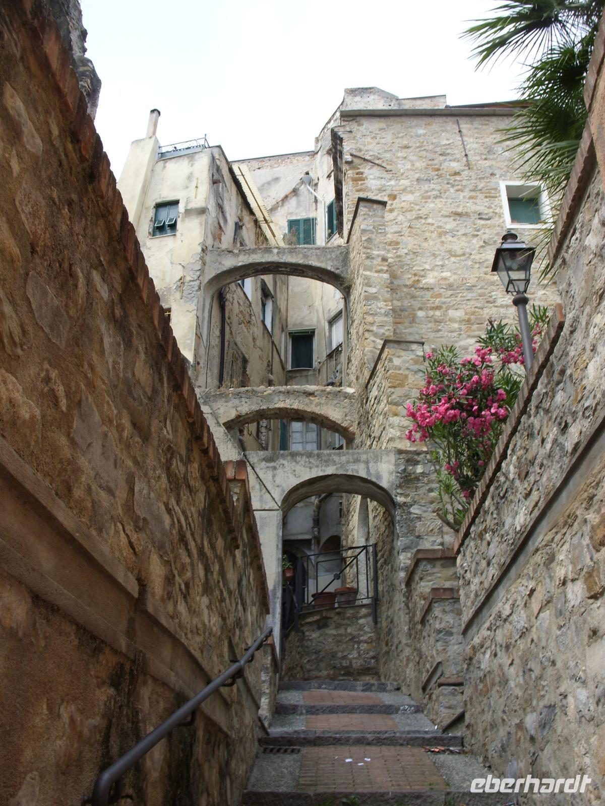 die Beine vertreten wollte, erklomm mit mir noch den Altstadthügel La Pigna (Tannenzapfen). Dabei durchwanderten wir enge schmale Gassen, schauten dunkle Gänge hinauf und wunderten uns über die zahlreichen Bewohner dieses kleinen Städtchens in der Stadt. Von oben hatten wir schließlich eine wundervolle Aussicht über die Bucht von San Remo mit ihren zahlreichen Gewächshäusern und schwarzen Planen, um die Blumen der berühmten Blumenriviera heran zu züchten. Anschließend gab es für fast Jedermann noch ein gutes italienisches Eis … Hmmm!