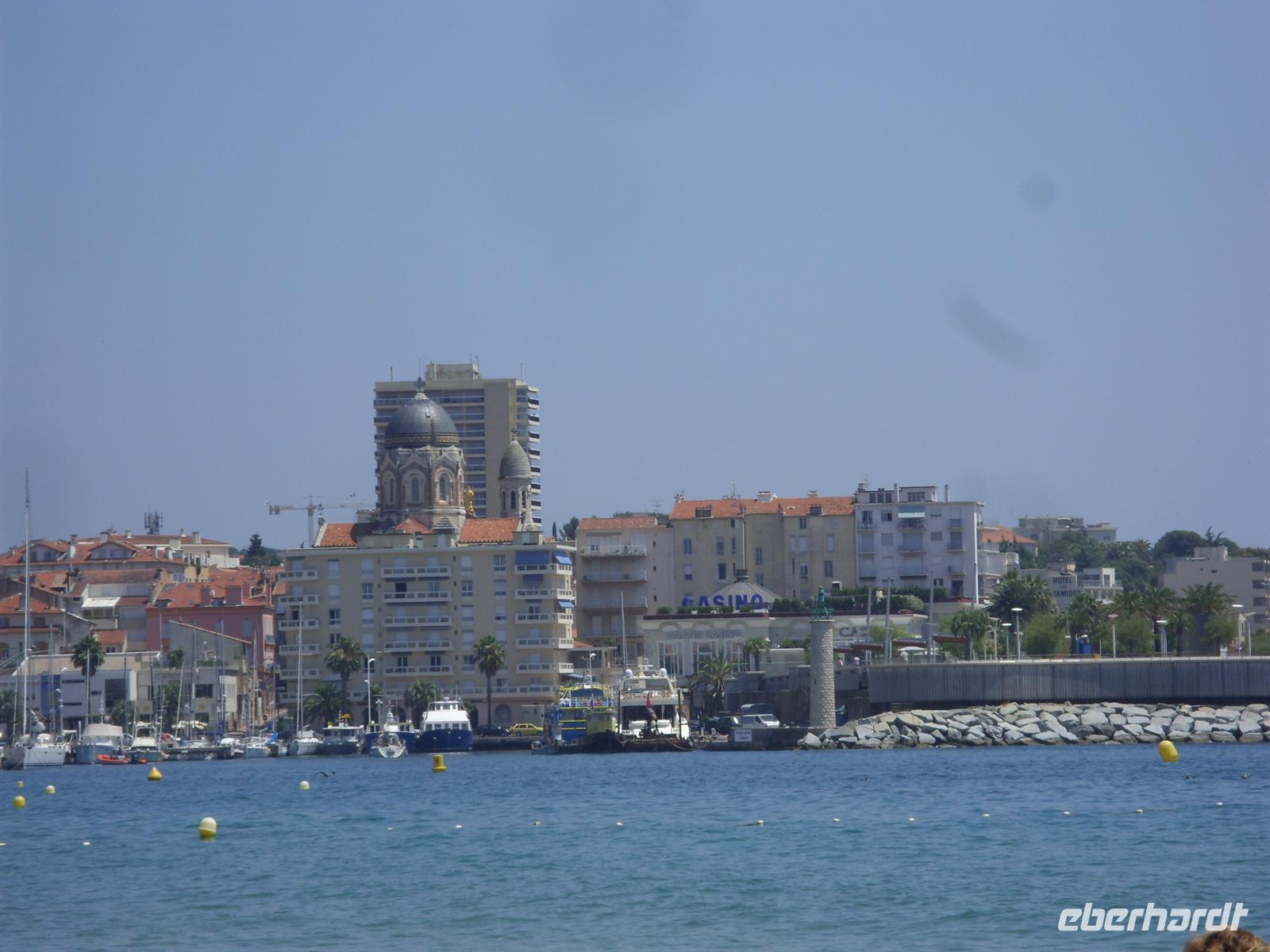Mittagsessen aus dem Bus genossen. Am Aussichtspunkt Pointe de l’Observatoire hatten wir tatsächlich einen herrlichen Blick auf die roten Berge; das blaue Meer, den glänzenden Himmel und dazu stand im Kontrast das dunkle Grün der Büsche und Bäume. Traumhaft! Nach unserem kleinen Stopp fuhren wir weiter nach Saint-Raphael und Fréjus. Hier entließ uns Roy, unser Bus-Chauffeur, in die Hitze hinaus - einige von uns nutzten sofort die Möglichkeit in die kühlen Fluten des Mittelmeers zu springen, wieder andere bummelten die Strandpromenade entlang und zogen sich in den Schatten zurück.