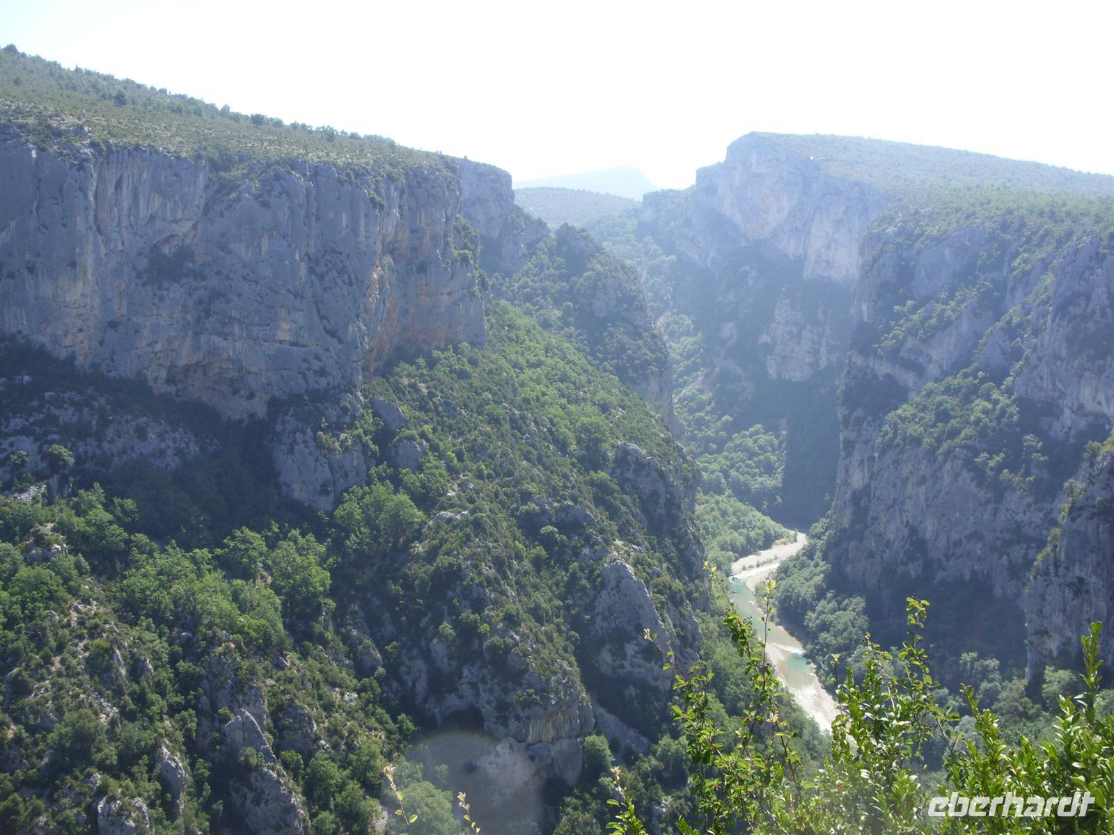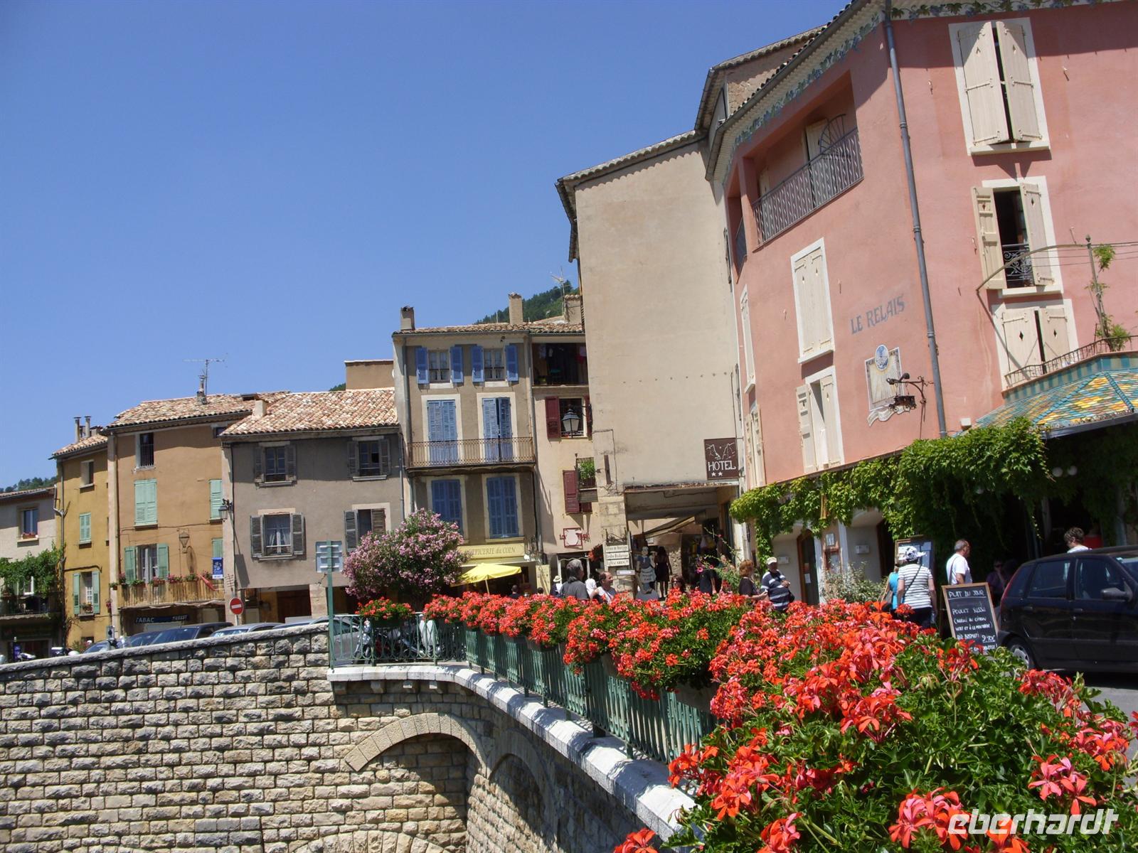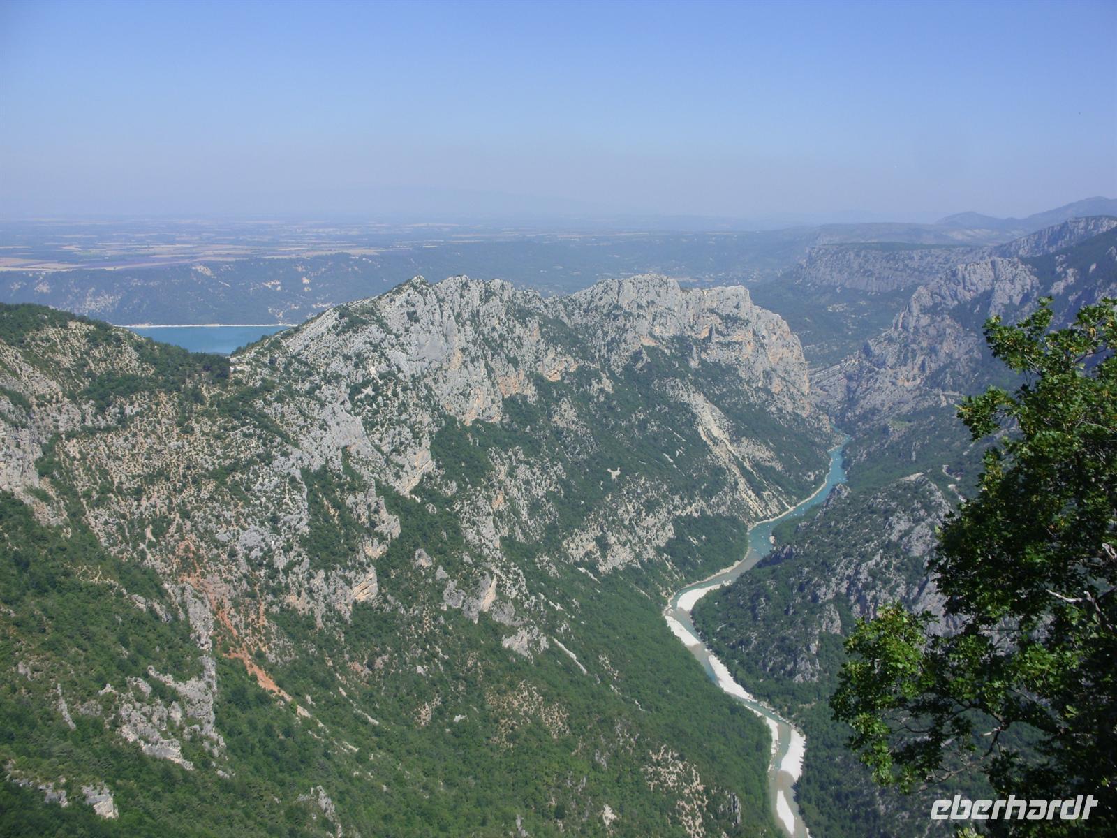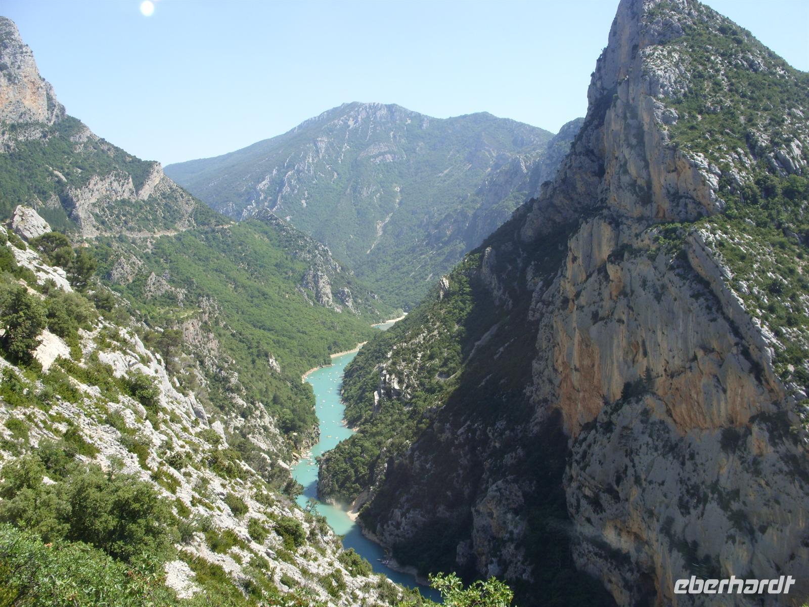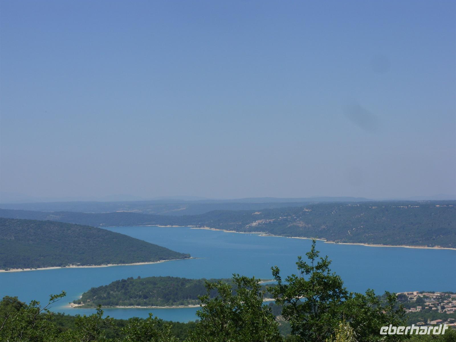 Hochprovence. Es erwartete uns zunächst eine kurvenreiche Strecke gen Grasse und danach weiter gen Norden. Unsere Strecke führte uns entlang der berühmten Route Napoléon, einer im Jahr 1927 erbauten touristischen Panoramastraße, die dem Gewaltmarsch Napoleons von 1815 nachempfunden worden ist. Er war damals in nur 7 Tagen vom Golf von Juan bei Antibes bis Grenoble über die Alpen marschiert. Doch diese gut ausgebaute Straße sollte nicht die einzige anspruchsvolle Fahrstrecke für unseren Roy sein. Nein, bei Comps-sur-Artuby begannen wir unseren Rundkurs um die Schluchten des Verdon-Flusses. Die Straße der Corniche Sublime führte uns oftmals direkt an den Rand des Flusses - atemberaubend fielen die Felsen fast 700 m in die Tiefe! Natürlich hielten wir hier und da an, um diese Naturschönheiten auf die Linse zu bekommen: erster Fotostopp am Balcon de Mescla (Zusammenfluss von Artuby und Verdon), zweiter Fotostopp Pont d’Artuby (mit Möglichkeit zum Bungeesprung!), dritter Fotostopp (Hotel Le Cavalier direkt gegenüber beliebter Kletterwand), vierter Fotostopp Cirque de Vaumale (erster Blick zum Stausee Ste-Croix) und schließlich Mittagsrast an einem herrlichen Picknickplatz nach dem Örtchen Aiguines. Was für einen Ausblick genossen wir hier! Passend reichten wir dazu frische Melone und typisch provenzalische Tapenade auf Baguette. Hmmm, das war Urlaub!