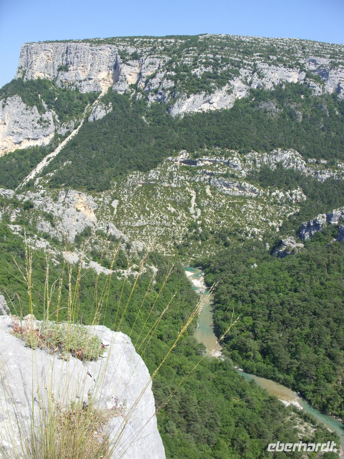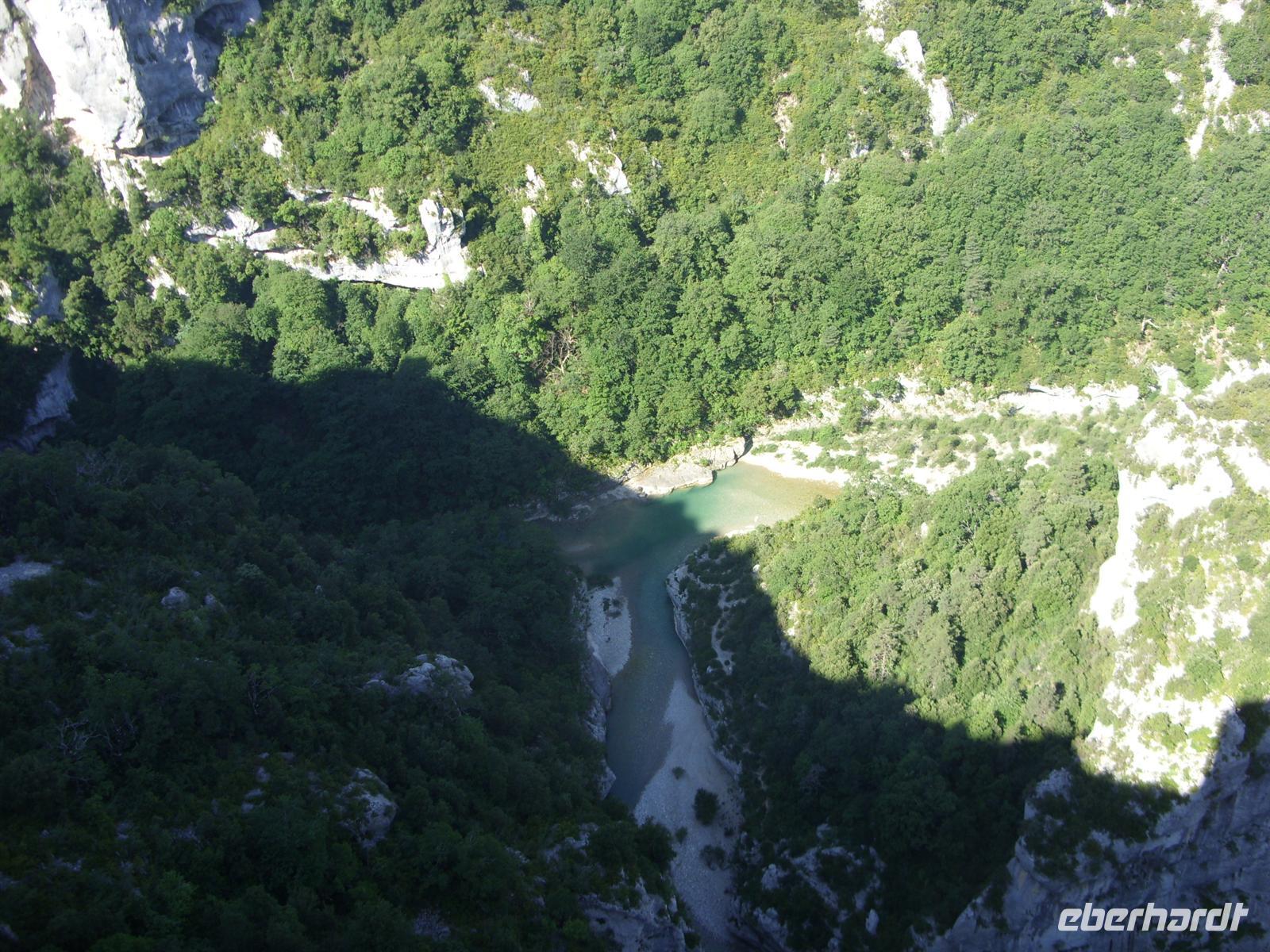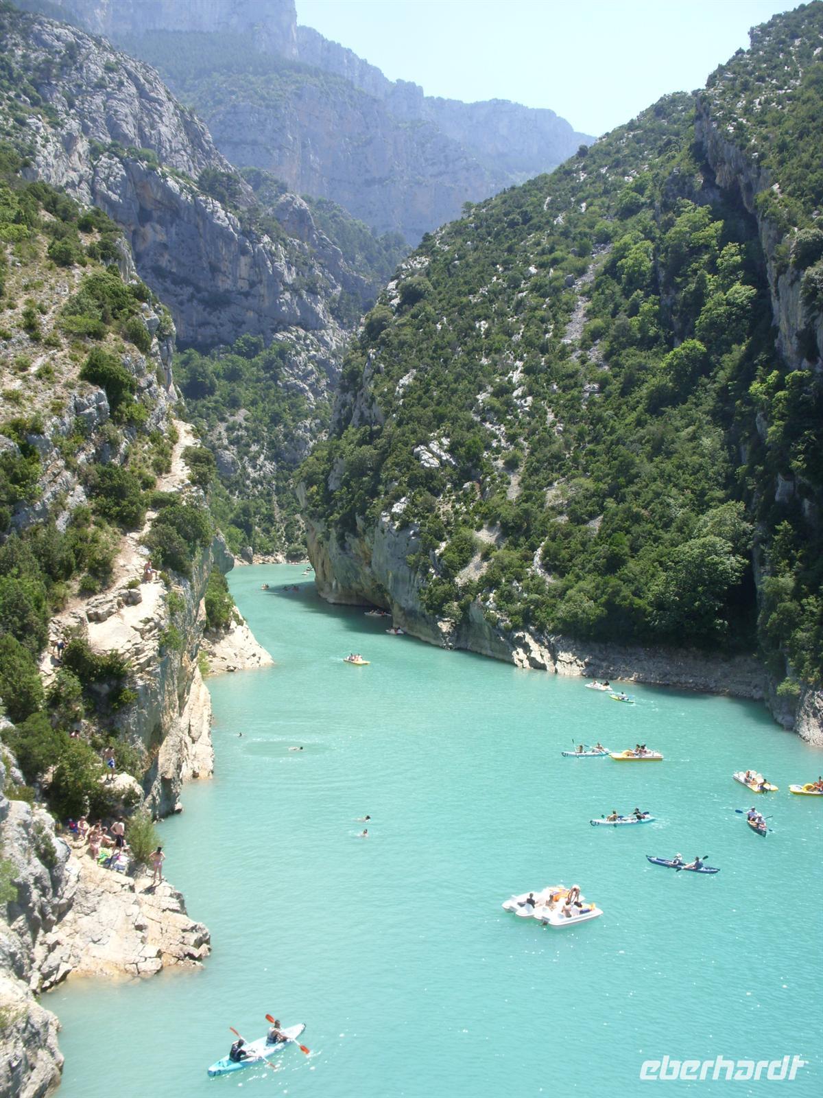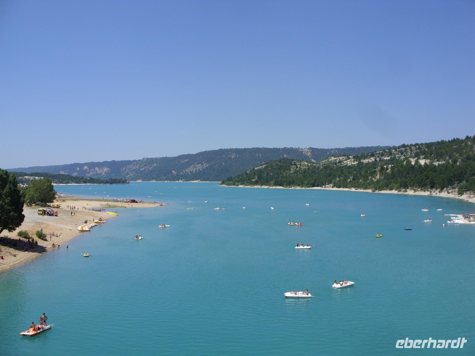Hochprovence. Es erwartete uns zunächst eine kurvenreiche Strecke gen Grasse und danach weiter gen Norden. Unsere Strecke führte uns entlang der berühmten Route Napoléon, einer im Jahr 1927 erbauten touristischen Panoramastraße, die dem Gewaltmarsch Napoleons von 1815 nachempfunden worden ist. Er war damals in nur 7 Tagen vom Golf von Juan bei Antibes bis Grenoble über die Alpen marschiert. Doch diese gut ausgebaute Straße sollte nicht die einzige anspruchsvolle Fahrstrecke für unseren Roy sein. Nein, bei Comps-sur-Artuby begannen wir unseren Rundkurs um die Schluchten des Verdon-Flusses. Die Straße der Corniche Sublime führte uns oftmals direkt an den Rand des Flusses - atemberaubend fielen die Felsen fast 700 m in die Tiefe! Natürlich hielten wir hier und da an, um diese Naturschönheiten auf die Linse zu bekommen: erster Fotostopp am Balcon de Mescla (Zusammenfluss von Artuby und Verdon), zweiter Fotostopp Pont d’Artuby (mit Möglichkeit zum Bungeesprung!), dritter Fotostopp (Hotel Le Cavalier direkt gegenüber beliebter Kletterwand), vierter Fotostopp Cirque de Vaumale (erster Blick zum Stausee Ste-Croix) und schließlich Mittagsrast an einem herrlichen Picknickplatz nach dem Örtchen Aiguines. Was für einen Ausblick genossen wir hier! Passend reichten wir dazu frische Melone und typisch provenzalische Tapenade auf Baguette. Hmmm, das war Urlaub!