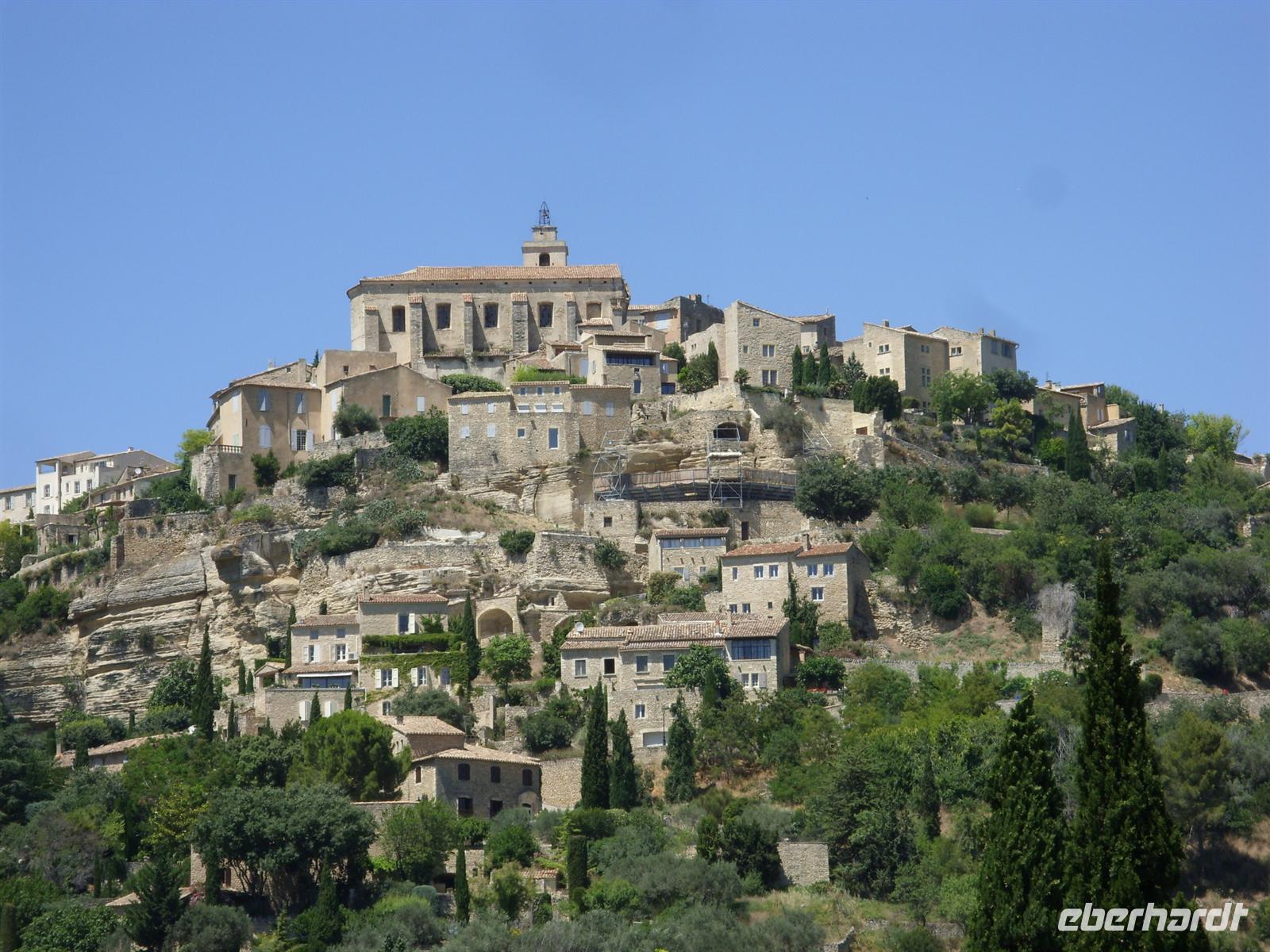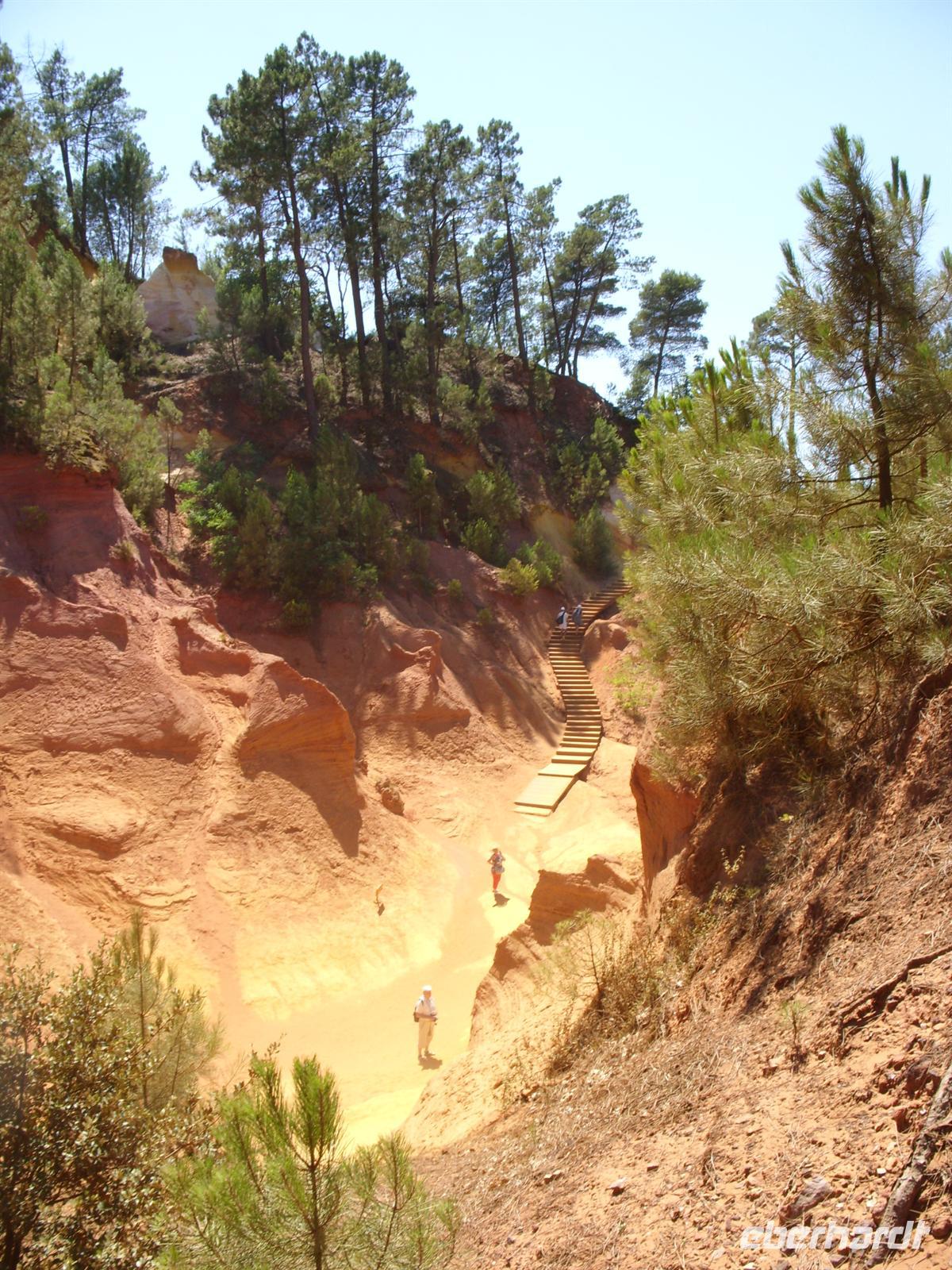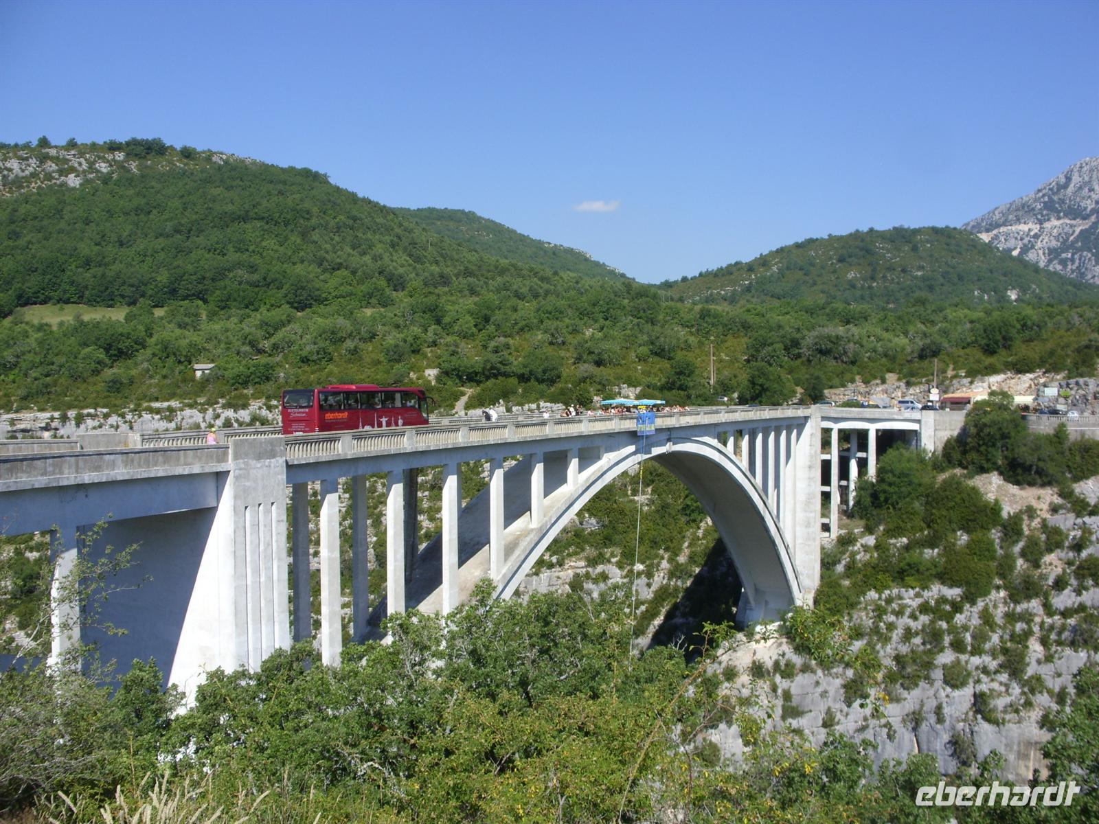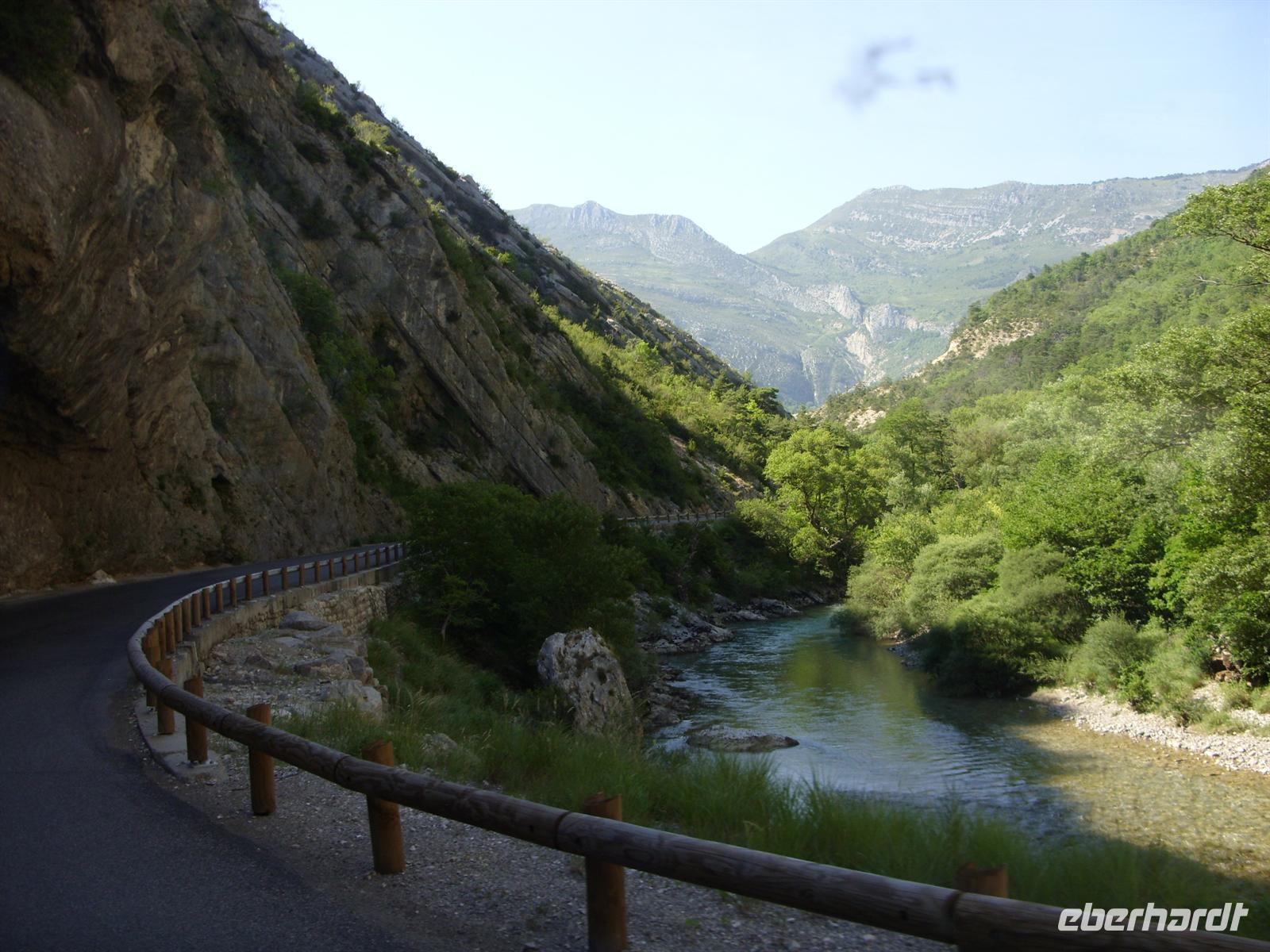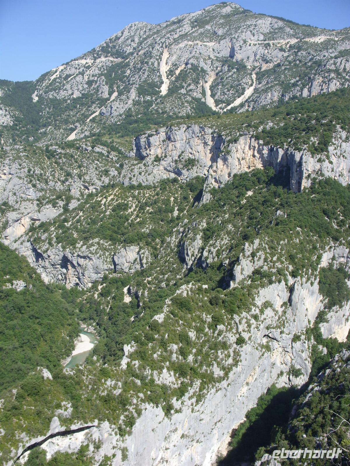 Hochprovence. Es erwartete uns zunächst eine kurvenreiche Strecke gen Grasse und danach weiter gen Norden. Unsere Strecke führte uns entlang der berühmten Route Napoléon, einer im Jahr 1927 erbauten touristischen Panoramastraße, die dem Gewaltmarsch Napoleons von 1815 nachempfunden worden ist. Er war damals in nur 7 Tagen vom Golf von Juan bei Antibes bis Grenoble über die Alpen marschiert. Doch diese gut ausgebaute Straße sollte nicht die einzige anspruchsvolle Fahrstrecke für unseren Roy sein. Nein, bei Comps-sur-Artuby begannen wir unseren Rundkurs um die Schluchten des Verdon-Flusses. Die Straße der Corniche Sublime führte uns oftmals direkt an den Rand des Flusses - atemberaubend fielen die Felsen fast 700 m in die Tiefe! Natürlich hielten wir hier und da an, um diese Naturschönheiten auf die Linse zu bekommen: erster Fotostopp am Balcon de Mescla (Zusammenfluss von Artuby und Verdon), zweiter Fotostopp Pont d’Artuby (mit Möglichkeit zum Bungeesprung!), dritter Fotostopp (Hotel Le Cavalier direkt gegenüber beliebter Kletterwand), vierter Fotostopp Cirque de Vaumale (erster Blick zum Stausee Ste-Croix) und schließlich Mittagsrast an einem herrlichen Picknickplatz nach dem Örtchen Aiguines. Was für einen Ausblick genossen wir hier! Passend reichten wir dazu frische Melone und typisch provenzalische Tapenade auf Baguette. Hmmm, das war Urlaub!