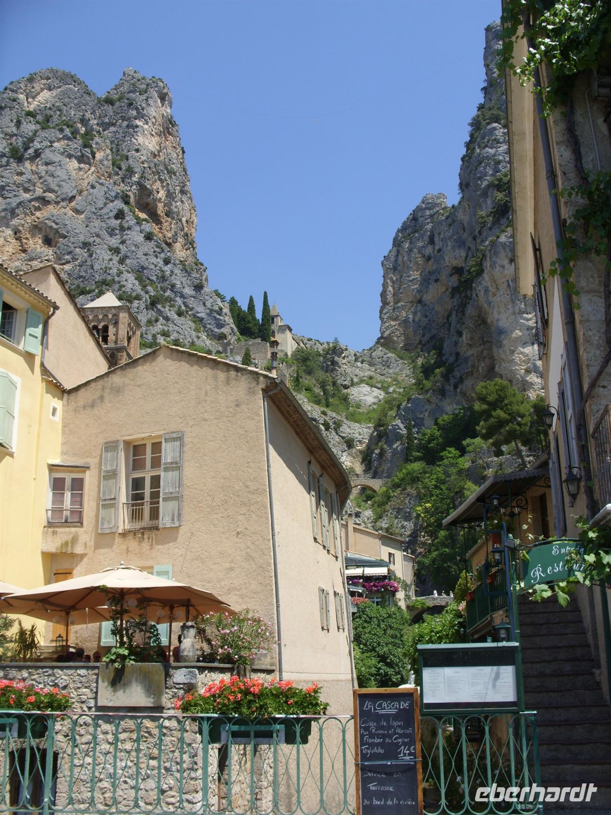 zurück nach Moustiers-Ste-Marie, wo uns in gleißender Nachmittagshitze ein ordentlicher Anstieg erwartete. Lohnenswert war aber auch wieder dieses Örtchen mit seinen engen Gassen, dem Flüsschen mittendurch, der Kirche Notre-Dame de l’Assomption und den vielen kleinen Läden.
