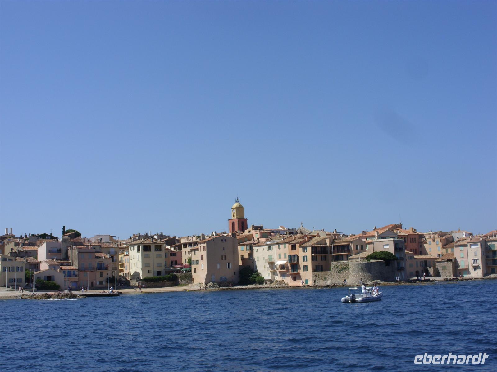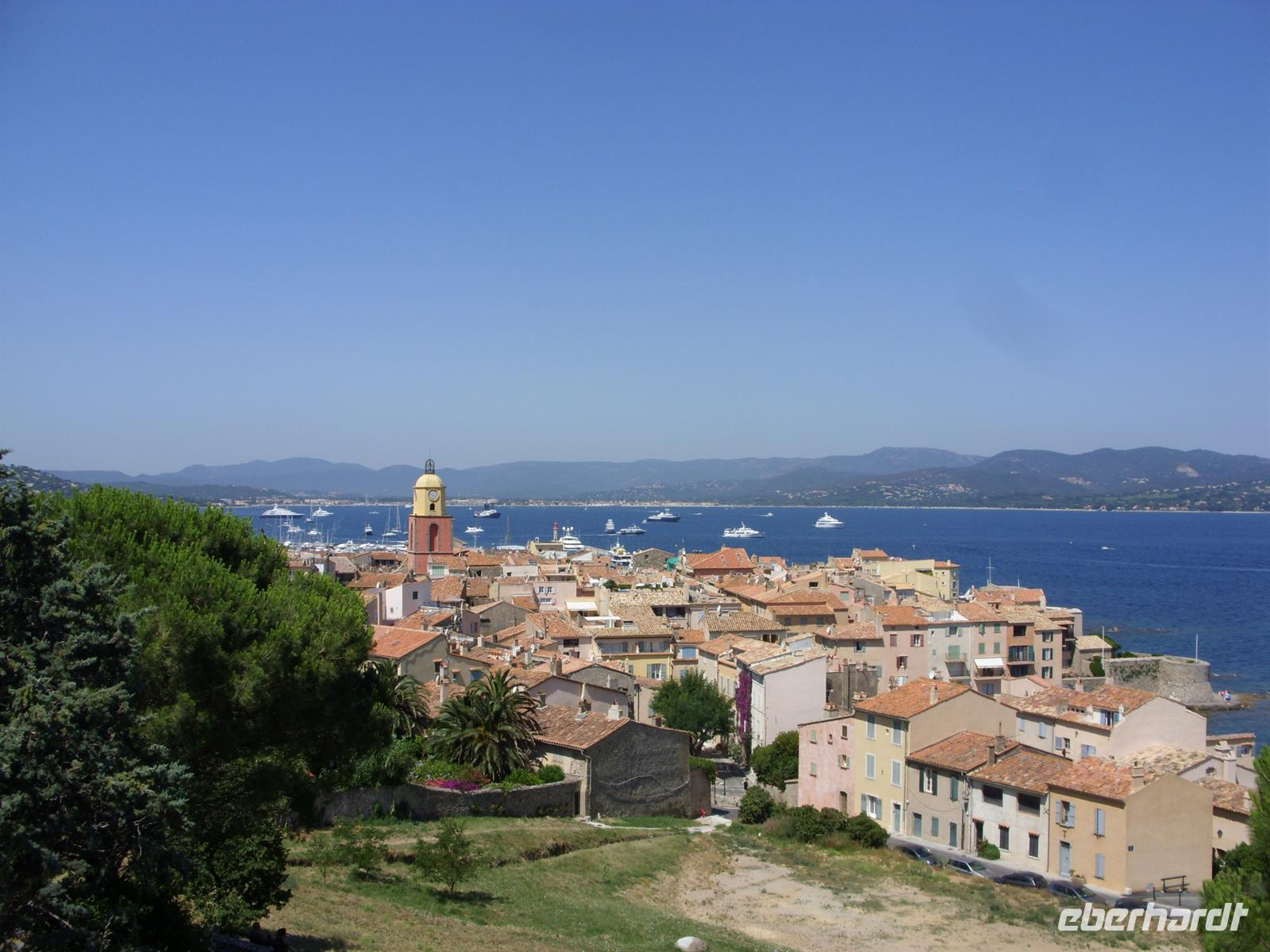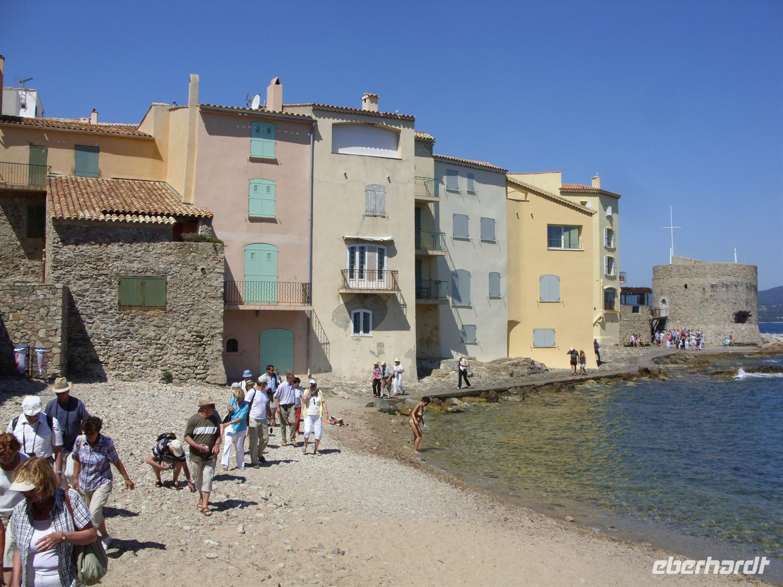 Heute hieß es Kofferpacken, da wir am Abend ja in Arles ein neues Hotel beziehen sollten. Anschließend fuhren wir durch das sogenannte Maurenmassiv zur Küste bei Ste-Maxime. Dieses Gebirgsmassiv trägt übrigens diesen interessanten Namen nach den dunklen Wäldern, mit denen es über und über bewachsen ist (provenzalisch mauoro = dunkel, schwarz). In Ste-Maxime konnten wir uns noch ein wenig die Beine vertreten und anschließend bestiegen wir das Boot um quer über den Golf von Saint-Tropez zu fahren. Das aber ja der direkte Weg langweilig gewesen wären, folgte das Boot der Bucht von Canoubière, in der sich eine Villa an die andere reihte. Entsprechende Erklärungen dazu lehrten uns, wer wo sein Zuhause besaß. Je näher wir dem Hafen von St-Tropez kamen, desto imposanter wurden auch die Yachten. Unvorstellbar, wie groß manche Exemplare waren! Wir legten dann auch alsbald im Hafen an und unternahmen von hier aus einen kleinen Spaziergang durch die Gassen des Fischerdörfchens - denn das war es im Winter tatsächlich immer noch (!) - hinauf zur Zitadelle. Vom Fuße der Festungsanlage genossen wir einen herrlichen Blick über die Bucht, das Maurenmassiv, die