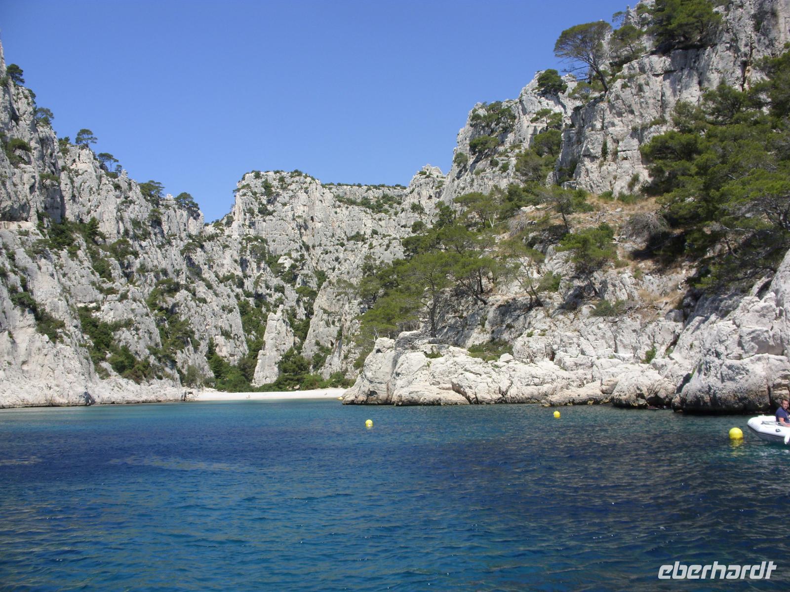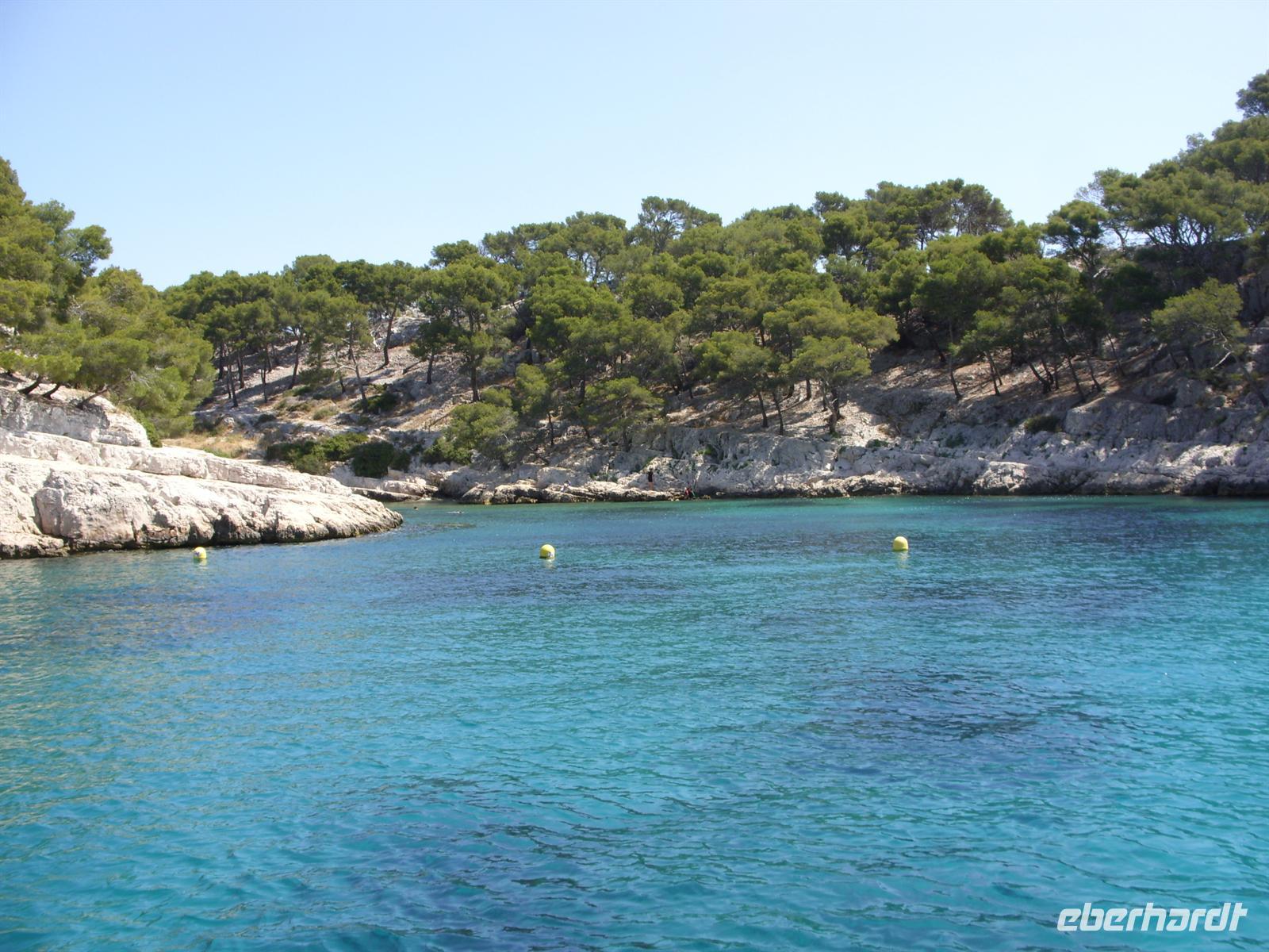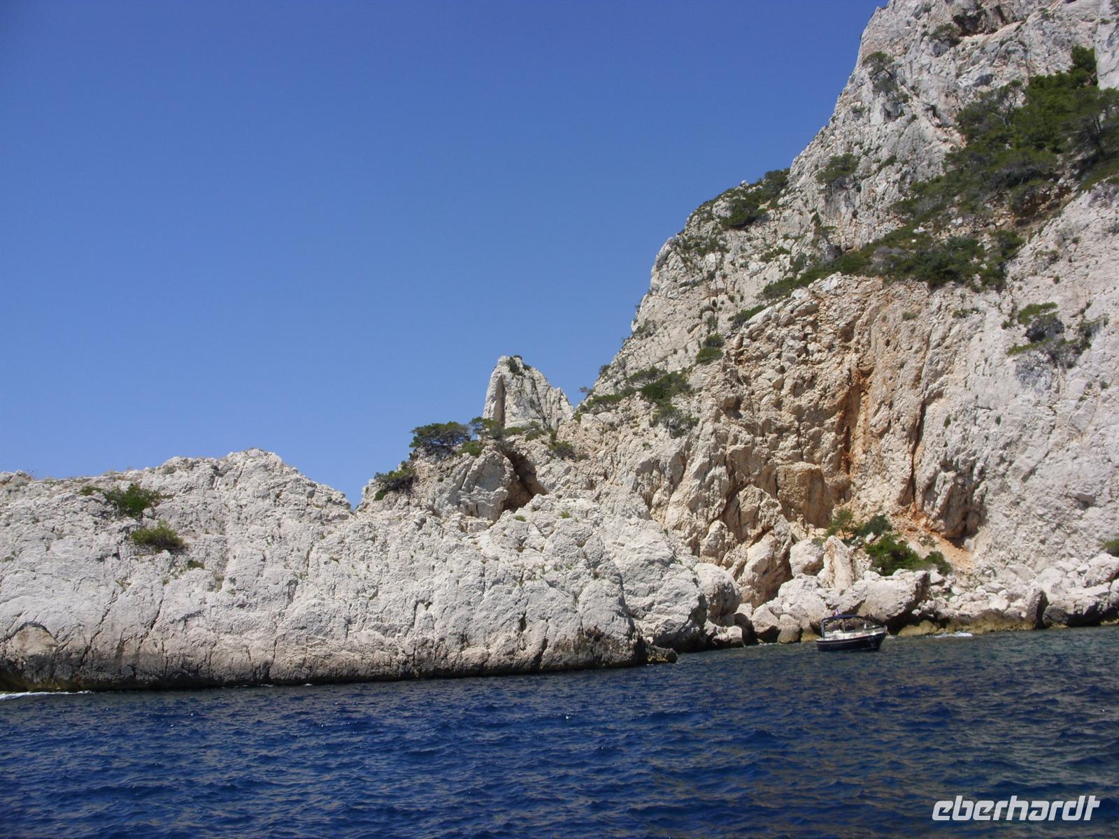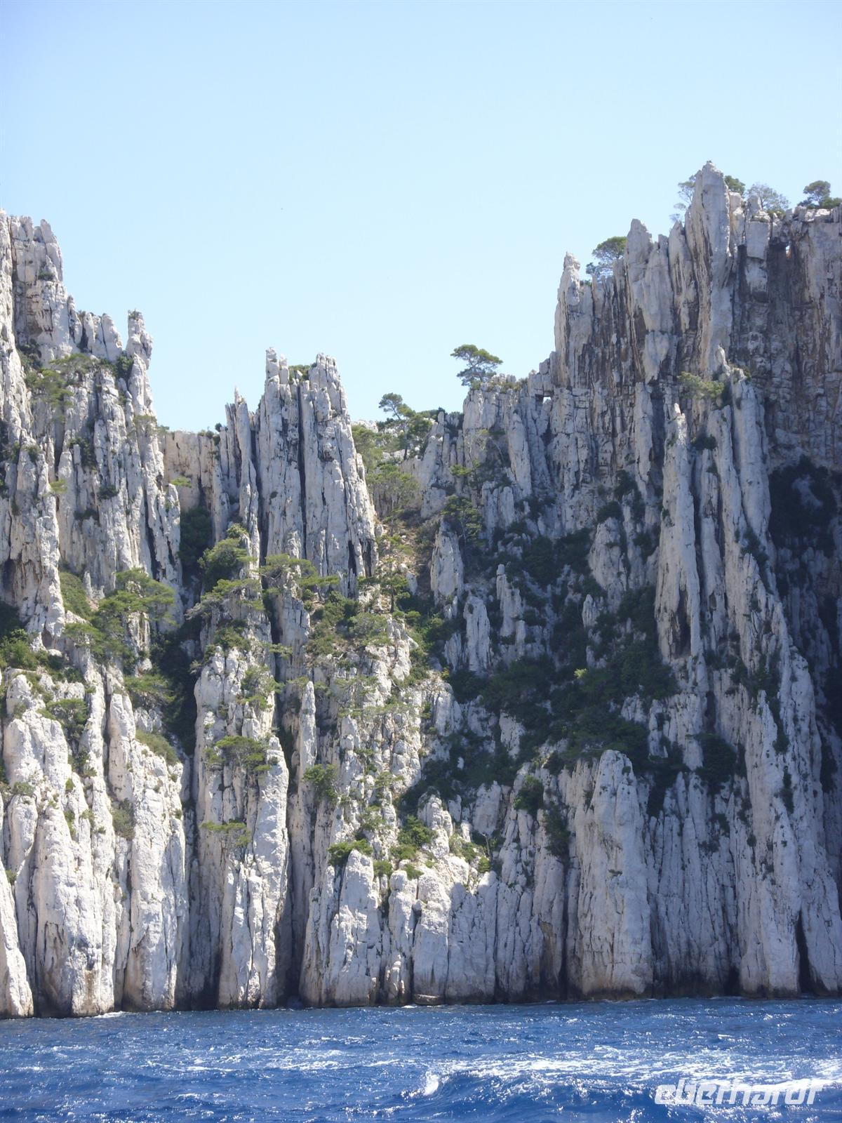 Bootsfahrt zu den Calanques. Calanques sind übrigens die fjordähnlichen Buchten in den leuchtend weißen Kalkfelsen. Besonders interessant ist dabei der Kontrast zwischen den hellen Felsen, dem wild wuchernden Bäumchen, dem türkisblauen Meerwasser und dem herrlich blauen Himmel. Und genauso wie hier beschrieben erlebten wir dann auch fünf der schönsten Calanques. Ein bisschen wellig war es zwar auch aber das belebte die ganze Fahrt nur umso mehr … wieder einmal ein lohnenswertes Ziel!