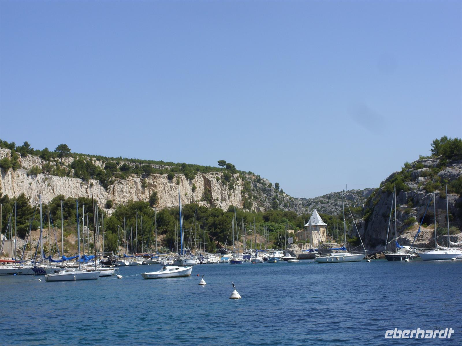 Heute stand ein erneuter Ausflug zur Küste auf dem Programm. Erstes Ziel war das wunderschön in einer warmen Bucht gelegene Cassis. Wie sagte schon einmal Frédéric Mistral: „Sahst du auch Paris, doch sahst du nicht Cassis, dann kannst du sagen Du sahst nichts.“ Voller Erwartungen nahmen wir also das kleine Bimmelbähnchen und fuhren zum Hafen hinunter. Hier bummelten wir zunächst einmal um das Hafenbecken herum und warteten gespannt auf die anstehende