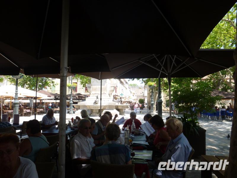 Heute verließen wir die Provence, den Ort Arles und machten uns auf den Rückweg. Wir besuchten die berühmte Pont-du-Gard. Dieses kolossale Bauwerk der Römer versorgte vor fast 2000 Jahren die Stadt Nîmes mit fließendem Wasser. Seine Größe, der gut erhaltene Zustand der drei Ebenen und die beeindruckenden Bögen machen den "Pont du Gard" zur höchsten antiken Brücke, die jemals erbaut wurde. Ihre Funktionalität ist großartig. Wir stehen vor einem Steinkoloss, der sich 50 m über den Fluss Gardon inmitten wunderschöner Natur erhebt und seit 1985 zum UNESCO-Weltkulturerbe gehört. Dann ging es nach Avignon und wir sahen uns die Stadt mit dem petit train an oder zu Fuss oder manche besuchten auch den berühmten ehemaligen Papstpalast innen. Die St.Bénézet Brücke und die Markthallen und vieles mehr entdeckten wir bei einem Stadtbummel je nach gusto. Zum Abschluss besichtigten wir noch den Stadtgründungsbogen in Orange, das antike Theater, das Örtchen selbst und machten uns dann endgültig auf die erste Rückreise-Etappe. Nach einem gelungenen Picknick, das am Tag zuvor sprichwörtlich ins Wasser gefallen war, reisten wir beschwingt durch das Burgund nach Chalon-sur-Saône. Dort aßen wir gleich zu Abend und ließen danach den letzten Abend in Frankreich bei schönsten Temperaturen und einem Drink und netten Gesprächen ausklingen.