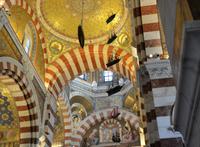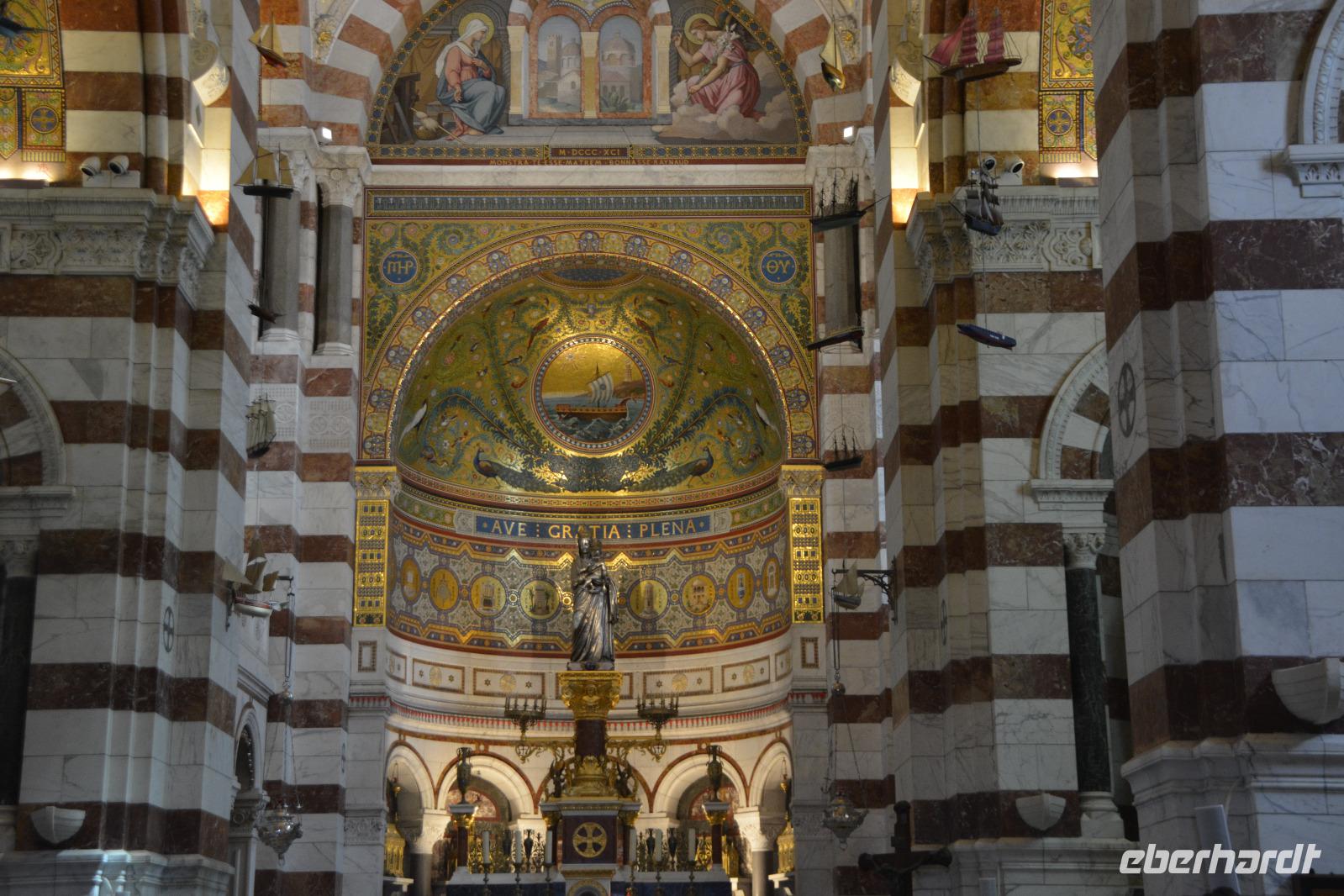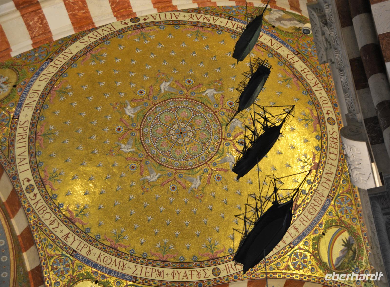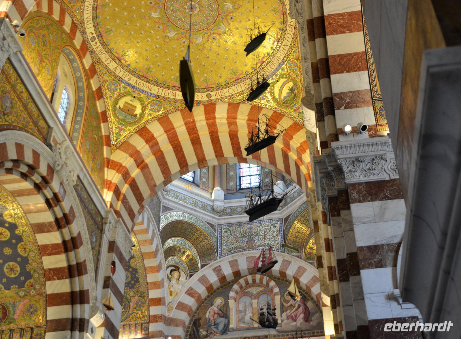 Heute steht ein Ausflug in das Örtchen Cassis und eine Bootsfahrt entlang der berühmten Kalkfelsen von "Calanques" auf dem Programm. Im Ort am Parkplatz besteigen wir einen extra für uns bestellten kleinen Zug ("Petit train") und werden zum Stadtzentrum gefahren. Noch ein wenig müssen wir zu Fuss zum Bootsanleger gehen und dann geht es los zu den Kalkfelsen. Der Kalk hier ist besonders weiss und sauber und wurde in der Vergangenheit als Baumaterial abgebaut. Am Rande der Buchten sind noch die alten Rampen zu sehen, von denen der Kalkstein auf die Schiffe befördert wurde. Heute ist die Gegend geschützt und die teilweise abgelegenen Buchten werden für das Sonnenbad (auch oben und unten ohne) genutzt. Es ist hier das Paradies für Wassersportler, für Kajak- und Kanufahrer oder einfach für Schwimmer. Wir genießen die Schiffsfahrt, ist es hier am Wasser doch ein wenig kühler als am Festland. Dort können wir noch ein wenig spazieren und dann bringt uns unser Bähnchen zurück zum Bus. Wir haben heute noch den Besuch der Hafenstadt Marseille vor uns, eine Stadt die so langsam aus ihrem Dornröschenschlaf erwacht. Die griechische Gründung der Stadt ist nicht mehr vordergründig zu spüren. Der erste Eindruck sind: "Einbahnstraßen", die unseren wirklich hartgesottenen Fahrer Ingo zur Verzweiflung zu bringen scheinen. Wie kommt man nur zur Touristeninformation? Dort haben wir die Verabredung mit der Stadtführerin Caroline. Aber nichts zu machen. Alle Navi-Möglichkeiten versagen! Wir halten an einer Möglichkeit in der Nähe und Caroline holt uns dort ab. Endlich können wir uns auf ander Dinge konzentrieren, z.B. auf die Festungsanlagen von Ludwig XIV. oder die vorgelagerte Ile d'If auf welcher der Film "Der Graf von Montechristo" mit Gerard Depardieu und Ornella Muti gedreht wurde. Im Jahr 2013 Kulturhauptstadt, wurde durch die Errichtung eines Nationalmuseums an der Uferlinie ihr Gesicht verändert. Über der Stadt grüßt seit Mitte des 19.Jahrhunderts "la bonne mère" (gute Mutter) die Kathedrale "Notre Dame de la Garde". Sie ist das weithin sichtbare Wahrzeichen von Marseille. Dorthin fahren wir um das neuromanisch-byzantinische Gotteshaus aus der Nähe anzuschauen. Im Inneren spürt man den Bezug zur Seefahrt und zum Meer. Beeindruckend die menschlichen Würdigungen und Glaubensbekundungen die das gelebte Leben und die Nöte der Menschen widerspiegeln. Nöte die in dieser multikulturellen Stadt auch in unserer Zeit existieren. Marseille eine Stadt die sich einem erst nach einer längeren Gewöhnungsphase erschließt. Mehrdeutig ist denn auch der Spiegel in dem man sich selber und die Stadt auf dem Kopf gestellt sieht. Mehrdeutig und soll vielleicht zum Nachdenken anregen? Steigt uns die Hitze schon in den Kopf? - da hilft ein Eis oder eine kühle Cola -----oder der Pool in unserem Hotel.