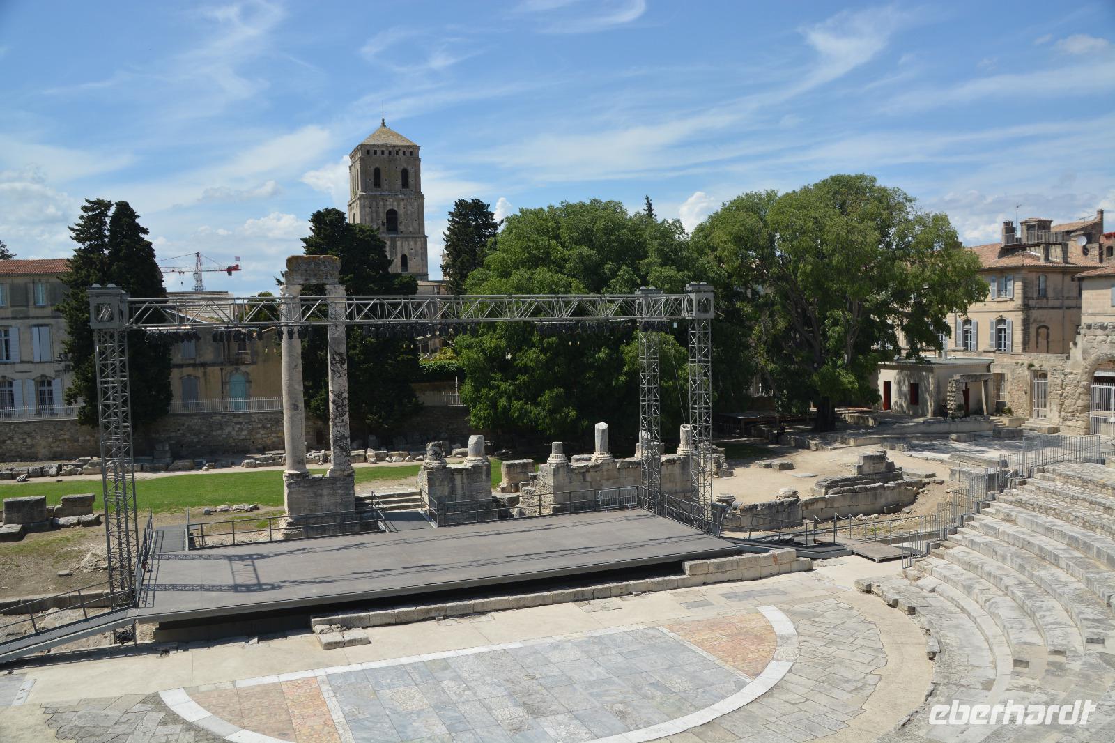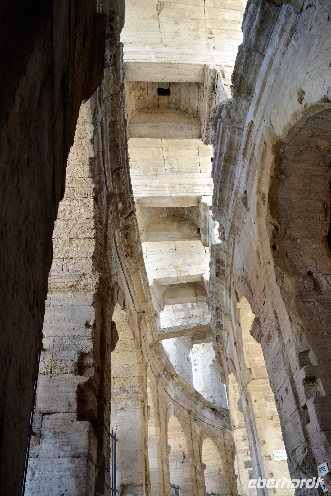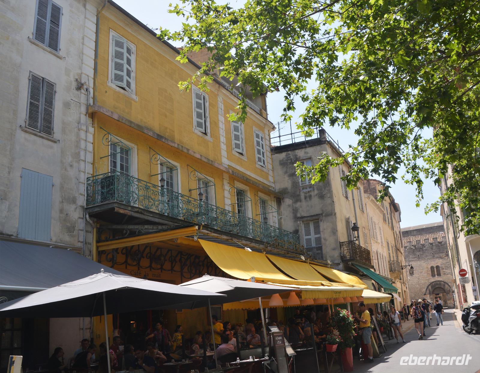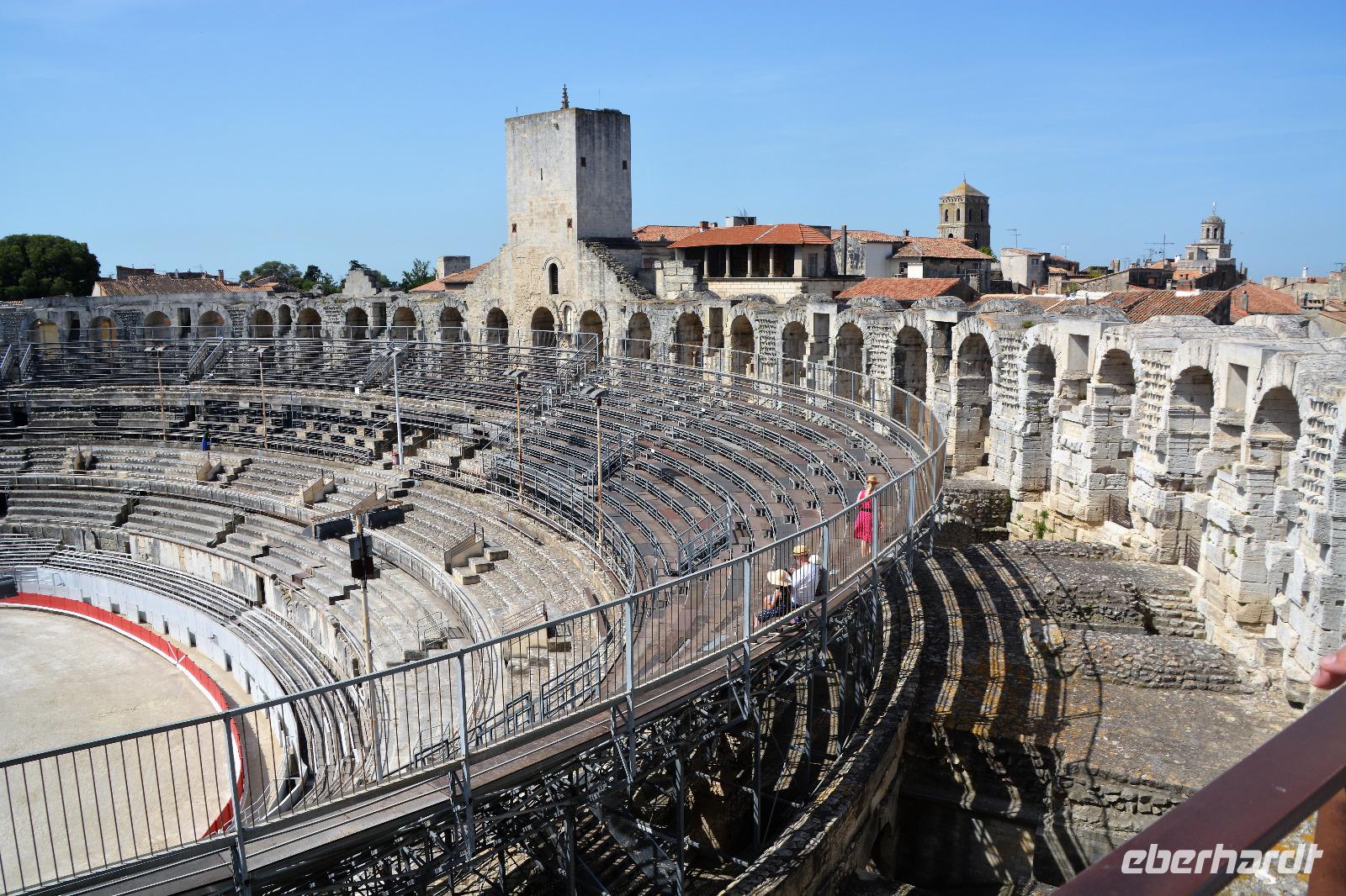 Nach einem wirklich üppigem Frühstück in diesem netten französischen Hotel, machen wir uns heute zu Fuß auf den Weg in die Stadt. Ingo unser Fahrer darf sich heute ein wenig erholen, hat er uns doch in den letzten Tagen zuverlässig durch die teilweise engen und kurvigen Straßen gefahren. Bis Mittag gehen wir mit unserer Reiseleiterin Gina, die uns vorsichtshalber eine Karte von Arles ausgehändigt hat, zusammen durch die Stadt. Am Nachmittag können wir uns dann selber auf den Weg machen um noch das eine oder andere zu entdecken. Wir überqueren "unsere" Brücke die "Pont de Trinquetaille" die uns direkt in die Altstadt führt. Nach einigen Gässchen stehen wir am "Place du Forum". Hier war der Versammlungsplatz der römischen Stadt "Arelas". Bekannt wurde dieser Platz auch durch die Werke des Malers Van Gogh, der hier einige Zeit verbrachte. Er verewigte das Café am Platz in seinem Werk "Caféterasse am Abend". Für später am Tag ist dieses Plätzchen wirklich ein wunderschöner Ort. Wir laufen weiter bis zum Hintereingang des "Hotel de Ville". Wir durchqueren diesen im Inneren schön gestalteten Bau und kommen auf der anderen Seite am "Place de la Republic" an. Hier in der Mitte steht ein Obelisk und ein Musikant erfreut die Umherstehenden mit klassischen französischen Liedern. Wir sehen die "Kathedrale St.Trophime", ein romanischer Bau mit einer beeindruckenden Fassade. Wir betrachten die Kathedrale von innen und ebenso den beeindruckenden Kreuzgang. Danach spazieren wir erst zum römischen Theater, welches in der Geschichte auch als Steinbruch benutzt wurde und erfahren von unserer Reiseleiterin Gina etwas über das Leben der Römer und ihre Vergnügungen. Die Gladiatorenkämpfe fanden aber nicht in dem nach griechischem Vorbild erbauten Theater sondern in dem etwas weiter gelegenen Amphitheater statt. Es ist eines der am besten erhaltenen Amphitheater Frankreichs. Und so entschliessen sich die meisten der Gruppe zu einem Besuch. Hier finden auch heute noch Veranstaltungen statt, allerdings keine Gladiatorenkämpfe mehr. Von den oberen Reihen haben wir einen wunderbaren Ausblick auf die Stadt. Hier endet jetzt unsere geführte Tour und alle begeben sich auf eigene Erkundungen. Einige folgen dem Rat, sich "Alyscamps" anzuschauen, denn die Temperaturen sind sehr hoch und jeder sucht den Schatten. Hier in dieser über mehrere hundert Jahre existierenden Nekropole können wir unter Bäumen wandeln und ein wenig der vergangenen Zeit nachspüren. Andere wieder lassen sich im Café Van Gogh nieder und geniessen das geschäftige Treiben. Am Abend treffen wir uns in unserem Hotel und genießen ein köstliches Abendessen. Unsere französischen Gastgeber sind bemüht und aufmerksam und voll der Eindrücke beenden wir diesen Tag in Arles.